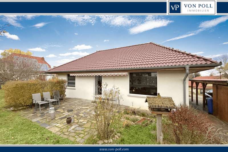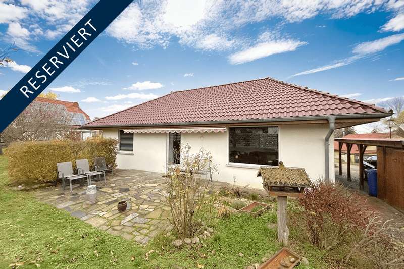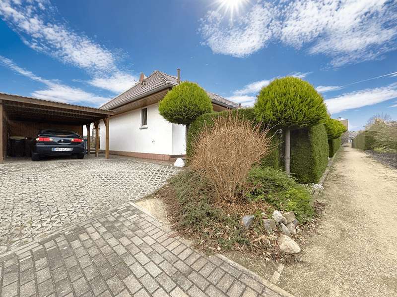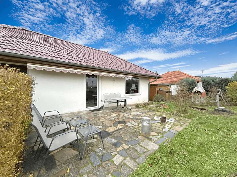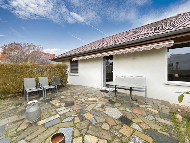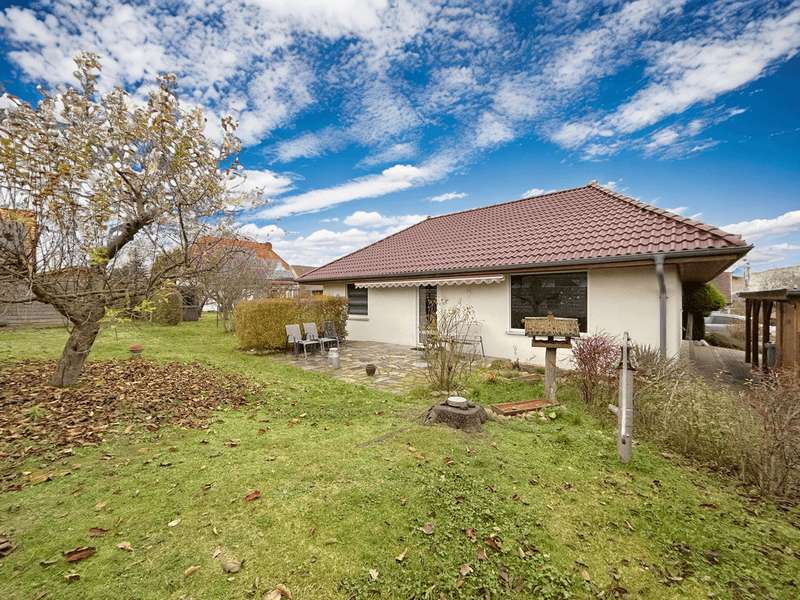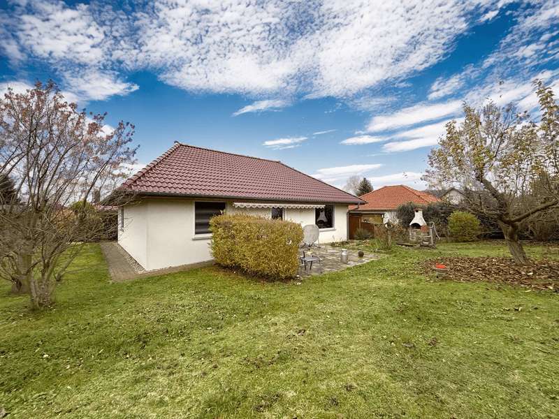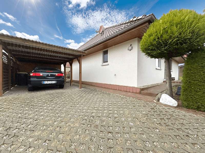 This residential bungalow was built in 2002 and is characterized by its fantastic location in a family-friendly residential area. The house offers a total of three rooms spread over a living space of around 97 m². The rooms include two well-designed bedrooms and a spacious living room that impresses with its brightness. A unique combination of carpeting and tiles as well as a large display window make the living room special. The central fitted kitchen is functionally designed and offers ample work space for preparing meals. The room is large enough for a separate dining area. The bathroom is equipped with both a bathtub and a separate shower. The space is complemented by a utility room with connections for a washing machine and dryer. Furthermore, roller shutters are fitted throughout the house, providing additional protection and comfort. Heating is provided by an efficient gas condensing boiler from the year the house was built, which ensures pleasant warmth in all rooms. The energy efficiency class of the property is D, which corresponds to an average energy consumption. One of the many attractive aspects of this property is the spacious terrace, which can be protected from strong sunlight by an awning. It is ideal for socializing outdoors. The well-tended garden covers an area of approx. 250 m² and offers plenty of space for individual design and relaxation. The plot covers an area of approx. 528 m². Practical additions such as a carport with storage room and the paved driveway provide additional functionality. The roof of the house was cleaned and painted in 2018. The property also has a well that efficiently supports the garden irrigation. Despite the numerous positive aspects, it should be noted that there is mold on the exterior walls in the bedrooms. This point should be considered during a possible viewing and could possibly require further measures. The cause is not known to the owners. Note: If you have filled in your contact details completely, the exposé will be sent fully automatically. Please contact us for further information and a viewing appointment.