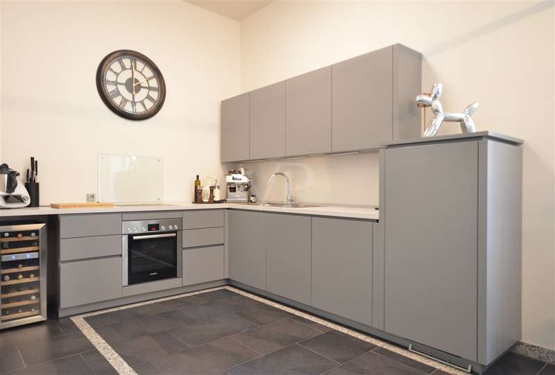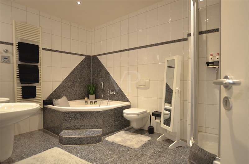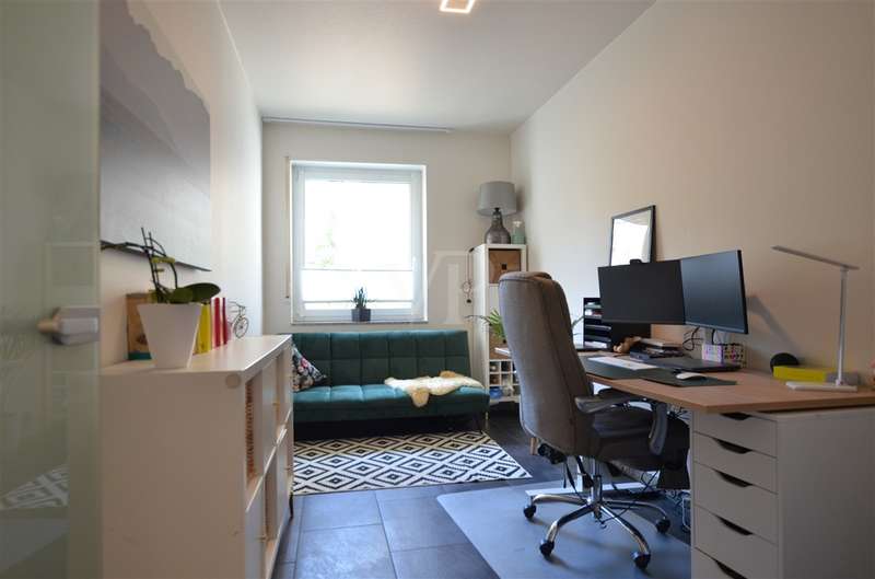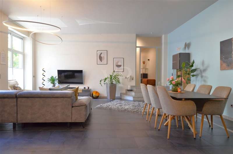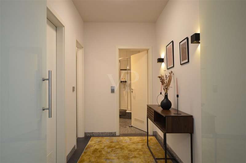 In the heart of the city center, this attractive 3-room first floor apartment with a living space of approx. 119 m² is the ideal retreat for sophisticated living. Here you live in a quiet yet central location. Everything is within walking distance - cafés, restaurants, shopping facilities, pedestrian zone and all stores for daily needs. The cultural offerings and festivities in the city center can also be easily reached on foot without sacrificing the peace and quiet of home. An electrically operated entrance gate provides easy access to the courtyard and your parking space. The entrance area of the house is located at the rear of the courtyard. You reach the apartment at ground level via the stairwell and past the elevator. As you enter the apartment, you are greeted by a spacious hallway. To the right is a bright room that is currently used as an office and is equally suitable as a guest or children's room. Further along the hallway on the right is the cozy bedroom, which impresses with its pleasant size and homely atmosphere. The bedroom has direct access to the west-facing balcony, an outdoor retreat that invites you to linger and relax. This is also accessible from the living/dining area. From the hallway, three steps lead up to the open-plan living/dining area, which creates a harmonious combination of cooking, dining and living. The fitted kitchen combines convenience and suitability for everyday use and is presented in a timeless shade of gray. Generous window areas provide a bright, friendly atmosphere, while the high ceilings create an airy feeling of space. A small hallway adjoins the living area, from which three further rooms are accessible: the interior bathroom with shower and bathtub, a separate guest WC and a practical storage room with additional storage space. The washing machine is also located here. The entire apartment is equipped with underfloor heating, which together with dark gray tiles creates a modern, uniform appearance. Double-glazed plastic windows ensure a pleasant living atmosphere and good energy efficiency. Electric shutters in the living/dining area ensure comfort. Two cellar rooms round off the offer. High-quality fixtures and fittings, a well thought-out room layout and a quiet, stylish ambience characterize the living concept of this apartment - ideal for anyone who wants to combine a central location with modern living.