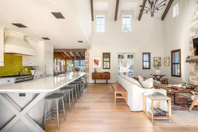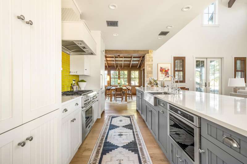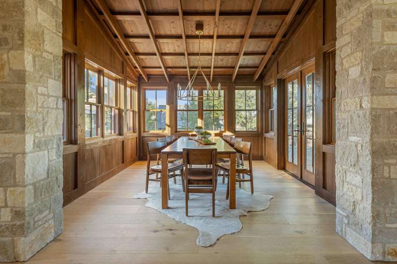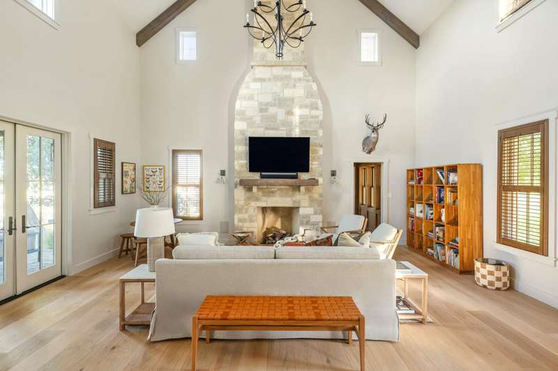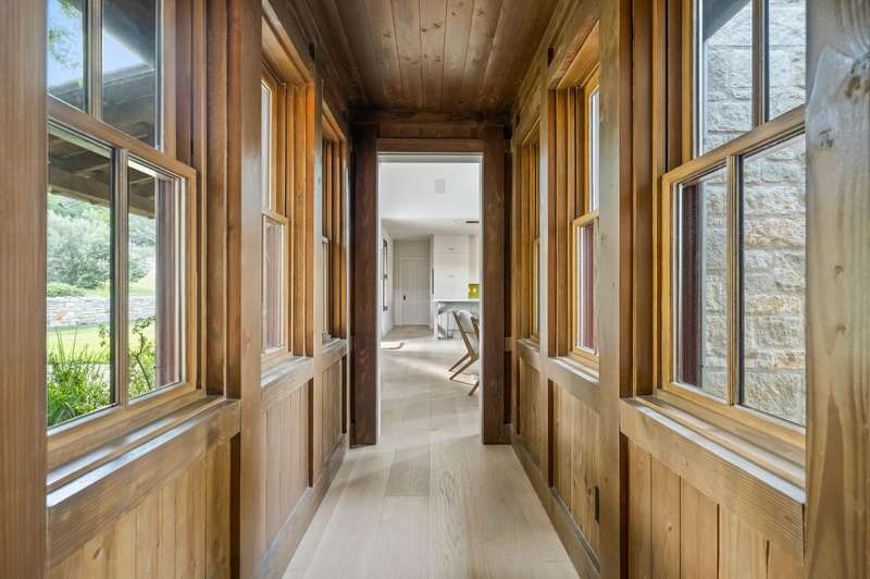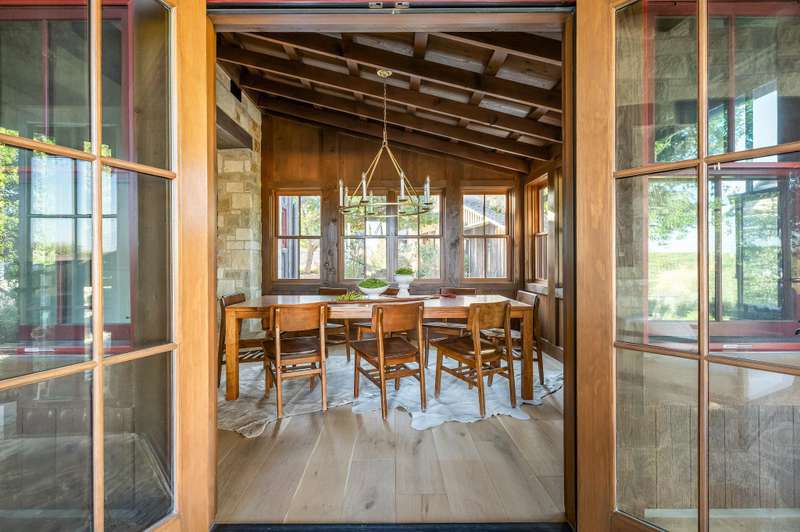 The two-story main gathering house welcomes with limestone porches and a soaring great room anchored by a native-stone fireplace. The rustic dining area honors early Fredericksburg construction techniques, with wood walls and exposed ceiling beams adding warmth and authenticity. The open kitchen is both timeless and functional, featuring premium appliances including dual-fuel range with six-burner gas cooktop, farmhouse sink, and microwave drawer. Nearby, pantry, laundry room, and powder bath add convenience for daily living and entertaining.