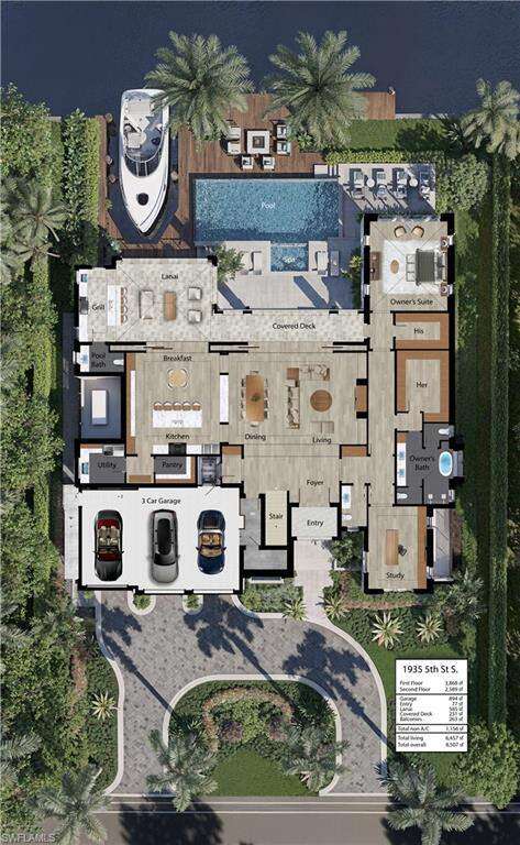 An exciting opportunity on a large lot in Aqualane Shores. Gracious entry to 100 feet at the water and 100 feet at the street lot. One of the best locations with a large water view and direct access to the Gulf of Mexico. Just a short walk to the beach, 3rd street restaurants and shops. Crafted by D. Garrett Construction and architecture by Jon Kukk. This 6,457 square foot home offers high end stunning coastal aesthetic with generous outdoor spaces. Transition from the home interior to the outside Lanai and rare cut in boat slip allowing the stunning waterside area to become part of the homes living experience. Nanny's apartment with separate exterior entrance. Rufino Cabinetry, HVAC Fresh Air Intake, Humidifier and De-Humidifier, Micro-tile Duct Board for Rigid Air Ducts, Whole House Make Up Air, Kitchen Hood Make Up Air. Wolf 48" Dual Fuel Range, Sub-Zero Refrigerator/Freezer, Sub-Zero 24" Wine Storage, Cove and Miele Dishwashers, Wolf Wall Oven, Wolf Coffee System, Zip System Roof, Gulflok Standing Seam Metal Roof with PVDF Paint Finish, Eastern Exposure for enjoyment of Lanai/Patio Area in Late Afternoon and Evening Hours, Built in Electric Storm Shutters/Screens for Lanai and Patio. Coffee bar in mater suite with refrigerated drawers.BOATER AFICIONADOS TAKE NOTE. This property has a Rare 17.4ft x 30ft Cut in Boat Slip PLUS a New Dock along the length New Seawall. CAR ENTHUSIAST TAKE NOTE. A True 3 Stall Garage with the ceiling height capabilities to add car Lifts for 6 Car Parking. Elevator services garage, 1st and 2nd floor of the house. Home has a 10 ft 1 inch elevation. October 24, 2025 completion. Custom design, finish in this home represents a uniquely high-level design, construction, finish, interior design and furnishings.
