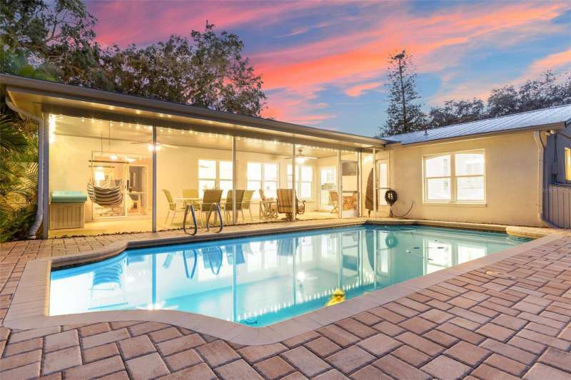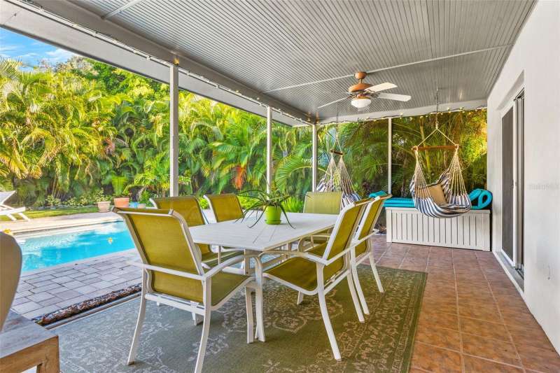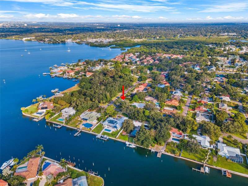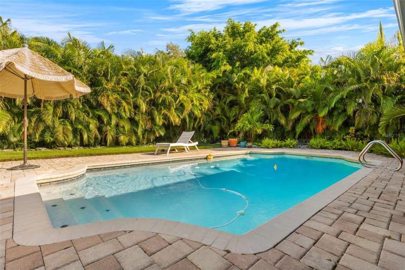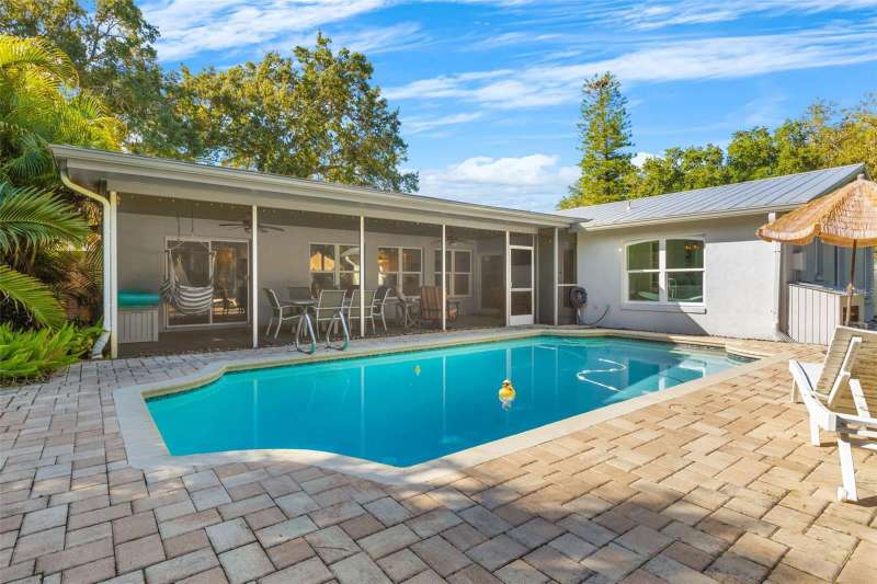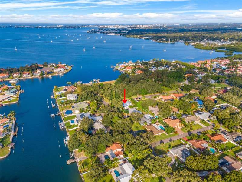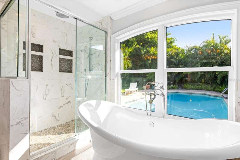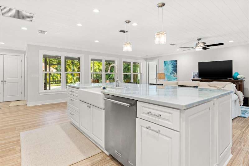Broadwater is booming, and this custom-upgraded pool home puts you at the heart of one of St. Petersburg’s most exciting neighborhoods for growth, convenience, and coastal living. No stone was left unturned in this thoughtful, top-to-bottom remodel. Set on an oversized corner lot, this block-construction 2 bedroom, 2.5 bath ranch-style POOL home lives large with an open concept layout where the living room and chef’s kitchen flow seamlessly together. Walls of oversized, impact windows frame the tropical backyard oasis and bathe the interiors in natural light. The entertainer’s kitchen features custom wood cabinetry with oversized soft-close and spice drawers, a dramatic 10x5 island with farmhouse sink, dishwasher and extra storage/seating, striking quartzite countertops, and premium KitchenAid appliances—including a 36" 6-burner gas range, 5- door refrigerator, combo wall oven/microwave, plus a wine fridge and ice maker in the butler’s pantry. Porcelain tile flooring carries throughout. The split plan offers two spacious bedrooms, each with an ensuite bath, plus a convenient half bath that opens to the screened lanai for easy pool access. The serene primary suite provides a custom walk-in closet, sitting area, and a spa-worthy bath with dual vanities with quartzite countertops, a marble walk-in shower boasting four niches, and a Victoria + Albert Marlborough double-ended slipper tub overlooking the lush landscape including 30+ Eureka palms—designed for everyday resort living. Enjoy glimpses of Boca Ciega Bay from the dining area and the primary suite and prepare for sunsets that will take your breath away. Arrive through the garage to a charming laundry/mudroom with a custom farmhouse sink. Outdoors, Florida living shines: a large screened porch (accessed by a sliding pocket door) overlooks the sparkling pool and fully fenced, private backyard, complete with a Meyer lemon tree. Notable upgrades include a 2017 metal roof, a Trane 3.5-ton HVAC with transferable 10-year warranty (installed 2021), updated plumbing and electrical, water softener, tongue-and-groove pine ceiling accents, Moen fixtures, crown moulding with upgraded trim/baseboards, solid wood interior/exterior doors, a security-minded front door with triple deadbolt and insulated sidelights, designer lighting, extensive LED recessed and under-cabinet lighting, refreshed exterior stucco, gutters with guards and soffits, pool equipment updates, newer toilets, exterior security cameras and motion lighting, added insulation, new ceiling fans, and a wide driveway with extra guest and boat/RV parking. All of this in a superb location a few blocks to the multi-million-dollar Maximo Marina, close to waterfront dining, and just minutes to St. Pete Beach and vibrant Downtown St. Petersburg, with quick I-275 access for easy commutes and airport runs. Come experience Broadwater’s best—schedule your private tour and make this stunning residence your new place to call home.