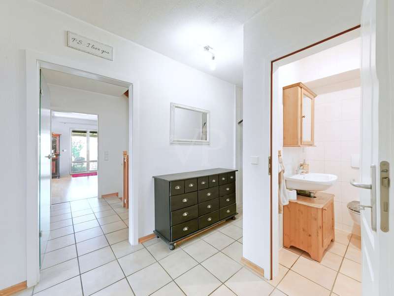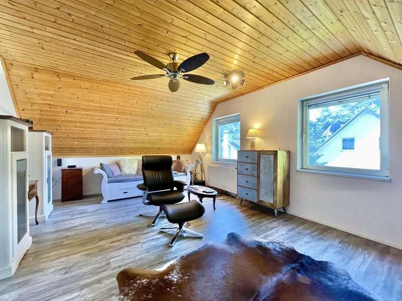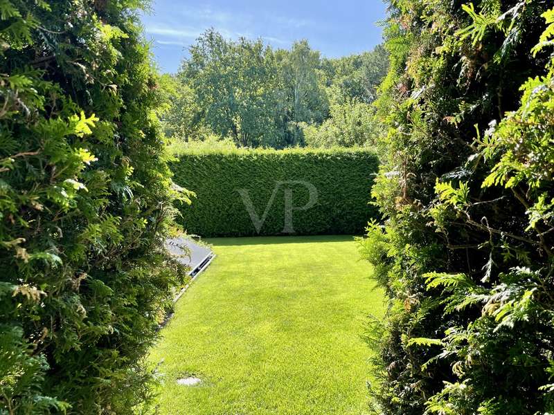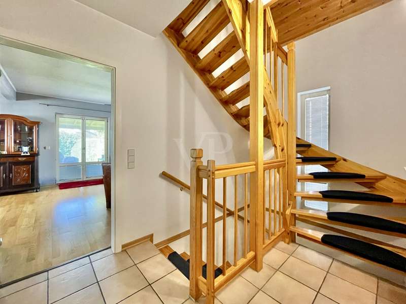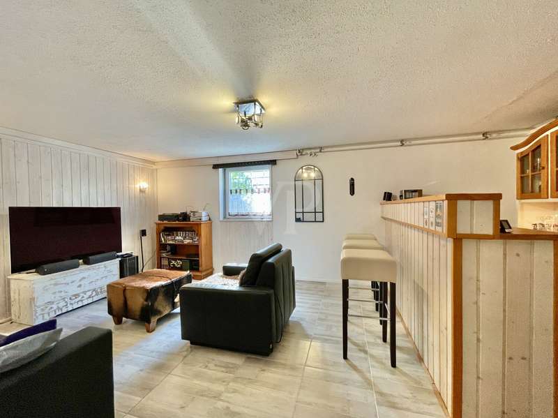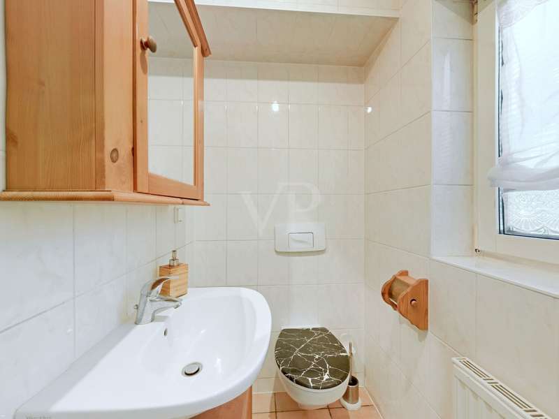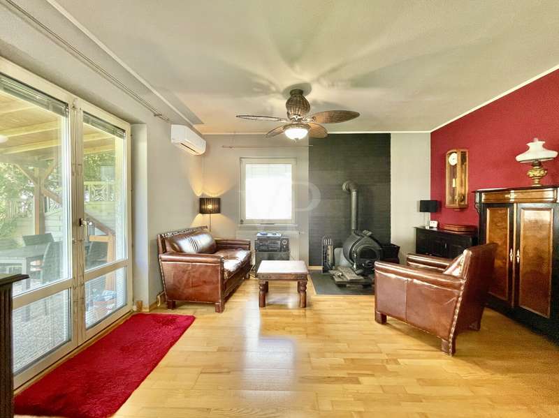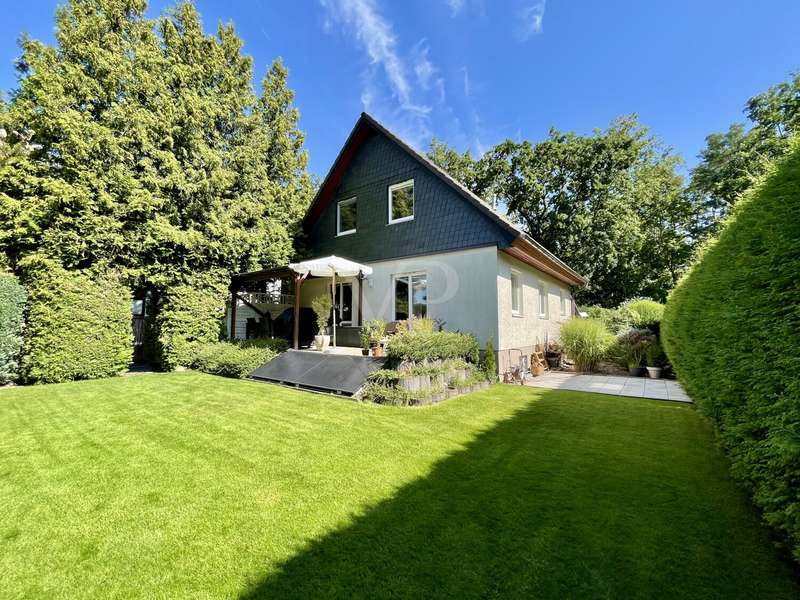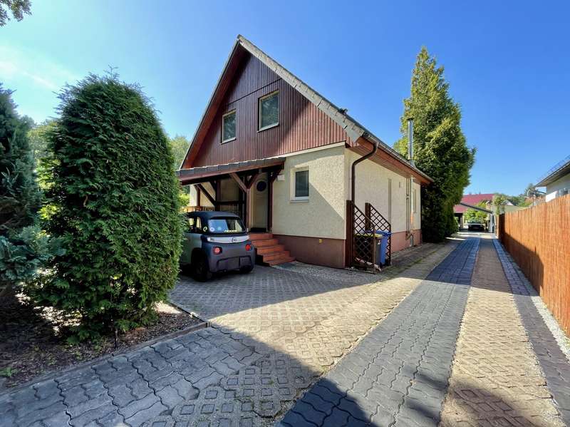 This detached house, built in 1996 in an ecological timber frame construction, offers a comfortable home on approx. 105 m² of living space in a quiet location close to nature. The approx. 510 m² plot is situated in a cul-de-sac and guarantees privacy and pure relaxation. The lovingly landscaped garden with a sunny south-west-facing terrace invites you to spend relaxing hours - whether at breakfast in the morning sun or with a glass of wine in the evening. As you enter the house, you are greeted by an inviting hallway. To the left is the kitchen and to the right is a guest WC. Another hallway leads into the light-flooded living room with parquet flooring, a cozy fireplace and direct access to the terrace. Here, living space and nature merge into a place of peace and security. Two bright bedrooms, a spacious bathroom with shower and bathtub and a practical boiler room await you on the top floor. An additional room could be created by dividing the approx. 20 m² room. The special highlight of this house is the heated basement. This opens up a wide range of possible uses: Hobby rooms, storage space - and above all an inviting party and wellness area. The integrated bar creates the perfect setting for sociable evenings with friends, while the in-house sauna promises pure relaxation after a long day. Here, the basement becomes a real oasis of well-being! A garage, a carport and a practical wooden shed in the garden provide additional comfort. The gas condensing boiler, which was renewed in 2010, the installed air conditioning system and the existing fireplace also ensure a pleasant indoor climate and flexible heating options all year round. High-quality wooden windows with an aluminum outer shell further underline the quality of the house. They combine a natural living atmosphere with durability and practical ease of maintenance. Particularly noteworthy is the fact that the building is an energy-saving house, which ensures low operating costs and sustainable use of energy. The location in a cul-de-sac guarantees peace and privacy, while the direct proximity to the forest will delight nature lovers. The house is also well connected: The bus stop for line 169 is only around 500 meters away and goes directly to Köpenick S-Bahn station (S3). Whether as a retreat for couples or as a home for a small family - this house combines a well thought-out room layout with a cozy atmosphere, a natural environment and practical transport connections that perfectly combine relaxation and suitability for everyday use.