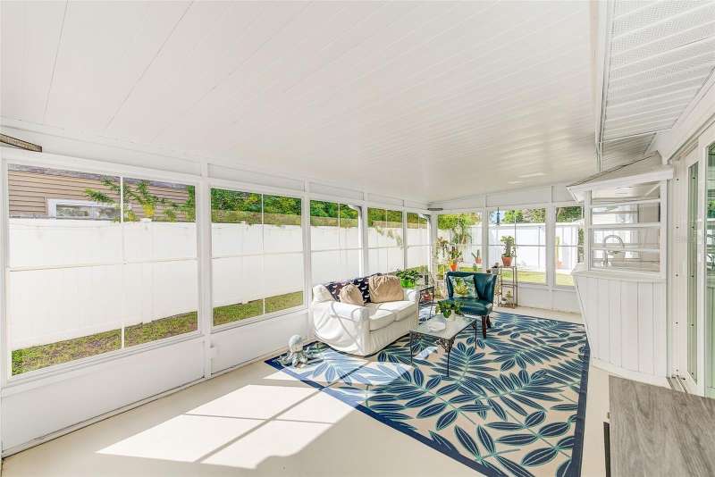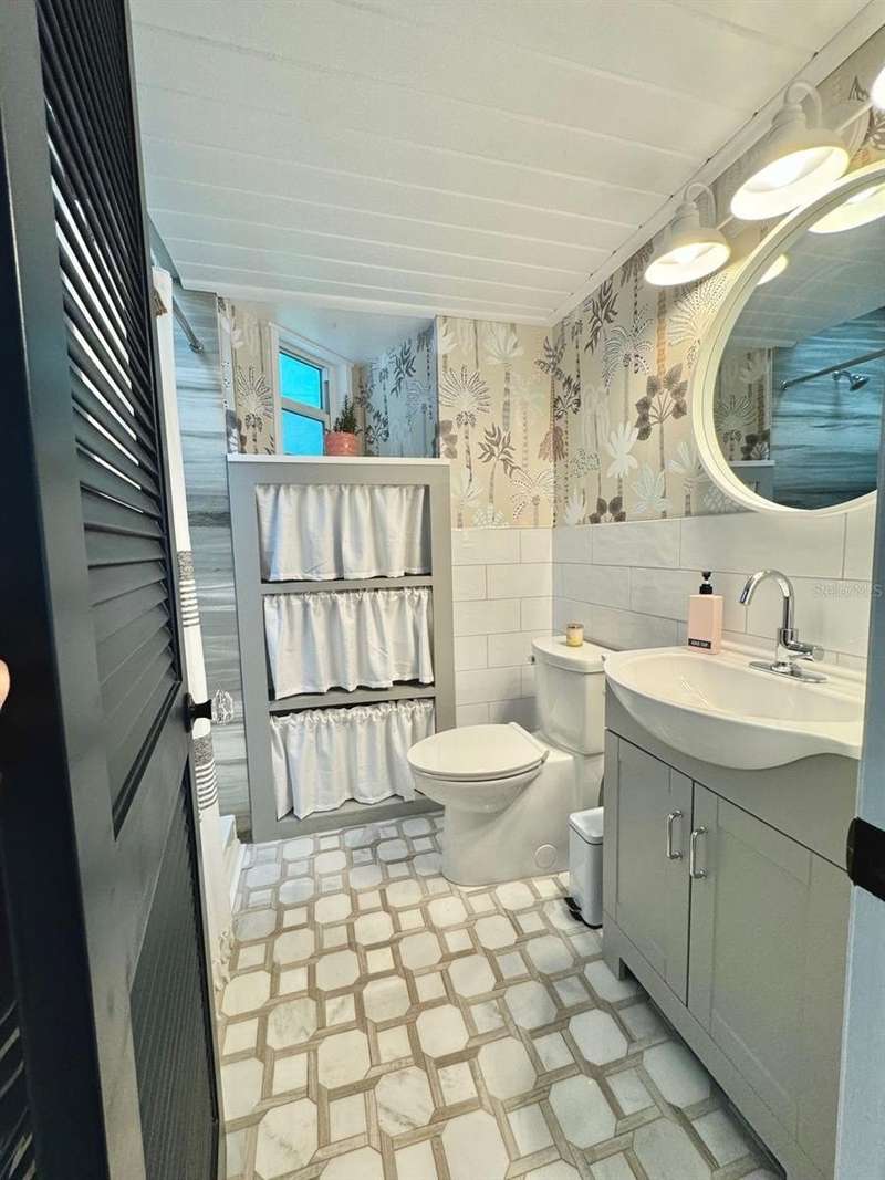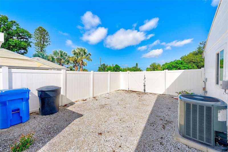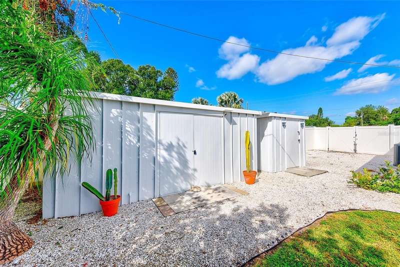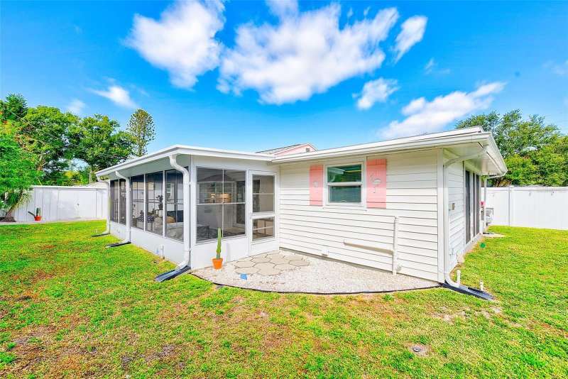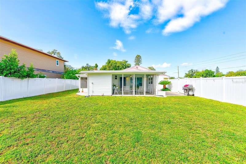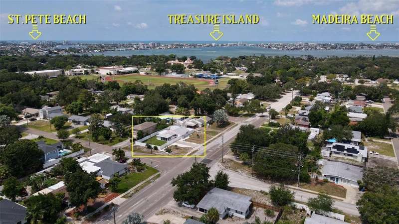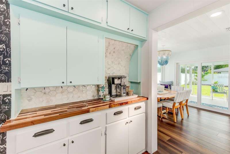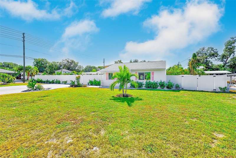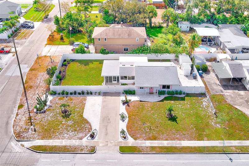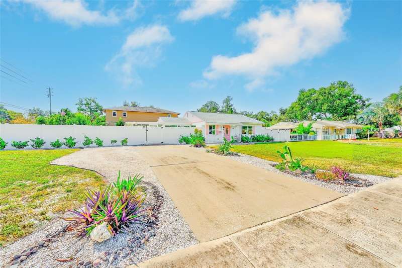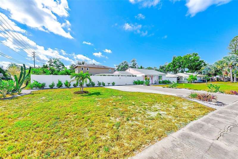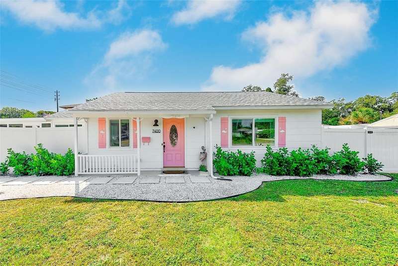 Welcome to an impeccably remodeled 2-bedroom, 3-bath home on a handsome corner lot with room to add a pool — in a full no-flood zone, less than 10 minutes from the beaches of Treasure Island, Madeira Beach and St. Pete Beach, and only 10–15 minutes to vibrant downtown St. Petersburg. Inside, the style feels entirely custom-designed: luxury vinyl plank flooring throughout, three beautifully finished bathrooms with distinctive tile work, and abundant attention to detail. The third full bath (recently constructed with future pool plans in mind) is sleek and modern; the second bath is a statement room with oversized polished porcelain tile (60×120), a freestanding tub set against a deep blue vertical tile accent wall and a floating wood vanity with brushed-gold fixtures; the primary bath exudes spa-like elegance with marble-look wall tile, hexagonal floor tile and a slatted wood-vanity design. The kitchen is full of personality and charm: butcher-block countertops paired with light-blue upper and white lower cabinets, stainless-steel appliances, an island cooktop, dog-themed wallpaper, and a bay window at the sink. In the adjacent dining area, built-in window bench seating complements a matching butcher-block table, and skylights overhead flood the space with bright, cheerful natural light. Major systems and structural upgrades have been completed 2023–2024: new HVAC with ductwork, full 200-amp electrical service and panel, hurricane-impact sliders & windows, fresh exterior paint (2024), new vinyl privacy fence and gating for vehicle/boat/RV storage, programmable outdoor lighting, well-pump irrigation system, and two large aluminum storage sheds (16×8 & 7×6) for generous storage without rust. Mature Peruvian Apple cacti anchor the landscaping, together with recently planted palms, avocado and orange trees — a lush backdrop that complements the clean modern interiors. In addition to all the stunning updates, this property offers incredible future potential. The City of St. Petersburg recently adopted temporary regulations allowing Accessory Dwelling Units (ADUs) to help increase affordable housing options. With this large corner lot, there’s ample room to add both a pool and an ADU (or two, if the sheds are relocated) — perfect for generating rental income, creating a guest suite, or providing private space for extended family. This home is truly move-in ready, thoughtfully updated from top to bottom, offering designer styling, peace of mind, and a prime location — with even more opportunity ahead.