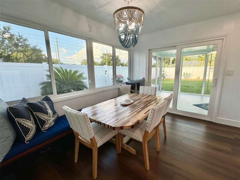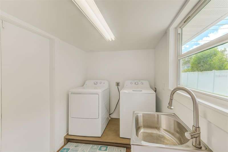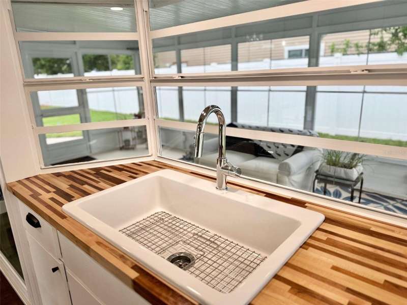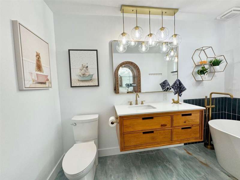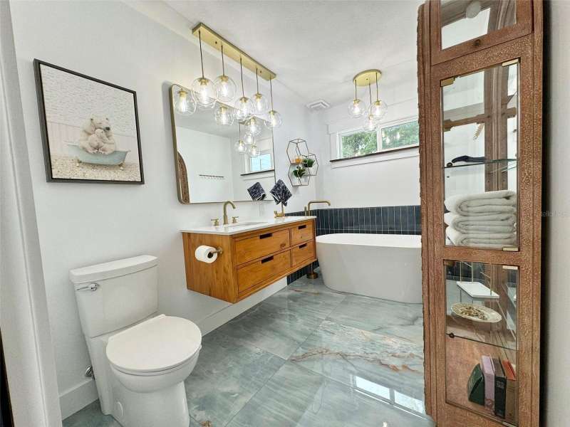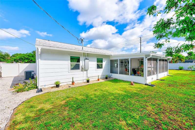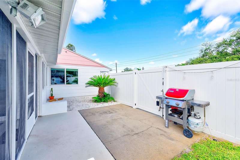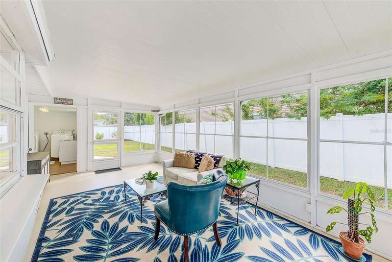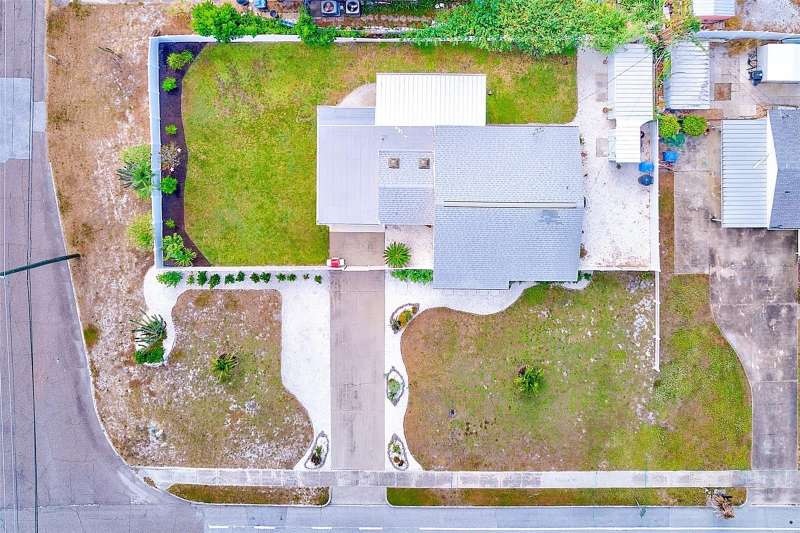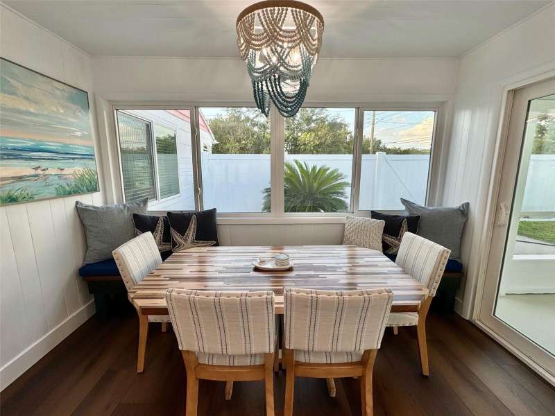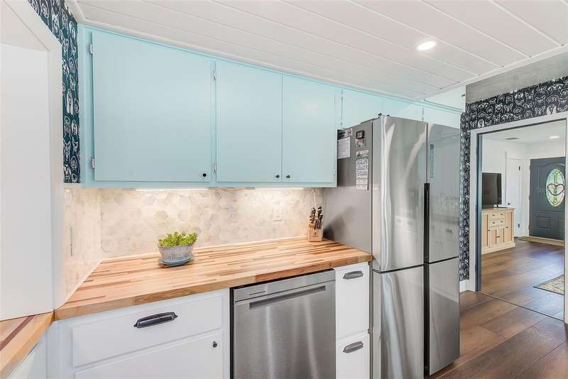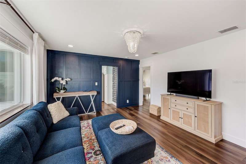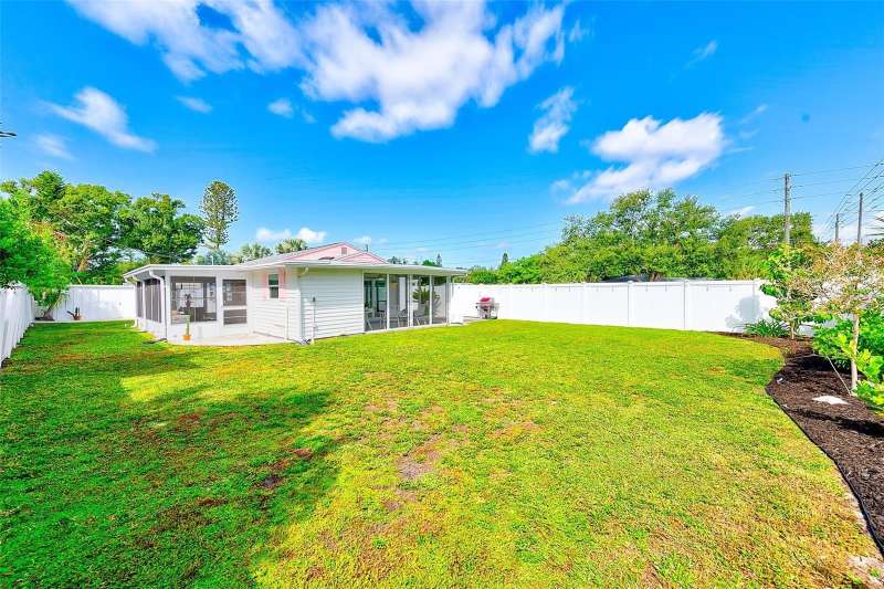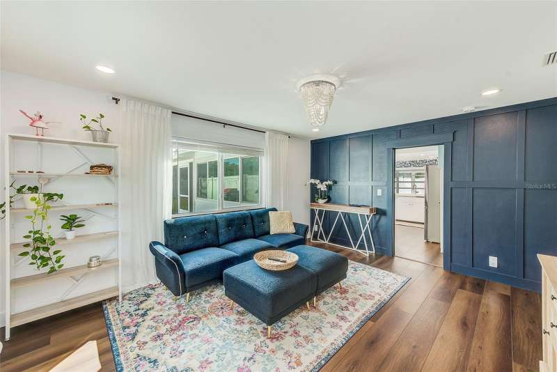 Welcome to an impeccably remodeled 2-bedroom, 3-bath home on a handsome corner lot with room to add a pool — in a full no-flood zone, less than 10 minutes from the beaches of Treasure Island, Madeira Beach and St. Pete Beach, and only 10–15 minutes to vibrant downtown St. Petersburg. Inside, the style feels entirely custom-designed: luxury vinyl plank flooring throughout, three beautifully finished bathrooms with distinctive tile work, and abundant attention to detail. The third full bath (recently constructed with future pool plans in mind) is sleek and modern; the second bath is a statement room with oversized polished porcelain tile (60×120), a freestanding tub set against a deep blue vertical tile accent wall and a floating wood vanity with brushed-gold fixtures; the primary bath exudes spa-like elegance with marble-look wall tile, hexagonal floor tile and a slatted wood-vanity design. The kitchen is full of personality and charm: butcher-block countertops paired with light-blue upper and white lower cabinets, stainless-steel appliances, an island cooktop, dog-themed wallpaper, and a bay window at the sink. In the adjacent dining area, built-in window bench seating complements a matching butcher-block table, and skylights overhead flood the space with bright, cheerful natural light. Major systems and structural upgrades have been completed 2023–2024: new HVAC with ductwork, full 200-amp electrical service and panel, hurricane-impact sliders & windows, fresh exterior paint (2024), new vinyl privacy fence and gating for vehicle/boat/RV storage, programmable outdoor lighting, well-pump irrigation system, and two large aluminum storage sheds (16×8 & 7×6) for generous storage without rust. Mature Peruvian Apple cacti anchor the landscaping, together with recently planted palms, avocado and orange trees — a lush backdrop that complements the clean modern interiors. In addition to all the stunning updates, this property offers incredible future potential. The City of St. Petersburg recently adopted temporary regulations allowing Accessory Dwelling Units (ADUs) to help increase affordable housing options. With this large corner lot, there’s ample room to add both a pool and an ADU (or two, if the sheds are relocated) — perfect for generating rental income, creating a guest suite, or providing private space for extended family. This home is truly move-in ready, thoughtfully updated from top to bottom, offering designer styling, peace of mind, and a prime location — with even more opportunity ahead.