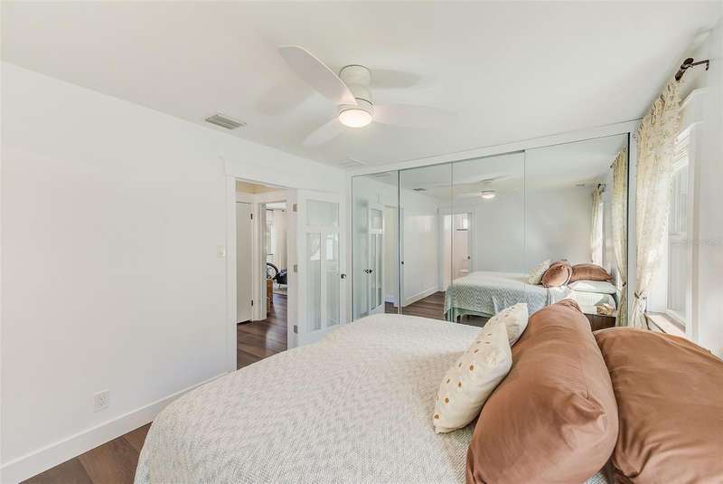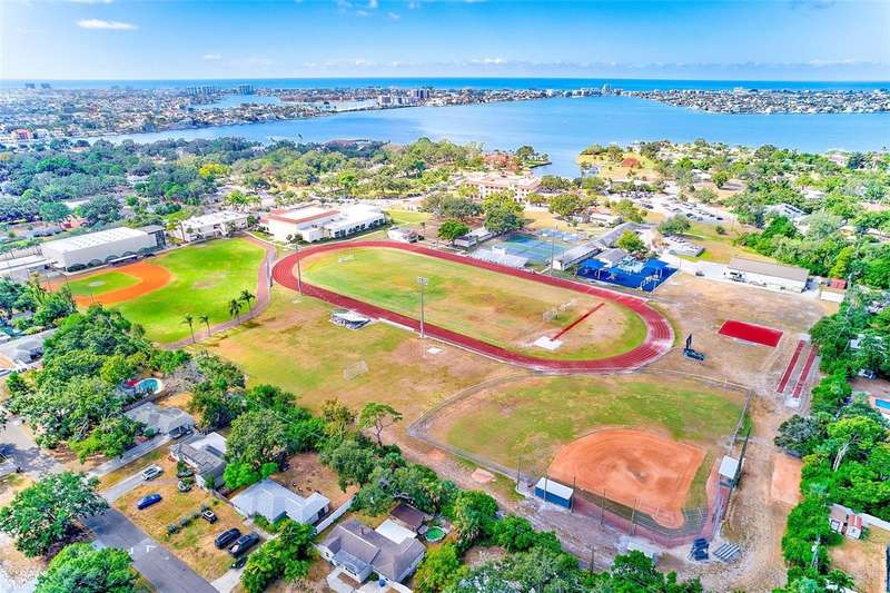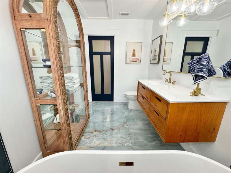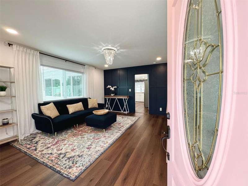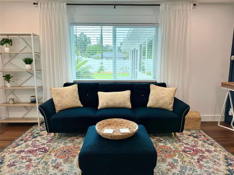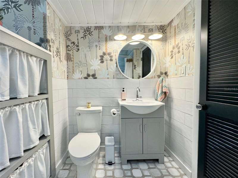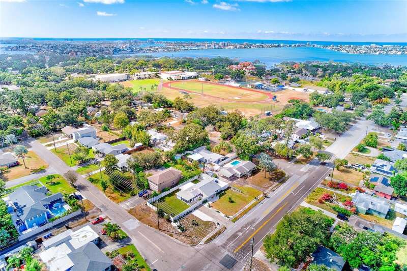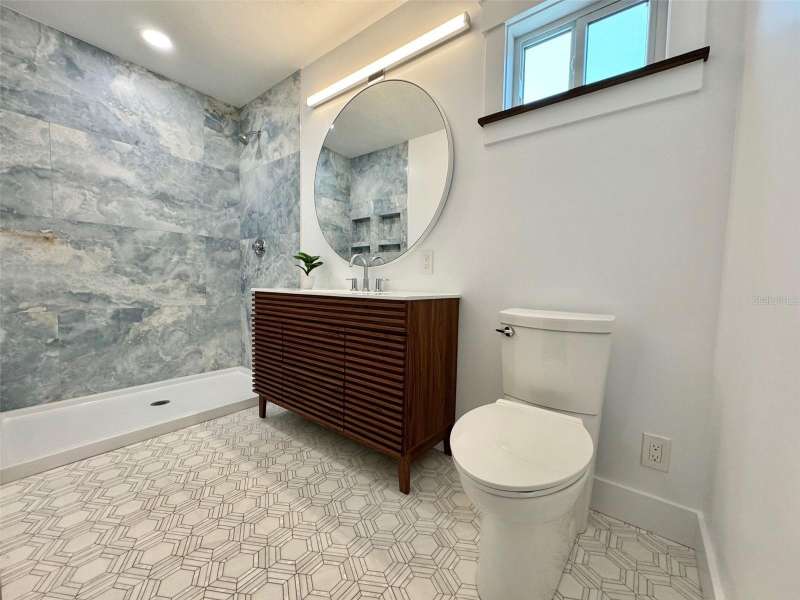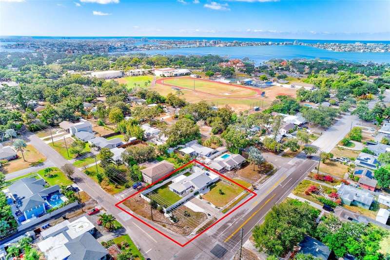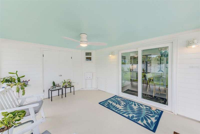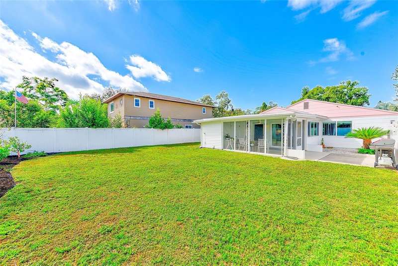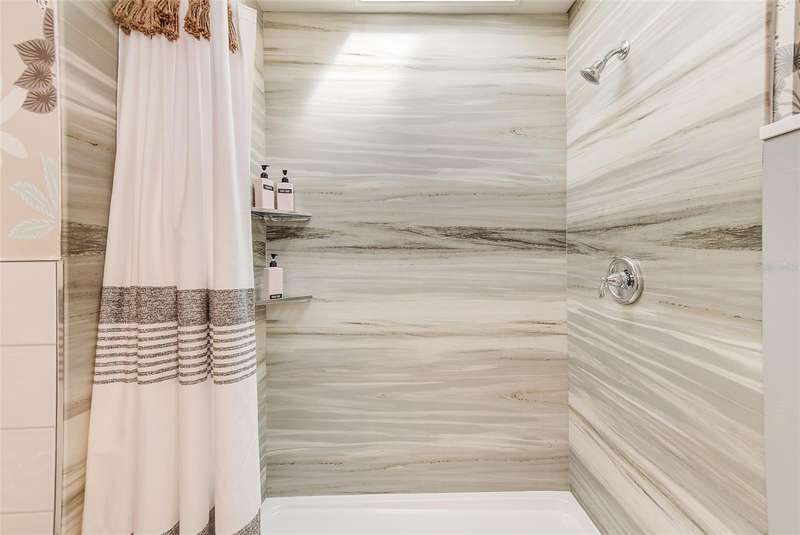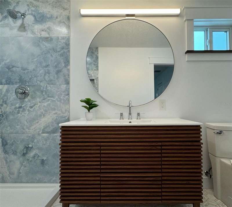 Welcome to an impeccably remodeled 2-bedroom, 3-bath home on a handsome corner lot with room to add a pool — in a full no-flood zone, less than 10 minutes from the beaches of Treasure Island, Madeira Beach and St. Pete Beach, and only 10–15 minutes to vibrant downtown St. Petersburg. Inside, the style feels entirely custom-designed: luxury vinyl plank flooring throughout, three beautifully finished bathrooms with distinctive tile work, and abundant attention to detail. The third full bath (recently constructed with future pool plans in mind) is sleek and modern; the second bath is a statement room with oversized polished porcelain tile (60×120), a freestanding tub set against a deep blue vertical tile accent wall and a floating wood vanity with brushed-gold fixtures; the primary bath exudes spa-like elegance with marble-look wall tile, hexagonal floor tile and a slatted wood-vanity design. The kitchen is full of personality and charm: butcher-block countertops paired with light-blue upper and white lower cabinets, stainless-steel appliances, an island cooktop, dog-themed wallpaper, and a bay window at the sink. In the adjacent dining area, built-in window bench seating complements a matching butcher-block table, and skylights overhead flood the space with bright, cheerful natural light. Major systems and structural upgrades have been completed 2023–2024: new HVAC with ductwork, full 200-amp electrical service and panel, hurricane-impact sliders & windows, fresh exterior paint (2024), new vinyl privacy fence and gating for vehicle/boat/RV storage, programmable outdoor lighting, well-pump irrigation system, and two large aluminum storage sheds (16×8 & 7×6) for generous storage without rust. Mature Peruvian Apple cacti anchor the landscaping, together with recently planted palms, avocado and orange trees — a lush backdrop that complements the clean modern interiors. In addition to all the stunning updates, this property offers incredible future potential. The City of St. Petersburg recently adopted temporary regulations allowing Accessory Dwelling Units (ADUs) to help increase affordable housing options. With this large corner lot, there’s ample room to add both a pool and an ADU (or two, if the sheds are relocated) — perfect for generating rental income, creating a guest suite, or providing private space for extended family. This home is truly move-in ready, thoughtfully updated from top to bottom, offering designer styling, peace of mind, and a prime location — with even more opportunity ahead.