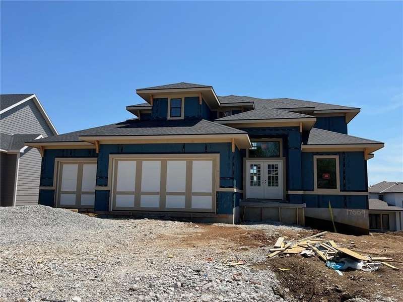 The new 4 CAR TANDEM Rosedale 1.5 Story plan by SAB HOMES is now building on walk out lot 185 in a cul de sac in Century Farms for September MOVE IN. Beautiful modern farmhouse interior selection with warm wood, light colored walls, black and gold hardware, two story great room wood accent celling with painted beams, floating shelves, hallway wainscoting, wood ceiling in primary bedroom, sleek modern floating cabinets in primary bathroom with back lit black mirrors, white quartz and freestanding tub, front porch entry with double door entrance, large 14' covered deck along the back side of the house connecting the dining room to the primary suite, plus a covered patio at the walkout lower level. Pocket laundry in the primary closet and a full 2nd laundry upstairs by the bedrooms. This home has it all with a grand two story great room, main floor primary bedroom, office or formal dining room space, 3 bedrooms upstairs and a 2nd laundry. This sleek farmhouse has striking curb appeal with a white stucco exterior, black fox doors and shutters, warm wood accents and real stone trim. Optional finished basement with 1164 additional square feet can be added with a 5th bedroom/ fitness room/ hobby space or extra office. There is still time to make some of your design selections since it's under construction. Come join the fun in Century Farms, an upscale new home community in Overland Park near Bluhawk shopping center, Heritage Park and the Overland Park Arboretum. Blue Valley Schools