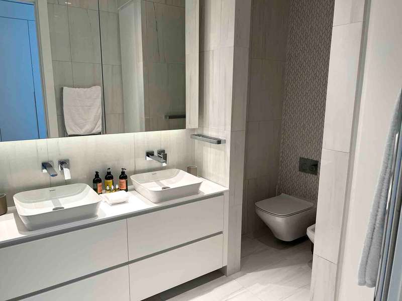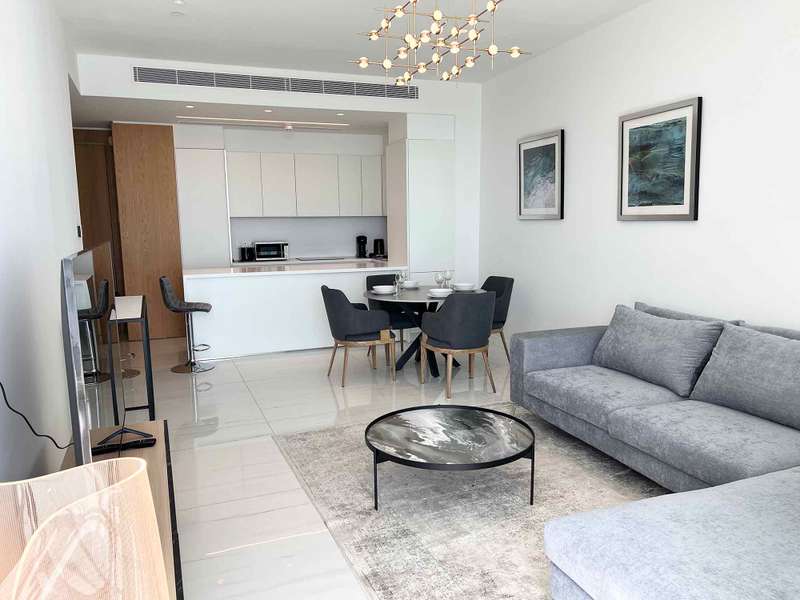 Beautiful two bedroom apartment in a high-rise building located in the heart of the city, offering stunning sea views. The apartment is bright, spacious, and fully air-conditioned, with an open-plan living, dining, and fully equipped kitchen area. The living room features a flat screen TV and WiFi, while the bedrooms are furnished with comfortable queen size beds and have ample wardrobe space. One bedroom also has an ensuite bathroom and a balcony with a view. The building is equipped with modern amenities, including an outdoor pool, fitness center, sauna, and secure underground parking. In addition, there are several restaurants and shops within the complex, making it a convenient location for residents.