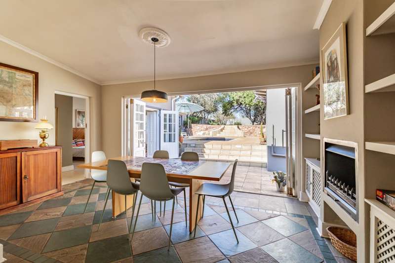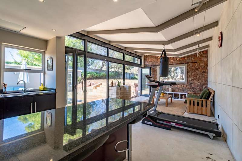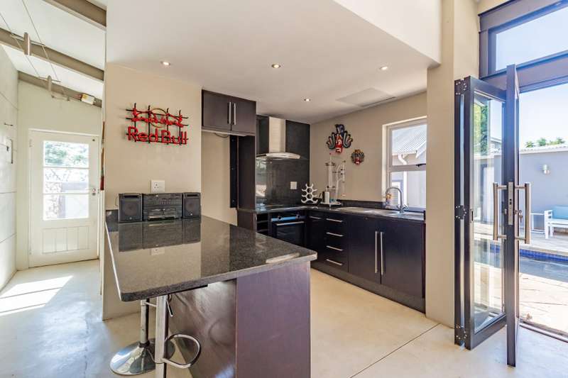 The heart of this home is the modern kitchen, equipped with sleek cupboards, granite countertops, a gas stove, and a pantry. Adjacent to the kitchen is a separate scullery and laundry area, ensuring practicality and convenience. The kitchen seamlessly flows into the open-plan dining room, which boasts stacking doors that open to the stunning backyard and sparkling blue pool.