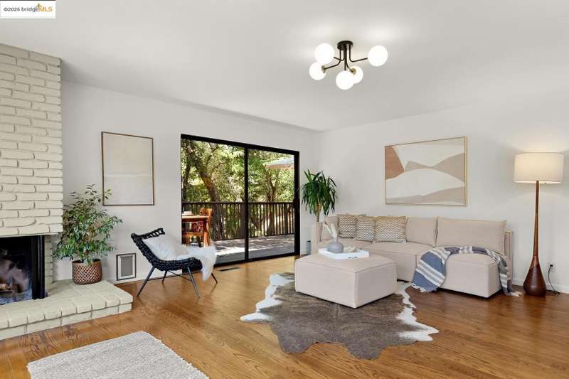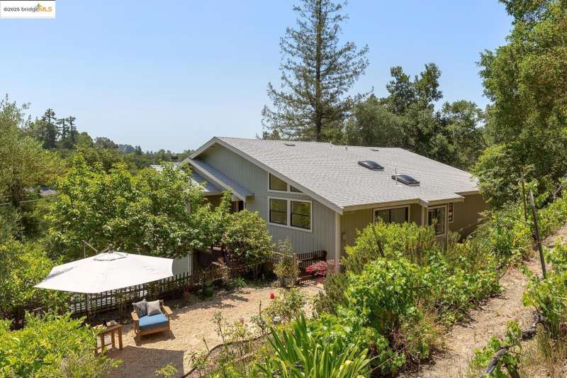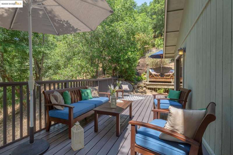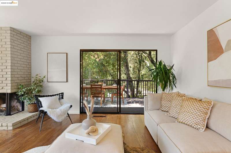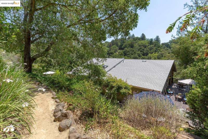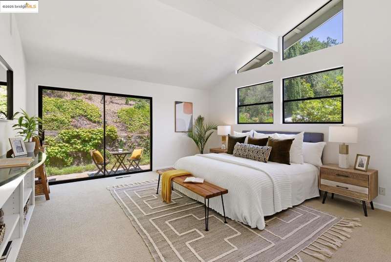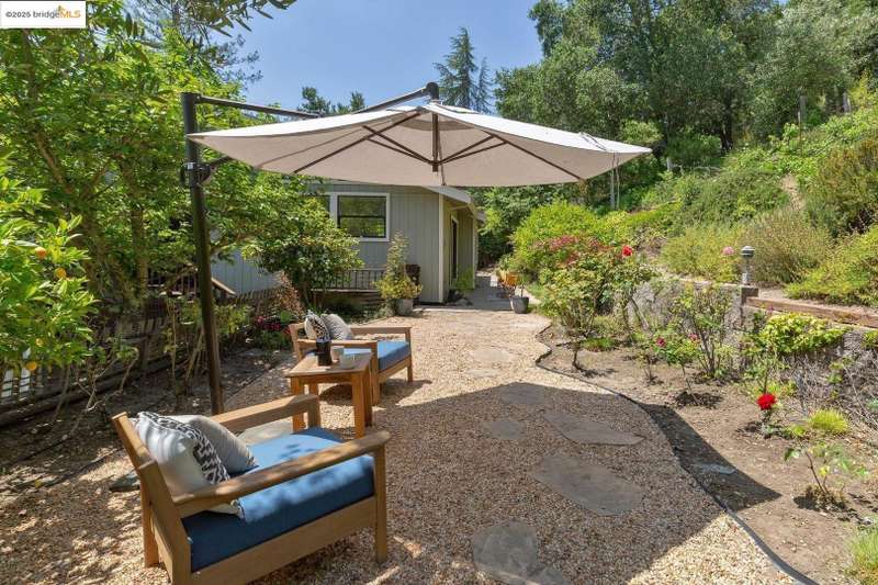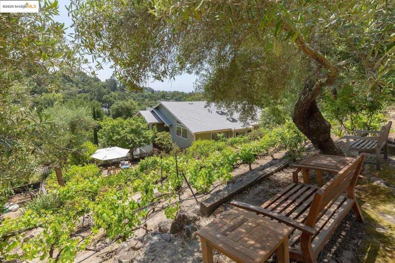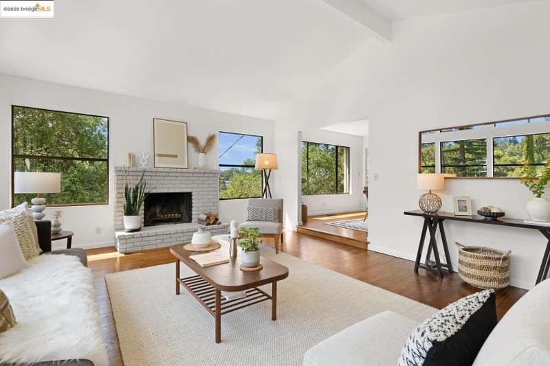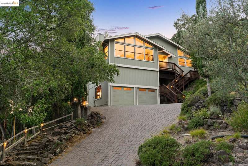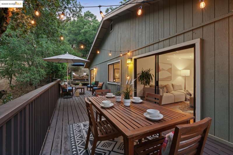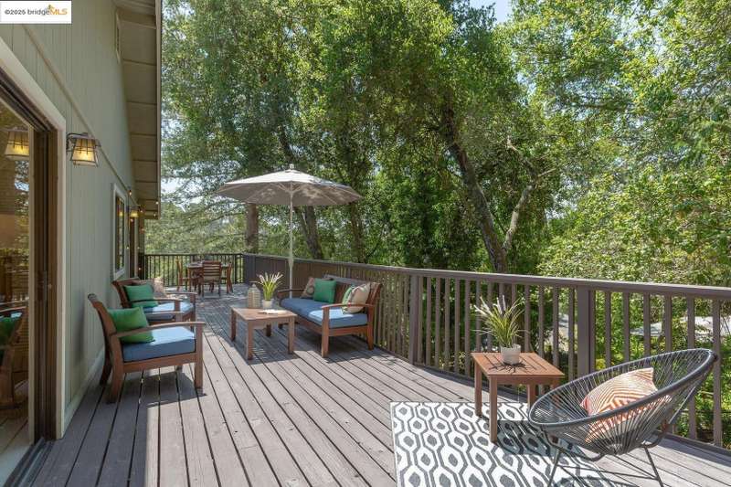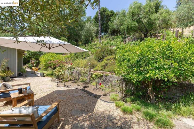 Perched on a serene hillside in Orinda’s coveted Charles Hill neighborhood, this light filled contemporary single-level retreat invites you to live among nature’s finest offerings. A wall of windows frames enchanting verdant views, from the sunlit vineyard to fragrant rose gardens, while soaring ceilings and a brick fireplace add warmth and elegance to the expansive living room. The formal dining room invites casual family gatherings and elegant holiday meals and dinner parties alike. The open flow from the kitchen and family room extends effortlessly to an expansive deck, made for summer meals overlooking your own hillside oasis. A luxurious primary suite provides private patio access for quiet reflection, while three additional bedrooms cater to comfort and versatility. A separate guest studio—complete with private deck, full kitchen, and bath(not included in bed/bath count)—creates endless possibilities for hosting friends, multi-gen living, or dedicated work-from-home space. Surrounded by olive, Meyer lemon, and fruit trees, this sunlit lot feels worlds away, yet you’re just minutes from downtown Orinda, Lafayette’s vibrant amenities, and Orinda’s highly acclaimed schools. Recently refreshed and move-in ready, 151 La Espiral is a home where every day feels like a getaway.