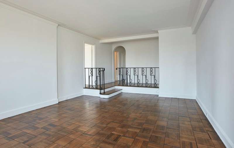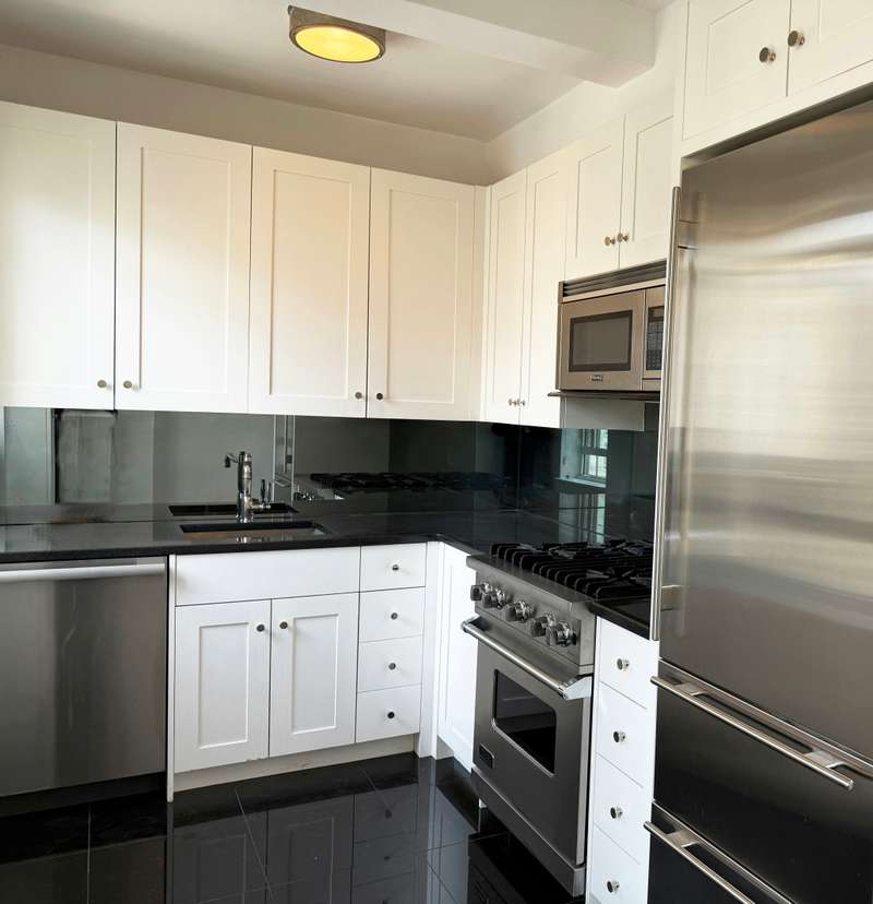 An inviting entry foyer welcomes you into the step down Living Room with its original art-deco railing and brilliant direct park views. Adjacent to the Living Room is the bright, corner Primary Bedroom with East and South facing windows, two closets and a windowed en-suite art-deco bathroom. Overlooking the Lincoln Center Plaza, the renovated windowed Eat-In Kitchen is stunning and functional with its white cabinets, black granite floors and counter tops, hi-end stainless steel appliances and new thermopane windows. A spacious, quiet second bedroom is situated on the Southwest corner of the building. Conveniently located in the hallway, an updated bathroom is well positioned for guests. Other notable features are beautifully maintained hardwood floors, original art deco moldings and archways. New window shades have just been installed. Thru-wall and central a/c are now permitted as well as Washer/Dryers with prior approval.