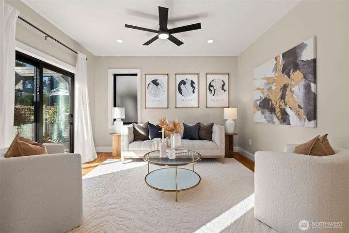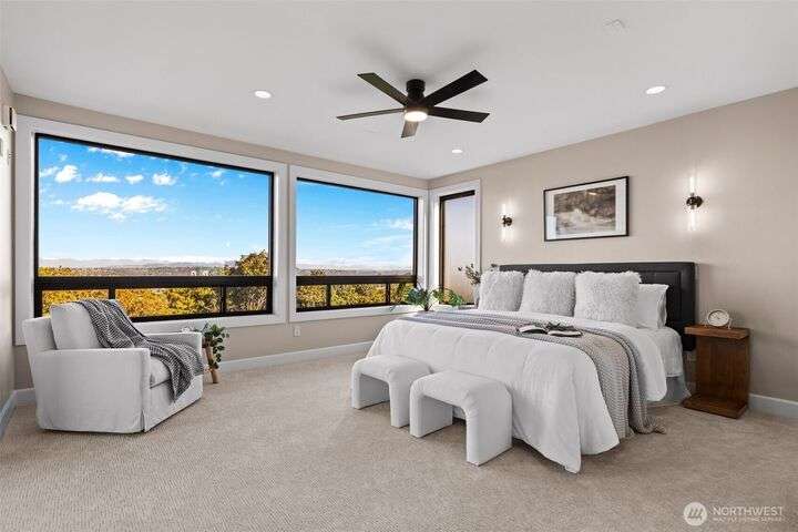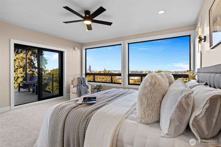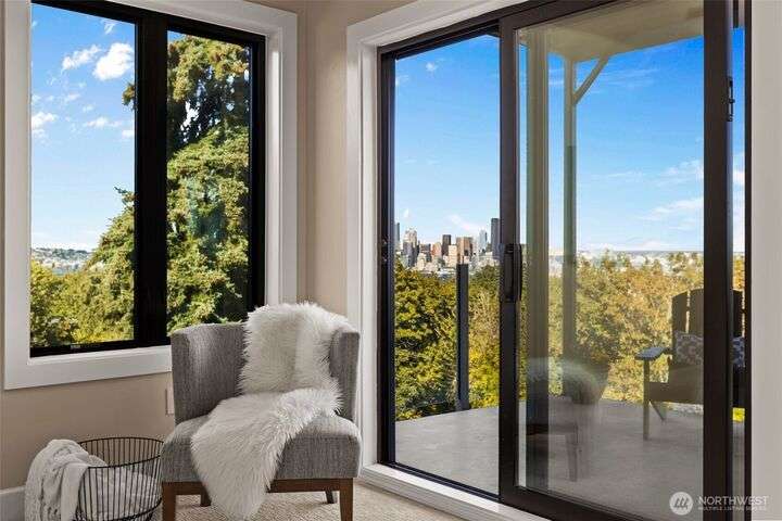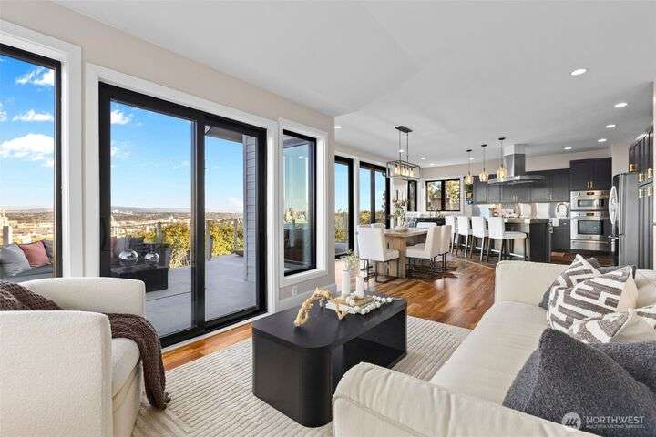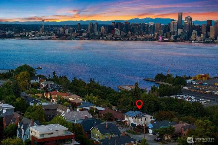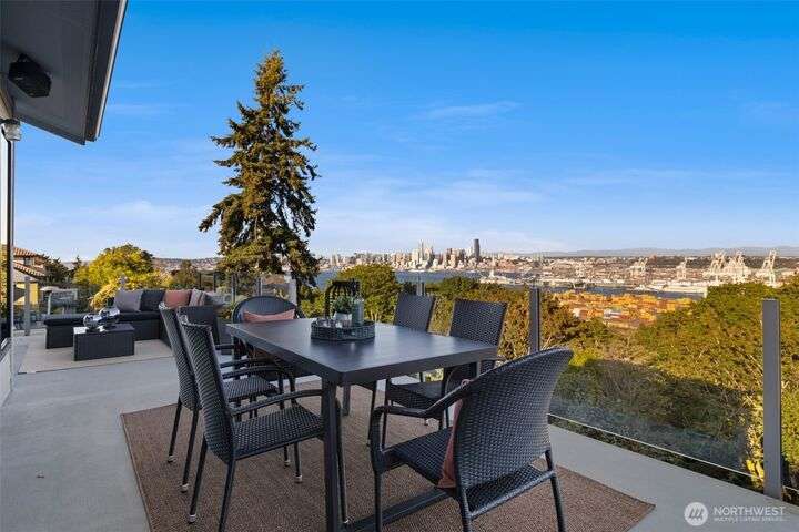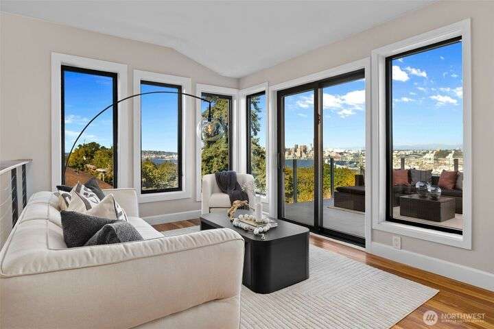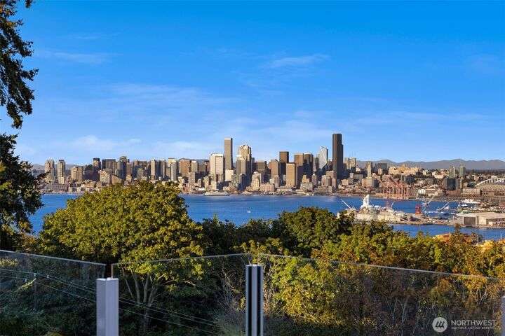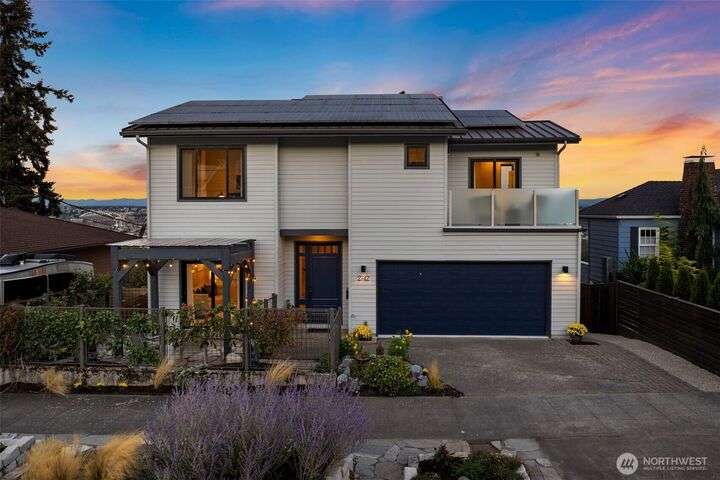 Located in the coveted Belvidere neighborhood, this modern city view home offers natural light, soaring ceilings, stunning views of Seattle, the Cascades, and Elliott Bay. The top floor showcases a dramatic great room w/ floor to ceiling windows, sliding doors to an expansive view deck, 2 bdrms & full bath. Main level has 2 more bdrms incl. a spacious primary suite, another full bath, a view deck & a bonus room. The lower level/ADU adds 2 bdrms (one a second primary), 2 baths & flexible living areas. Outside is a private fenced patio & garden. Refinished hardwoods, refreshed kitchens w/ updated appliances, steam showers, soaking tubs, new windows, solar panels, 2-car attached garage & a workshop complete this impressive West Seattle haven.
