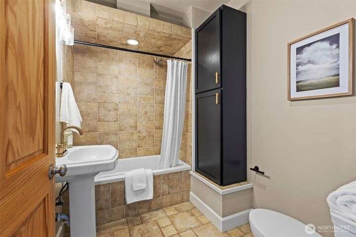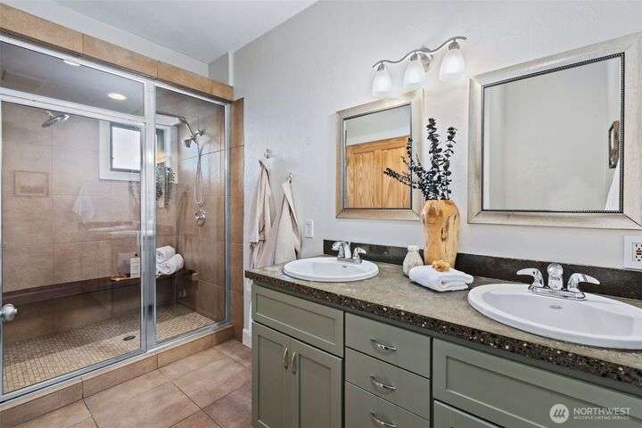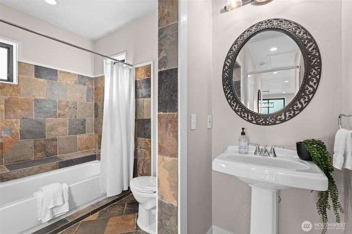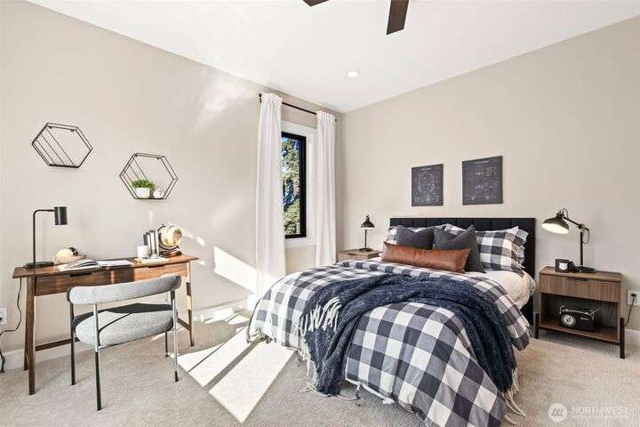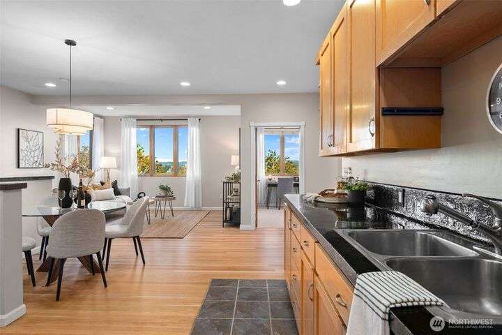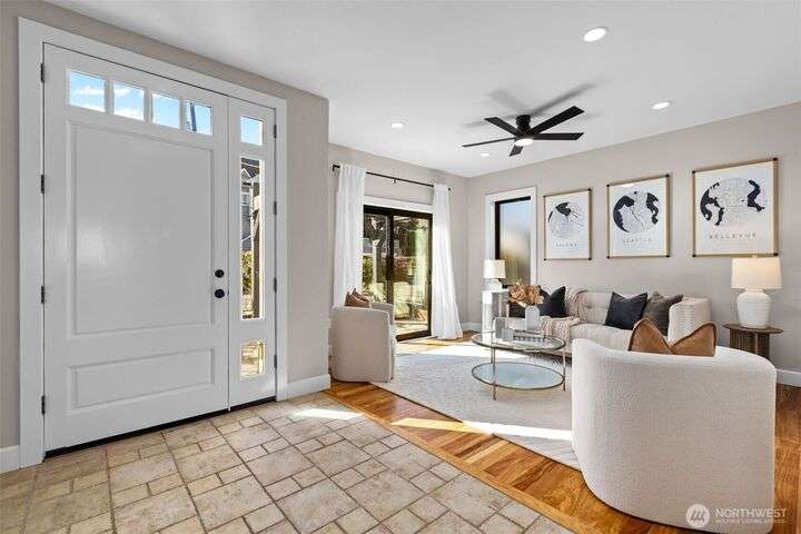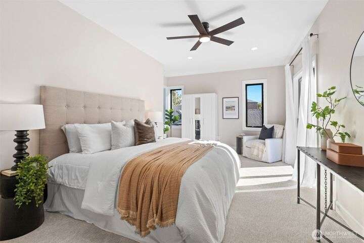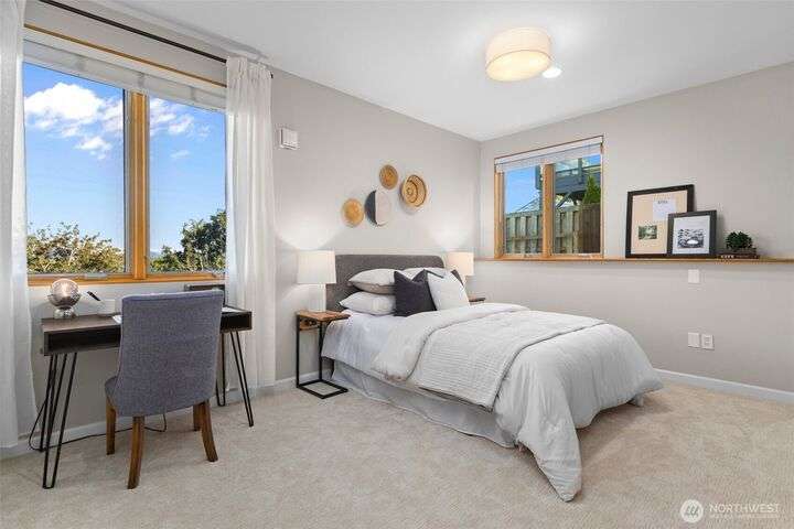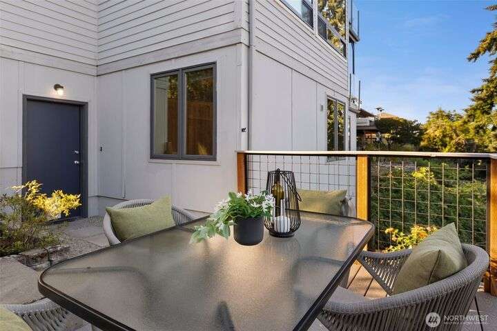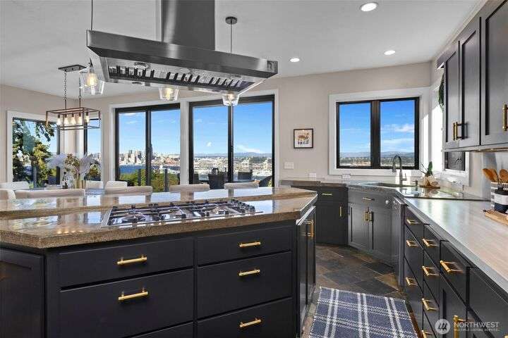 Located in the coveted Belvidere neighborhood, this modern city view home offers natural light, soaring ceilings, stunning views of Seattle, the Cascades, and Elliott Bay. The top floor showcases a dramatic great room w/ floor to ceiling windows, sliding doors to an expansive view deck, 2 bdrms & full bath. Main level has 2 more bdrms incl. a spacious primary suite, another full bath, a view deck & a bonus room. The lower level/ADU adds 2 bdrms (one a second primary), 2 baths & flexible living areas. Outside is a private fenced patio & garden. Refinished hardwoods, refreshed kitchens w/ updated appliances, steam showers, soaking tubs, new windows, solar panels, 2-car attached garage & a workshop complete this impressive West Seattle haven.