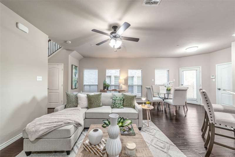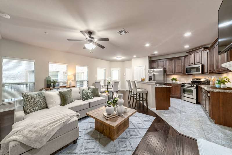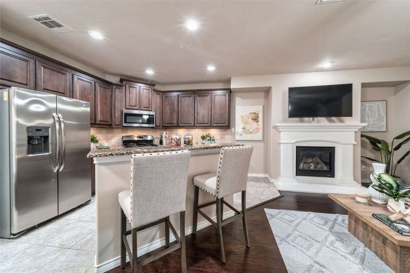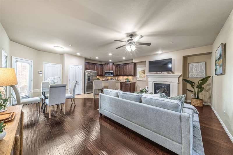 Fantastic location in a quiet, well-maintained townhouse community! This freshly painted and beautifully maintained home is move-in ready. The open-concept first floor features a spacious kitchen, dining, and living area centered around a cozy gas fireplace. The kitchen offers ample countertop space, a gas range, stainless steel refrigerator, and a large pantry. A first-floor bedroom, also perfect as a bright home office, includes a walk-in closet and an adjacent full bath. Upstairs, youll find a large second living area, two generously sized bedrooms with walk-in closets, a full bath and laundry room. The light-filled oversized primary suite is a true retreat, featuring an ensuite bath with dual vanities, a garden tub, separate shower, and an exceptionally large walk-in closet. An oversized garage provides plenty of extra space, and a small patio off the main living area offers a peaceful spot to relax. The neighborhoods one-way-in, one-way-out design provides added privacy and peace of mind. HOA covers the roof and front yard maintenance for easy, worry-free living.