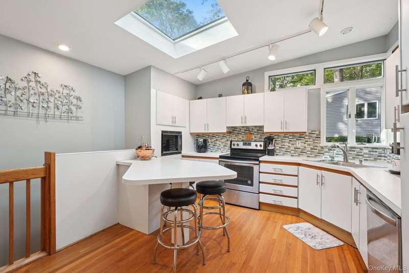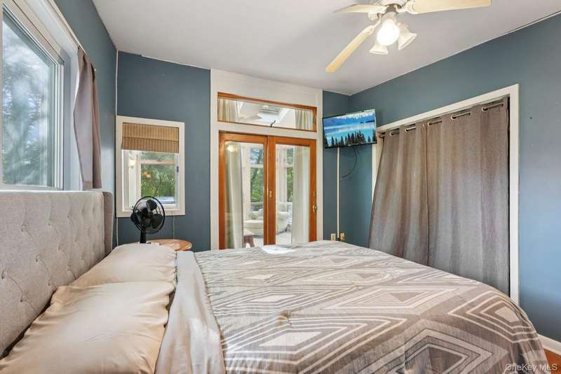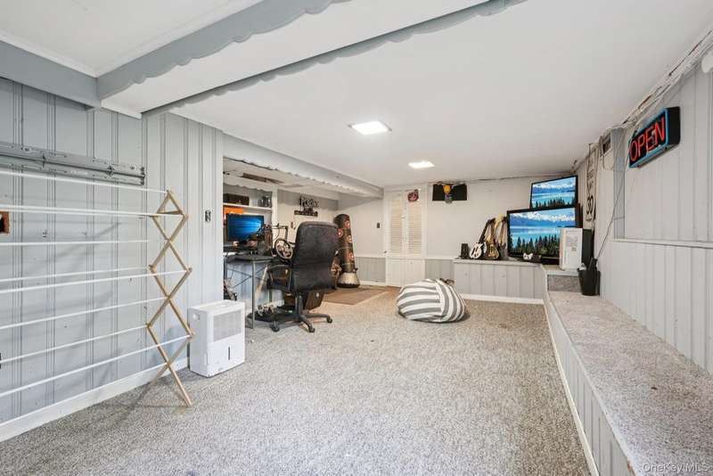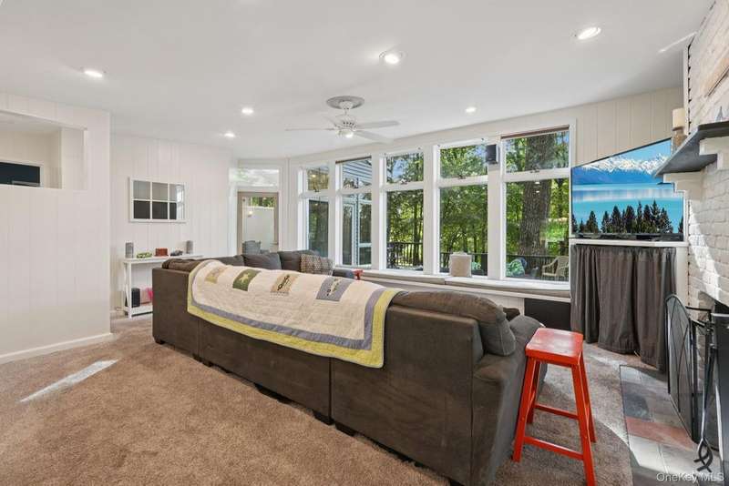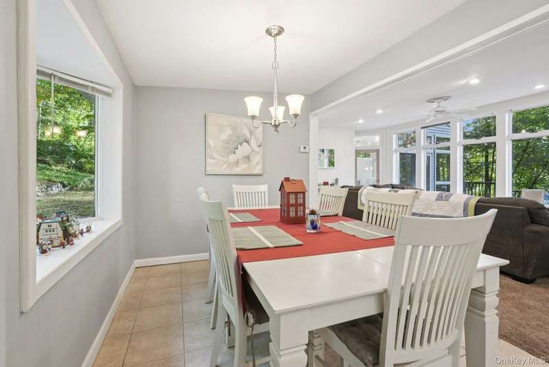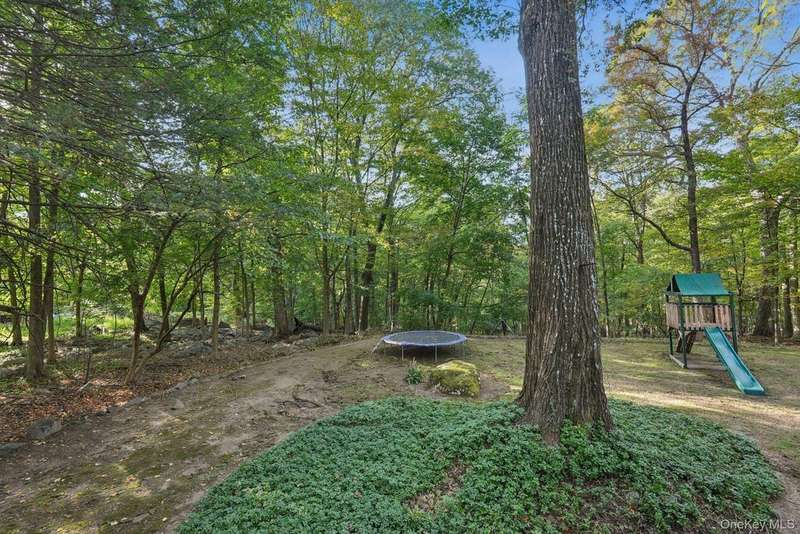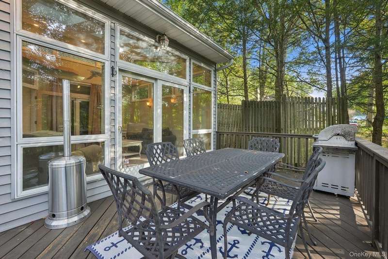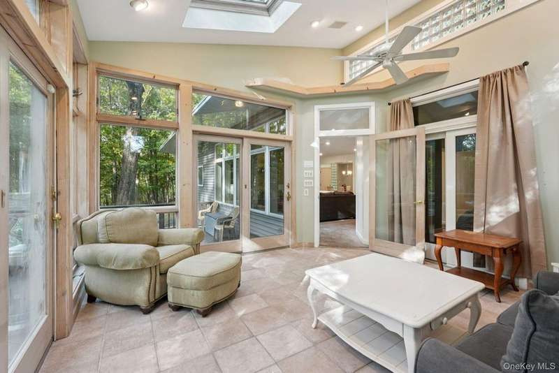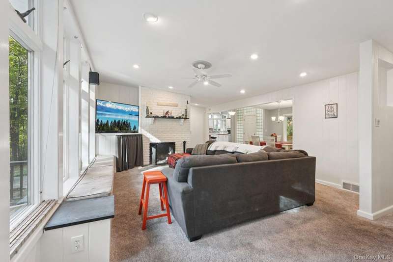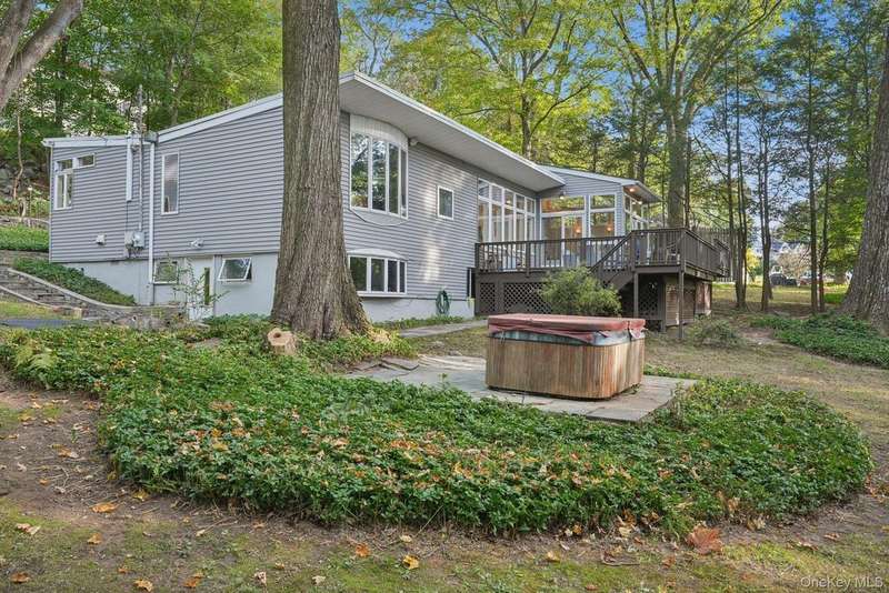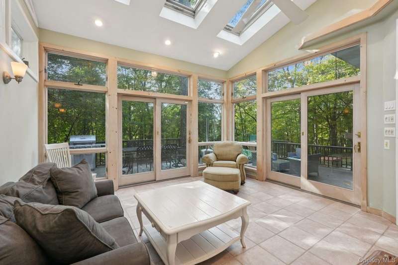 Don't miss the opportunity to own this unique property that offers privacy, views, and exclusive lake access. Welcome to a private contemporary ranch offering the perfect blend of modern living and natural serenity. Situated on a beautifully landscaped property, this home boasts seasonal water views and overlooks a 50-acre wooded greenbelt, ensuring a tranquil, picturesque setting. This 3 bedroom, 2.5 bath home features a spacious, open-concept floor plan, ideal for family fun and entertaining. The living room is the heart of the home, showcasing a cozy fireplace and dramatic oversized windows. Culinary enthusiasts will adore the sun-lit eat-in kitchen. Off the main living area, a gorgeous 4-seasons sunroom provides a peaceful retreat and opens directly onto a large entertainment deck with truly great views?perfect for al fresco dining or morning coffee. The home also includes a partially finished basement offering incredible flexibility. This expansive space with seperate entrance could serve as a dedicated home office or business center, an ideal in-law space or the ultimate man cave. Outside, you'll find a detached 4-car tandem garage, providing ample storage for vehicles, hobbies, or equipment. Best of all, this property comes with deeded lake rights to the sought-after Lake Mahopac, including access to a 100-foot sandy beach?your passport to summer fun!