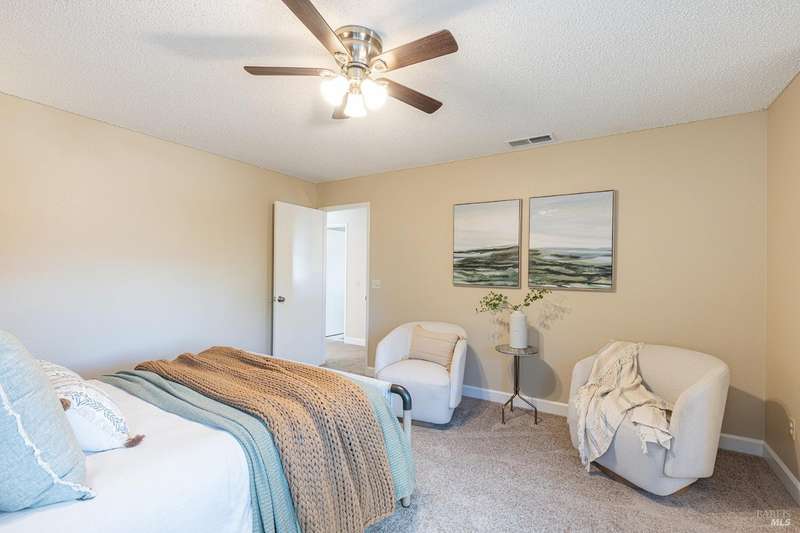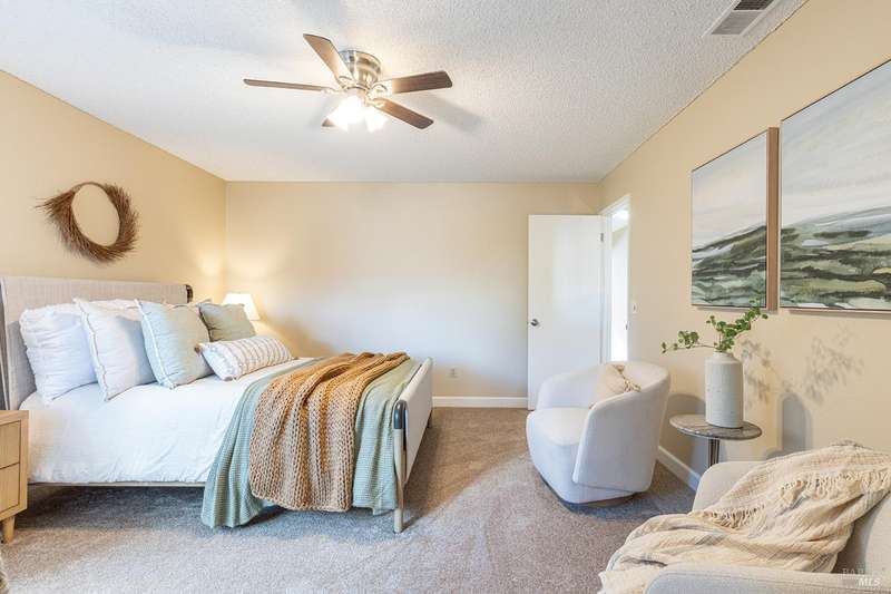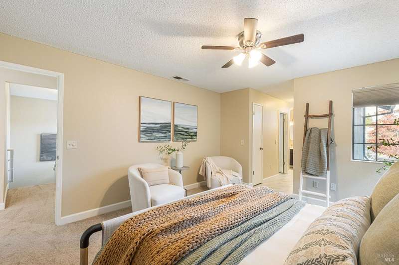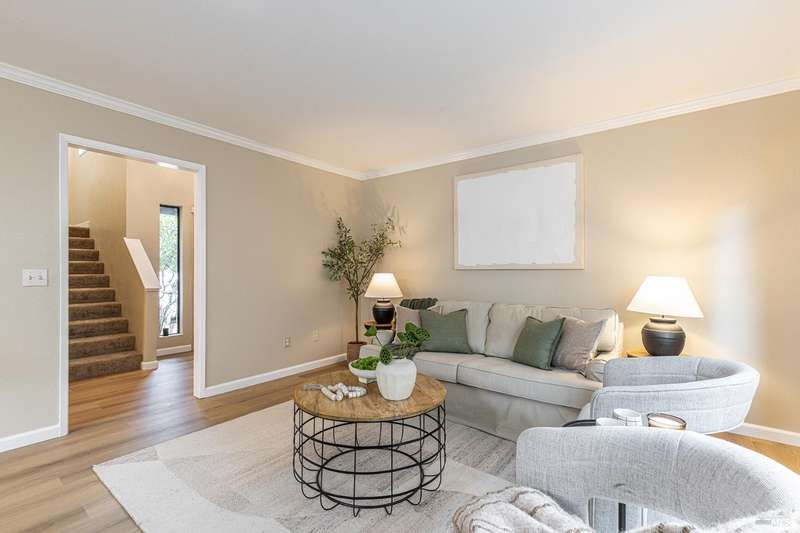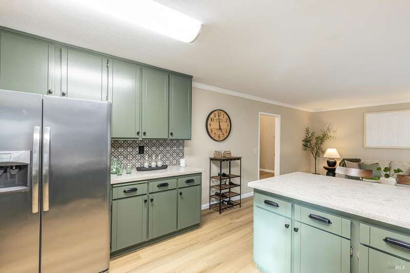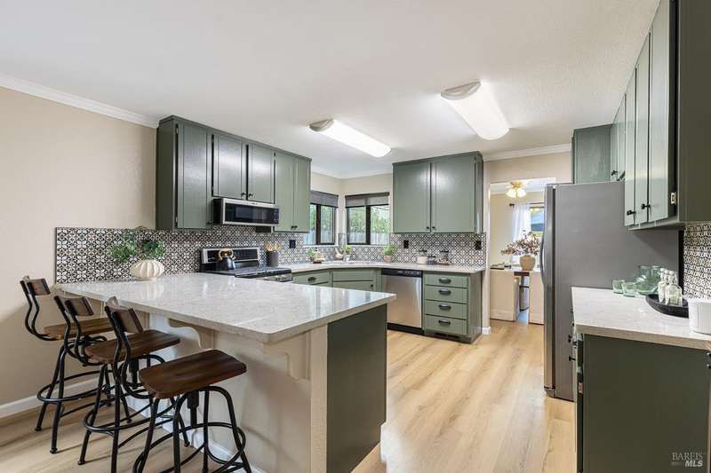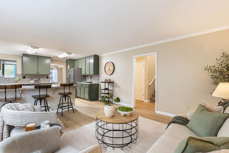 Located just minutes from Sonoma State University, this multi-level home offers space, comfort, and charm. Step inside to a welcoming open foyer that flows into the spacious country kitchen a large, informal space designed for both cooking and gathering. With newer cabinets and flooring, it's perfect for sharing meals, conversation, and connection. Whether you're sitting at the kitchen counter or cooking up something delicious, everyone can be part of the action. The living room features a cozy wood-burning fireplace surrounded by windows, creating a warm, light-filled retreat on the main level. Upstairs, you'll find the primary bedroom at the front of the home, complete with vaulted ceilings, a unique circular window, generous closet space, and an ensuite bathroom. Beyond that are three additional bedrooms each nicely sized and situated toward the back of the home for added privacy and flexibility. Rounding out the property is a two-car garage and a backyard with a grassy area and a small patio perfect for relaxing or entertaining.