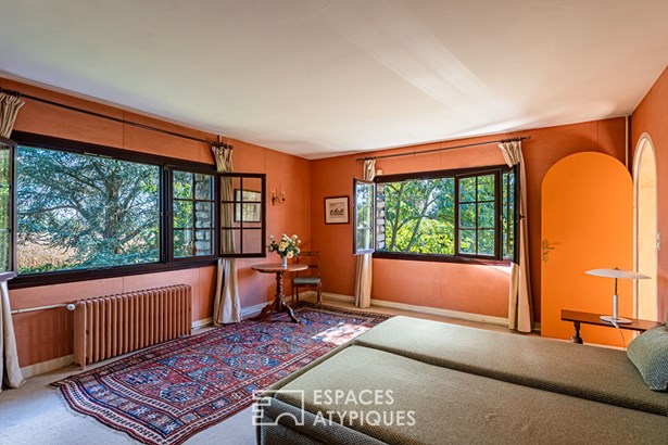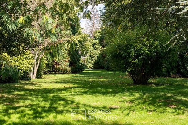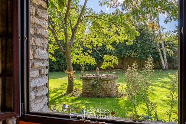 Through the high gate, you discover a pleasantly landscaped courtyard with low walls, followed by the meticulously flowered garden, its majestic trees, its well, and the large building with its stone walls and Virginia creeper, opened by large bay windows.