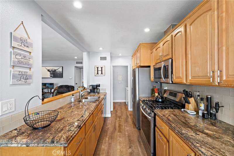 New improved price! Beautiful Upper-Level End Unit in Mission Viejo - this charming 2-bedroom, 1.25-bath condo is located in one of Mission Viejo's most desirable communities and has LVP flooring throughout. The light-filled living area features recessed lighting and an open layout connecting seamlessly to the upgraded kitchen with granite countertops, shaker cabinets, and modern hardware. The primary suite offers a large window with a view of the mountains, private vanity, and a recently updated walk-in closet, with direct access to the shared full bath. A convenient laundry room near the kitchen fits a full-size washer/dryer with additional cabinet storage. Relax on the spacious patio, perfect for outdoor dining and entertaining. Parking includes a one-car garage with overhead storage and an additional assigned space just steps away. Community amenities include a pool, wading pool, playground, and tot lot, with nearby award-winning schools, shopping, and dining. Residents also enjoy exclusive Lake Mission Viejo membership.