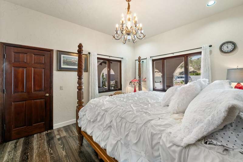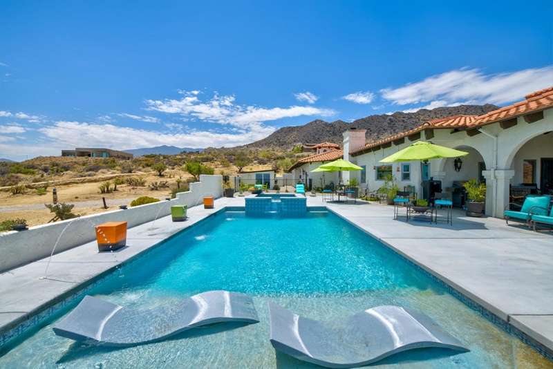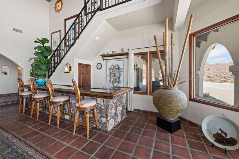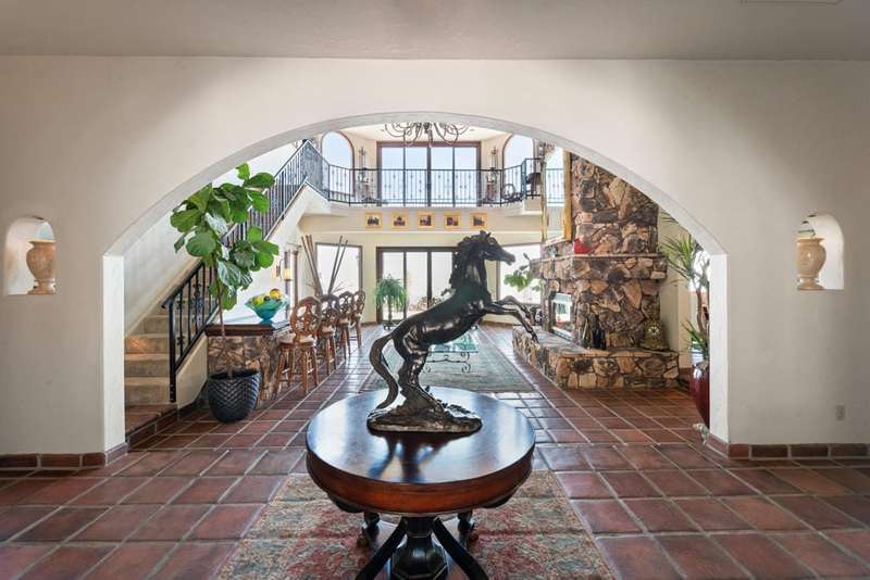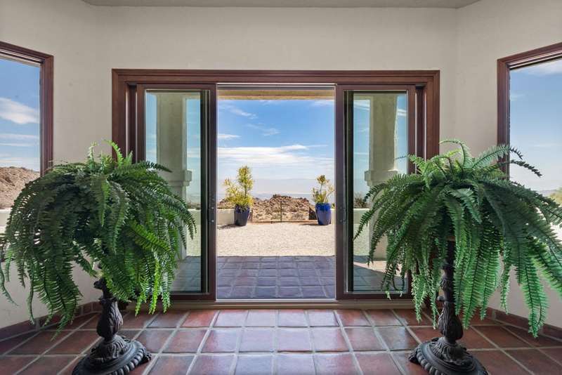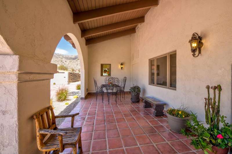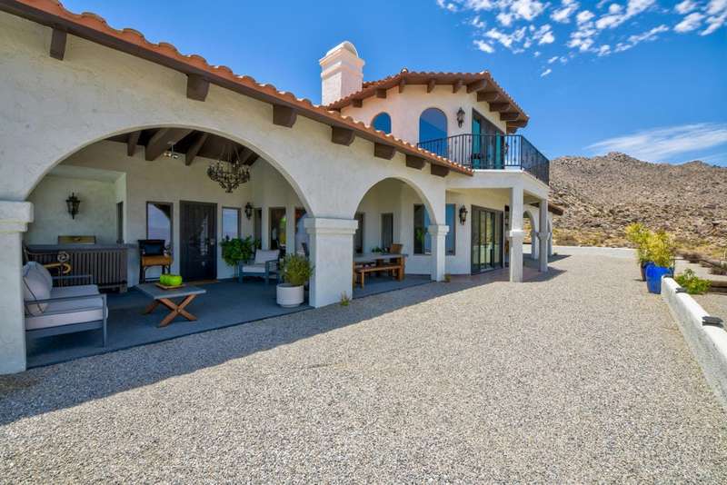 Santa Barbara asymmetrical design with a connection to Nature. A private road leads to this Hillside Retreat on 3 acres with commanding views of the valley and mountains as far as the eye can see. A private motor court winds around to the loggia and decorative tiled entry. Massive double doors, an intricate design of wrought iron and glass, open to the foyer with grand, yet inviting proportions. The timeless appeal of hardwood floors, Saltillo tiles, stone fireplace and the beauty of wood beams are designed to harmonize with it's surroundings. A spacious layout offering lounging and dining spaces with modern day conveniences and energy efficiency. 3,735 square feet, three bedrooms, three and a half bathrooms. Beautiful, arched double wood doors welcome you to a Den/Office off the tiled corridor. The warmth and character of the interior is highlighted by polished wood trim against white walls and a comfortable integration of living and relaxation. A covered loggia welcomes the enjoyment of outdoor dining, relaxation and spectacular views. A recently installed custom, salt water pool with water features and pool house is the sumptuous decadence to top off this hillside retreat. A Cupola adds filtered light to the oversized, four car garage with four storage areas and direct access to the home. Within a twenty minute drive to the Dining, Boutiques and Art Galleries along fashionable El Paseo, in Palm Desert, Royal Carrizo, with only 22 homesites, offers privacy and a peaceful connection to Nature.