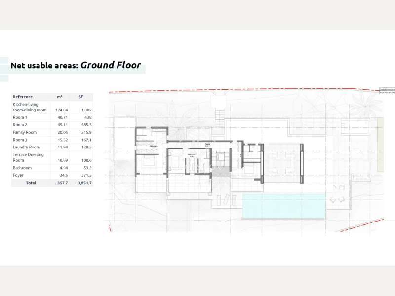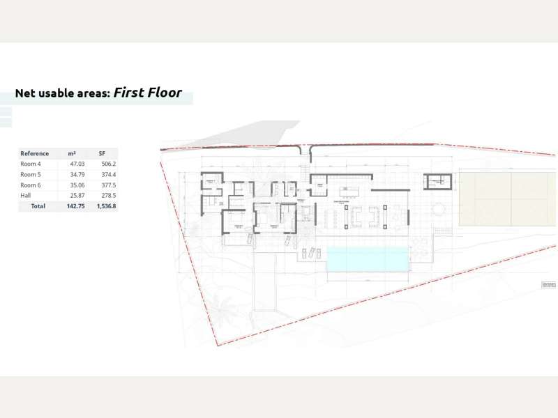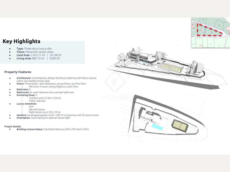 This plot offers an exceptional opportunity to create your dream home in one of Ibiza’s most desirable locations. With the building license soon in place, construction can begin this year (2025), allowing you to bring this vision of coastal luxury living to life. Located just 27 minutes from the airport, this prime piece of land offers panoramic sea views, lush greenery, and an exceptional opportunity to build a high-end property with top-tier amenities, including an outdoor pool, gym, spa, and private padel tennis court. - Location: 6 minutes from San Antonio Ferry, 8 minutes from Cala Salada, and 27 minutes from Ibiza airport - Building Licence: Approved in a few months and ready for immediate construction (licence requested in February 2024, expected to be valid by Q3 2025) - Plot Size: 2,425.71 m² - Planned Structure: Three-story luxury villa with a total living area of 882.73 m²