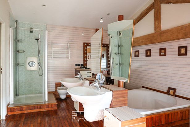 For the sleeping area, an office and two bedrooms share a bathroom. Also, a real surprise of the house, a relaxation area with a beautiful swimming pool and a hammam to stay zen all year round. The upper floor offers a master suite with private bathroom, as well as three additional bedrooms and a leisure area.