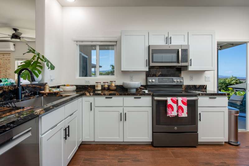 The kitchen is the heart of the home, featuring Magma Black granite counters, modern appliances, an expanded pantry, and a new breakfast bar with storage—all perfectly positioned to take in ocean views, creating an easy indoor-outdoor flow.