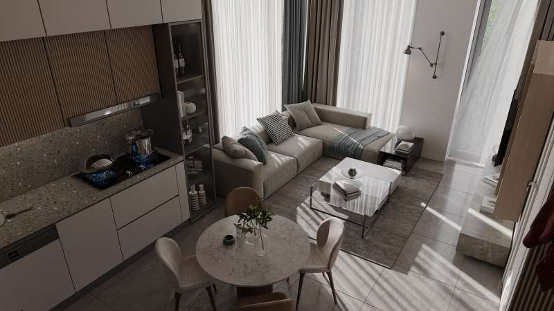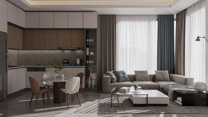 These properties for sale in Alanya are equipped with quality materials, including suspended ceilings, washable wall paint, ceramic tile flooring, double-glazed PVC windows, and aluminum and glass balcony railings.