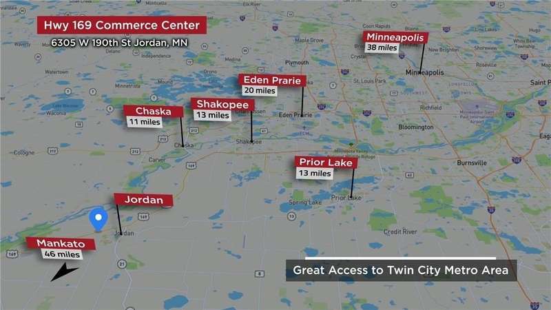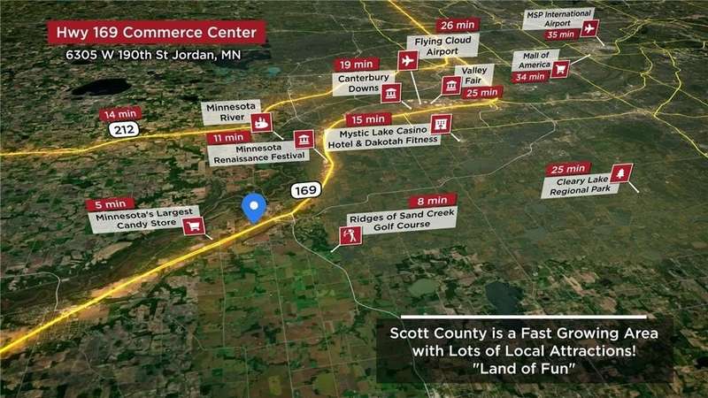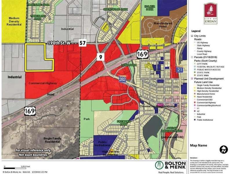 Great location near New Jordan planned Interchange. 32 -/+ acres guided for the Light Industrial. Additional Commercial land available. Up to 107 acres -/+. Just south of Shakopee off Hwy. 169. Easy access to Hwy 212 & Hwy 169. Split options available.