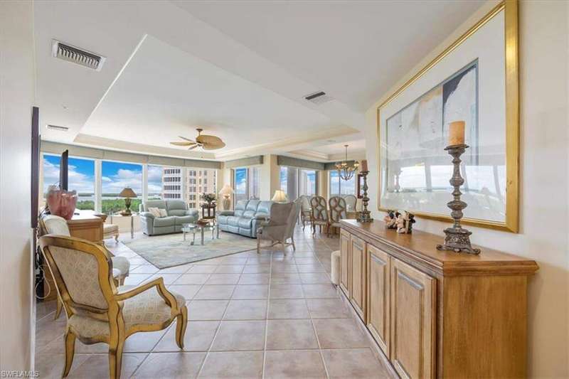 Enjoy breathtaking sunsets and sweeping views of Estero Bay and the Gulf from this 7th-floor end residence in the prestigious Vistas Tower at Bonita Bay. Thoughtfully designed for both comfort and entertaining, this spacious home offers over 3,000 total square feet, including three bedrooms and three full baths. The light-filled floor plan features a great room that flows seamlessly into the large dining area - all framed by stunning water views. The wraparound screened lanai provides true year-round indoor/outdoor living. The well-designed kitchen overlooks the Gulf and adjoins a cozy breakfast nook, perfect for casual dining. Each of the three bedrooms enjoys private terrace access, while the guest bedrooms are tucked away in a separate wing for added privacy. The owner's suite offers two walk-in closets and a luxurious bath with dual vanities, a soaking tub, and a separate walk-in shower. Additional highlights include newer ac and water heater, two assigned parking spaces, and a climate-controlled storage unit. The Vistas Tower has recently completed extensive updates, including a new roof, elevator enhancements, refreshed landscaping, and beautifully upgraded amenities. Residents enjoy a social room, fitness center with saunas, workshop, two guest suites, and an elevated pool and spa-perfect for relaxing under the Florida sun. Set within the gated community of Bonita Bay, residents have access to miles of walking trails, community parks, pickleball and tennis courts, a boat dock, and a private beach shuttle-conveniently stopping right outside your door. Optional membership at Bonita Bay Club offers an unparalleled lifestyle with five championship golf courses, world-class tennis and pickleball, a luxurious spa and fitness center, multiple dining venues, and a full-service marina with over 400 boat slips. Beautifully maintained, ideally located, and offering incredible value-this residence in Vistas Tower is a rare opportunity to experience the best of Bonita Bay living.