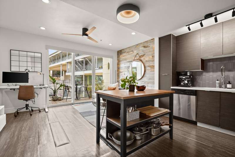 Contemporary condo with bright, open living space. Large bedroom with walk-in closet. Bath with double vanity and walk-in shower. Large covered balcony has expansive views to the south. Stacking washer/dryer provided. Fitness center, resident lounge and yoga studio located on 7th floor (access using fob). Large dog park and courtyard with gas grills and outdoor fireplace. Building is located near The Yard (St. Elmo’s Brewery, Still whiskey distillery, Spokesman beer and coffee, etc.). One assigned parking space provided on the 3rd floor of the secured parking garage. **2nd parking spot possible on month-to-month basis for $100/mo** Units #325 and #326 also available.