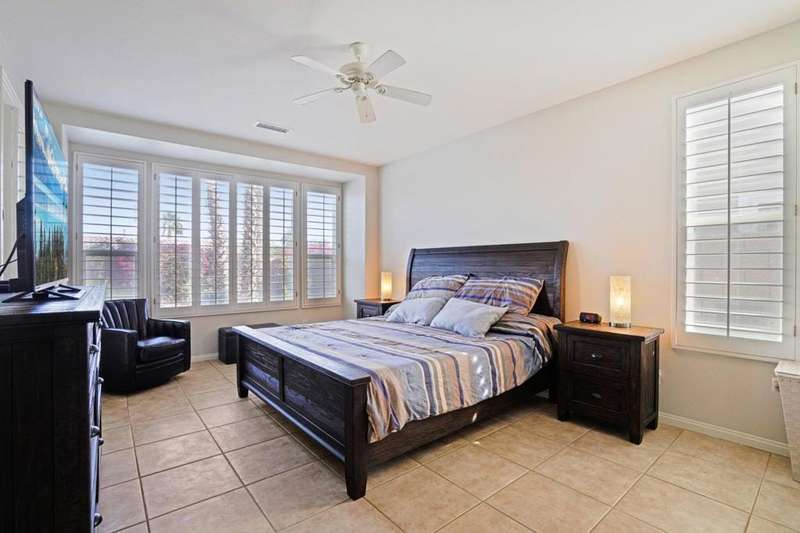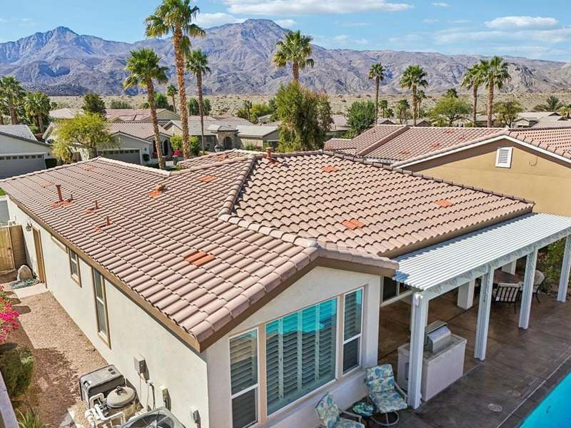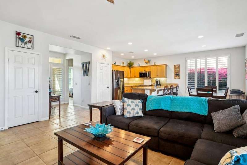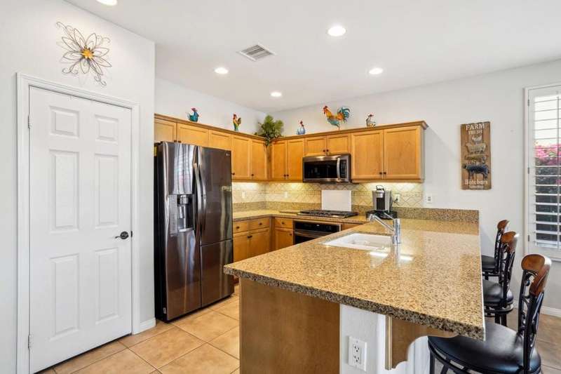 Step into resort-style sophistication with this impeccably maintained Maurea plan nestled behind the gates of Trilogy La Quinta, an exclusive 55+ paradise. This stunning 1,386 sq. ft. retreat, offered TURNKEY furnished with golf cart, offers 2 bedrooms, 2 bathrooms, and an inviting sparkling saltwater pool, perfect for ultimate relaxation. Designed for seamless indoor-outdoor living, the open-concept great room boasts picturesque pool views, a TV/media niche, elegant plantation shutters, and sleek tile flooring throughout. The adjacent chef's kitchen dazzles with upgraded black stainless-steel appliances, slab granite countertops, a gas range, custom backsplash, and a convenient breakfast bar--ideal for casual dining. The primary suite is a tranquil escape with direct French door access to the pool, an en suite bath featuring dual vanities, a large shower enclosure, new 'comfort height' toilets (in both baths) and mirrored closet doors. Guests will feel right at home with their own private quarters. Outside, entertain in style with a built-in BBQ station, expansive pergola, and a spacious concrete deck--all set against the backdrop of La Quinta's stunning landscape. Just moments from the Santa Rosa Clubhouse and world-class amenities, this is desert living at its finest!