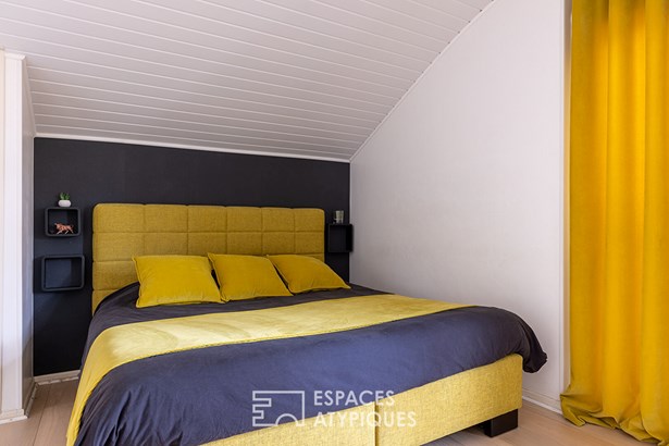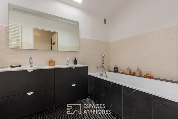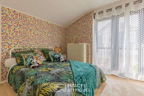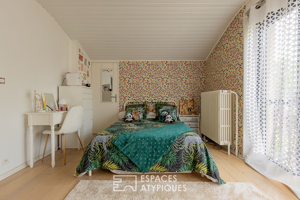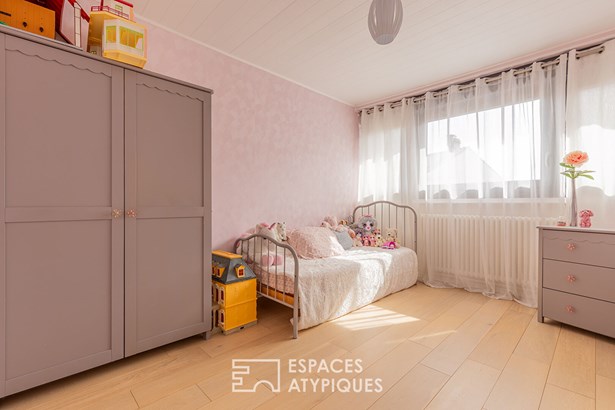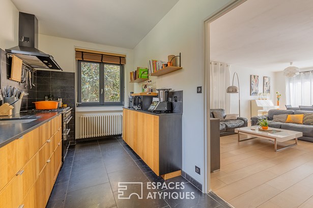 A comfortable vestibule adorned with seventies wallpaper recalls the origins of the house and leads to the various rooms on the ground floor. The living room, with its solid oak parquet flooring, is warmed by a fireplace combining marble and wood. It is extended by a kitchen featuring wood and granite worktops. It opens onto a vast, sheltered terrace, nestled in greenery and accompanied by a garden. A shower room and three bedrooms are located on this level.