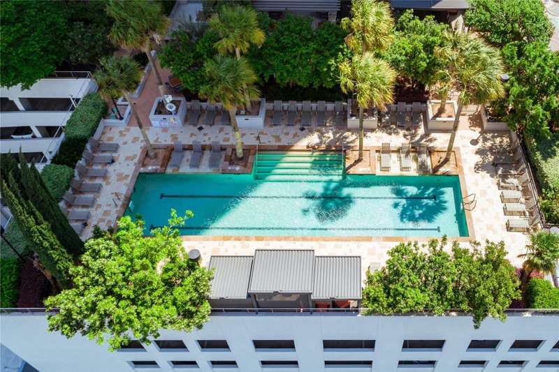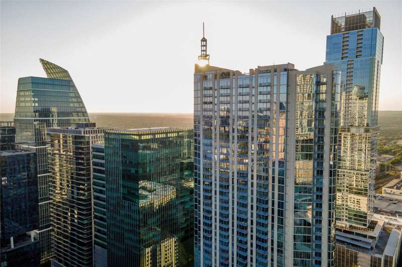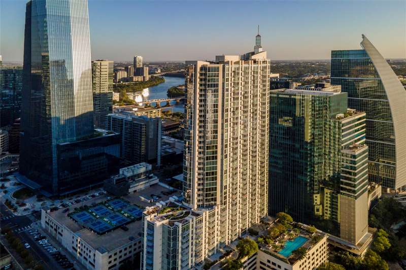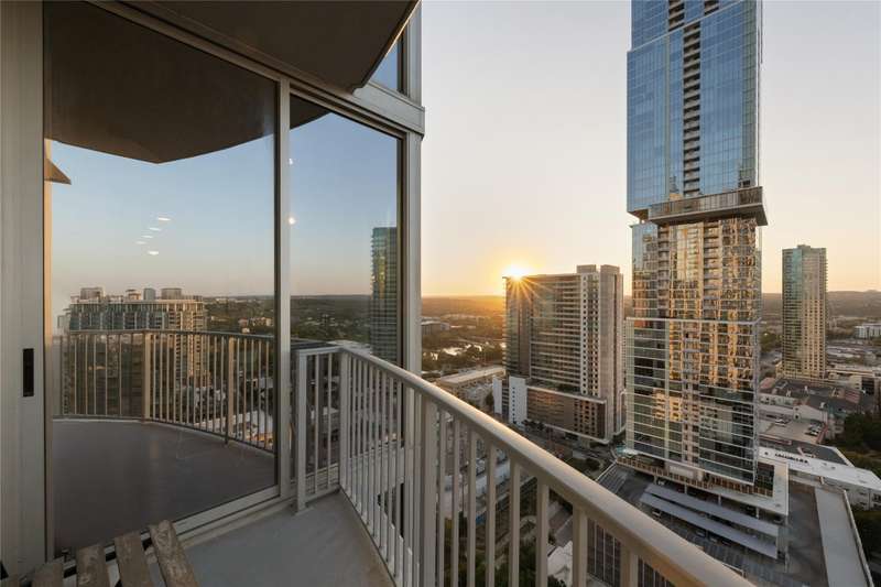 Welcome to the skyline. // Sitting high above the heart of downtown Austin, Residence #2610 at 360 Condominiums captures the essence of modern urban living: bold architecture, wide-open space, and skyline views that never stop. Situated on a corner of the building and framed by walls of glass, this one-of-a-kind floor plan seems to float above the city with panoramic vistas, from the glittering towers of downtown to the horizon. // Inside, industrial blends with natural: exposed concrete ceilings/walls, rich Brazilian cherry hardwood, granite counters, honey-toned wood cabinets, stainless steel appliances, and a striking black subway tile backsplash that reflects the caramel sunset glow. // The open-concept living/dining room opens to a private balcony, the perfect perch for morning coffee or evening wine while the city lights begin to sparkle. The spacious bedroom features oversized windows and direct access to the bath, complete with a soaking tub. // 360 Condominiums offers residents an exceptional amenity suite: 24-hour concierge, resort-style pool and sundeck, outdoor grill, theater room, gym, club lounge, and dog-run, all within a controlled-access environment. Located in the vibrant 2nd Street District, the building is steps from Trader Joe's, Whole Foods, and a curated mix of restaurants, cafes, and cocktail lounges. // With a reserved, gated garage space next to a column and easy access to major connectors, 360 #2610 delivers the perfect combination of convenience, privacy, and breathtaking views, making it one of downtown Austin's most compelling one-bedroom offerings.