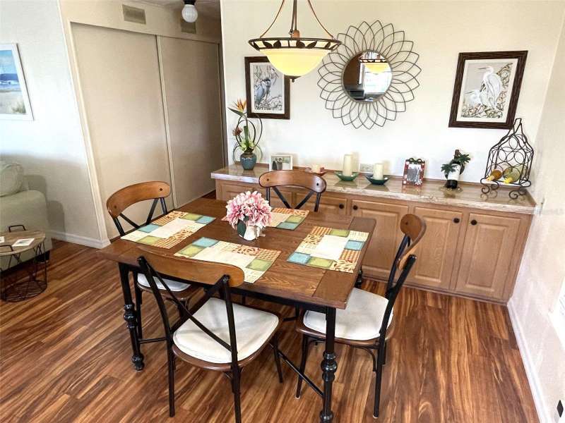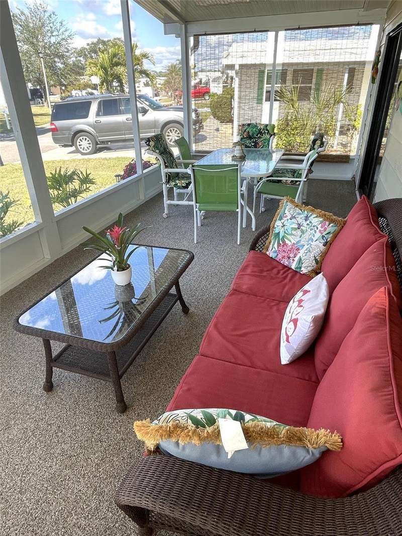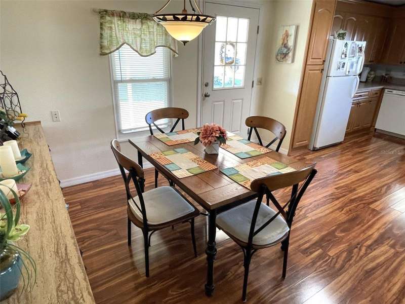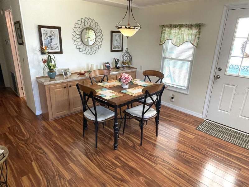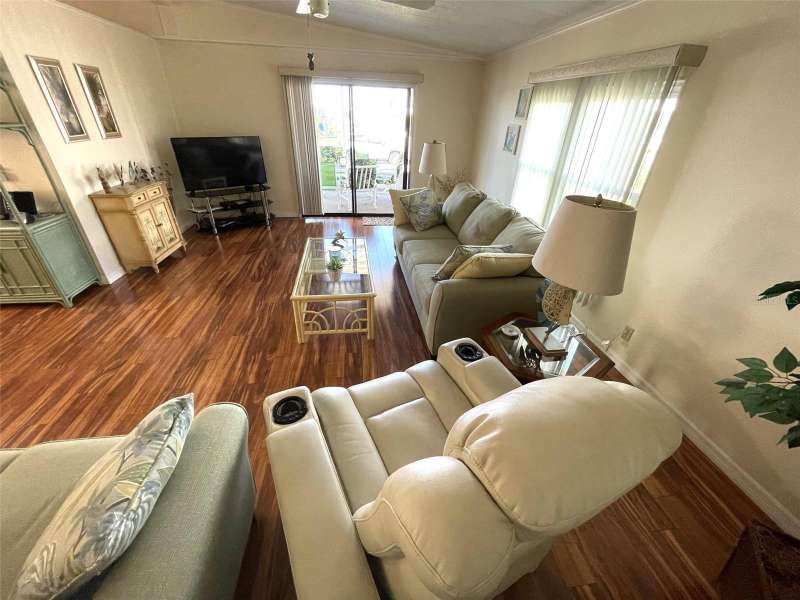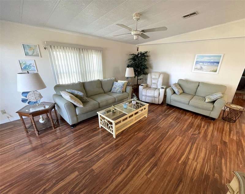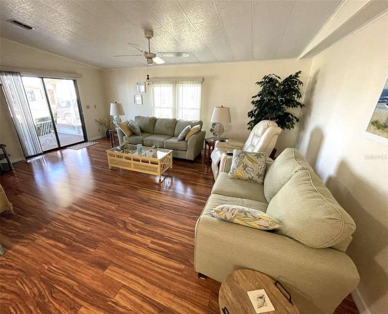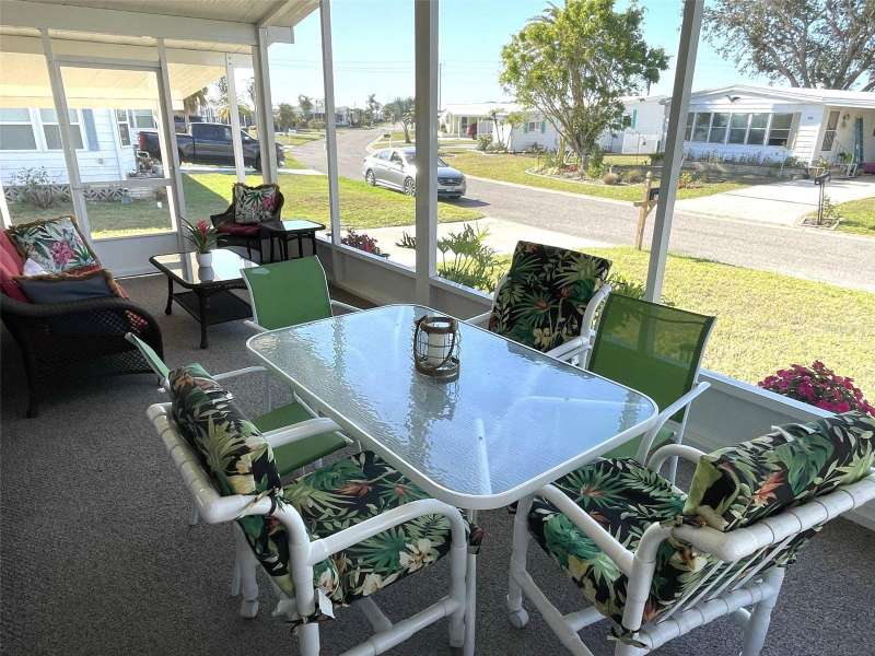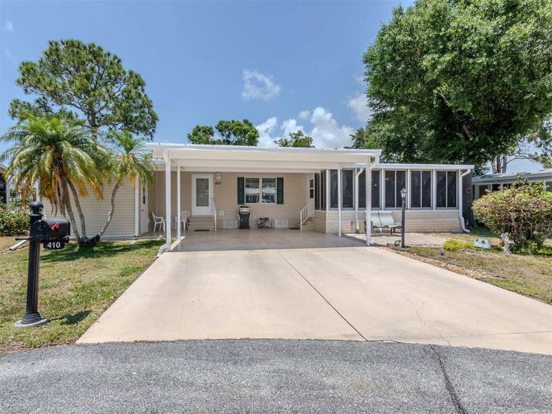 Lovely turn-key furnished, 2 bedroom home with welcoming curb appeal in the premier community of Harbor Isles. Harbor Isles is a land owned, pet friendly, retirement community with five star amenities and activities year round. The marina includes boat slips, boat launch, canoe/kayak launch, fishing station, pavilion and an active boat club. Upon entering the home you will love the open concept with vaulted ceilings, beautiful Pergo floors, updated honey oak kitchen cabinets and matching dining room cabinet storage. Both bedrooms have walk-in closets, the primary bedroom enjoys an en-suite bath. Both bathrooms have tile floors, new toilets and lighting. The guest bedroom is just steps from the guest bath. Direct access from the living room to the new screened front lanai that is great for sipping your morning or evening beverages and people watching! The shingle roof and carport were installed 2023. Hot water heater has been replaced and is located in the spacious double shed. Ten tie downs replaced in 2013, A/C 2025 and all windows except the kitchen have been replaced. The entire living area has plywood sub-floors. Convenient to beaches, shopping, dining, Atlanta Braves ball field, downtown Wellen Park, Sunseeker Resort, interstate and airports. Call today for your personal or virtual viewing.