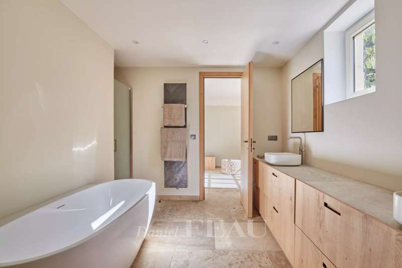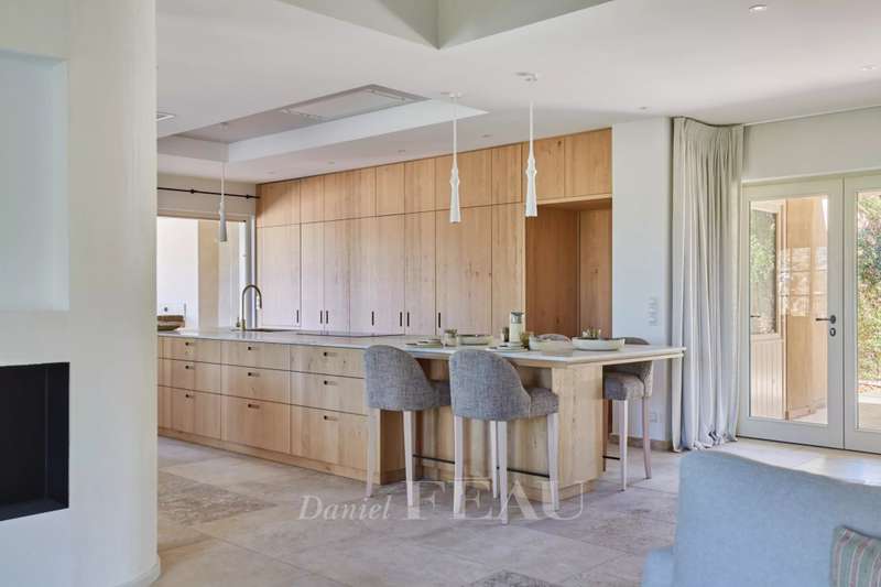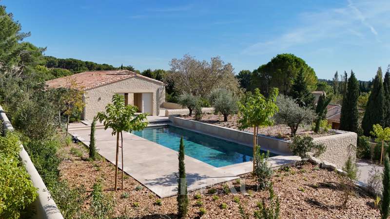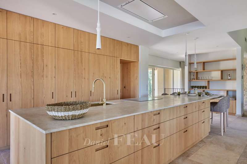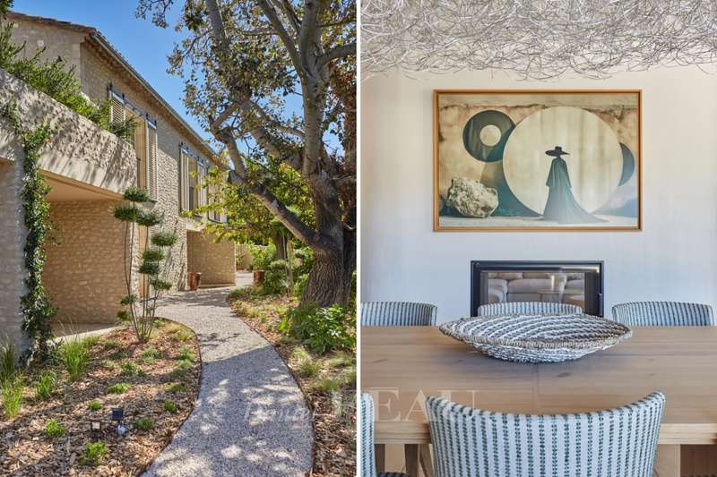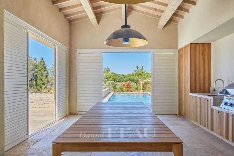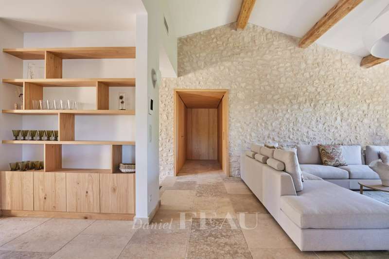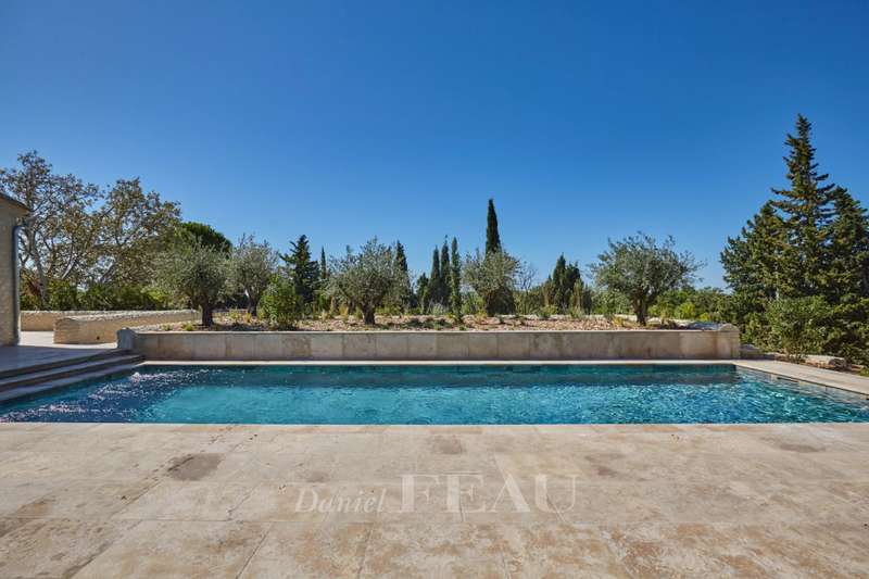 This elegant 460 sqm stone-built property in a peaceful location in the immediate vicinity of Maussane les Alpilles was renovated throughout in 2025 allying authentic architecture with contemporary comfort. A spacious entrance hall with a cloakroom, a utility room and a wine cellar leads to five spacious suites each with a bathroom and a dressing room, and a home cinema with a bar. Accessed by means of a lift or a staircase, the upper floor comprises a spacious living/reception room bathed in sunshine and separated from a dining area by a double-facing fireplace, and a fully equipped kitchen with a pantry opening onto a covered terrace with a summer kitchen with a barbeque and a dishwasher, ideal for al-fresco dining. Set in about 1600 sqm of terraced grounds with a 14.50 x 4.50 swimming pool enjoying an open view, several terraces and a boules pitch. With three lock-up garages and outdoor parking spaces.