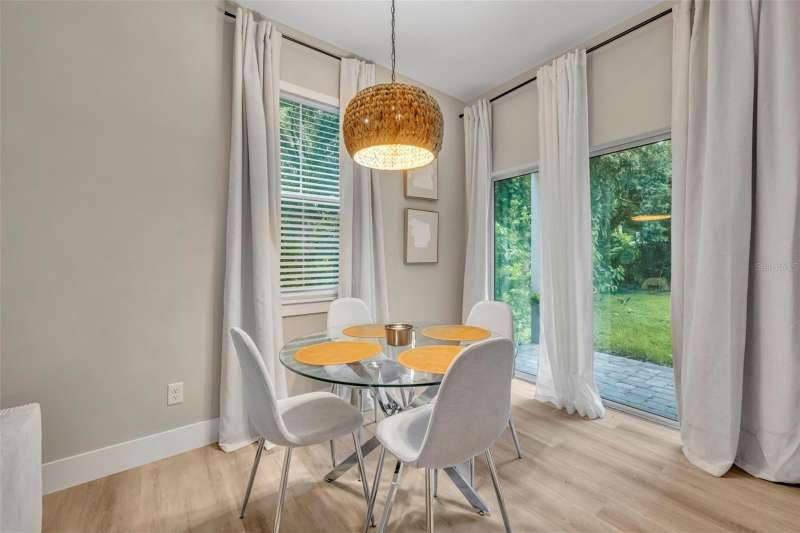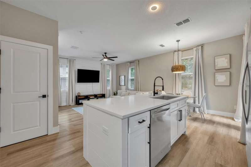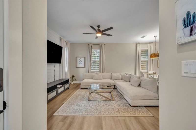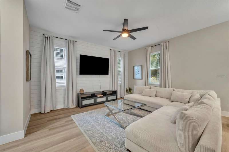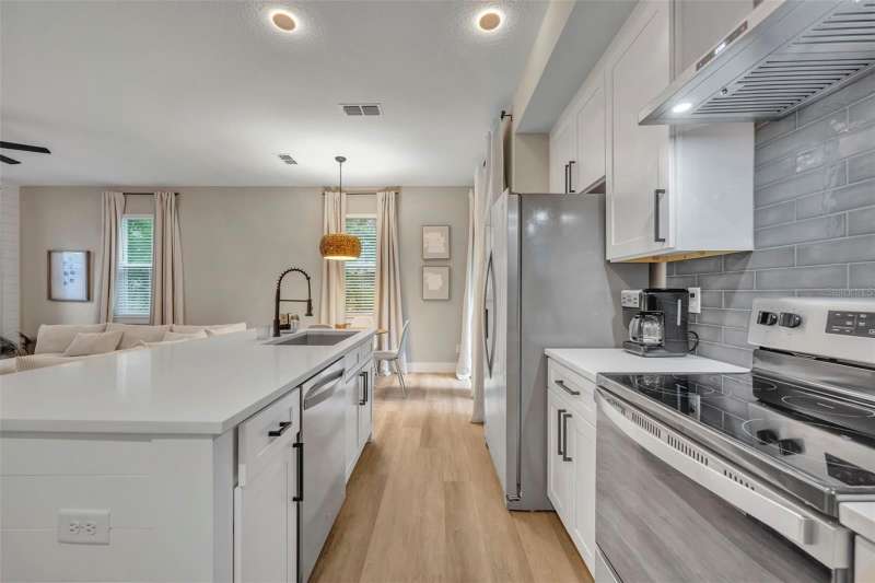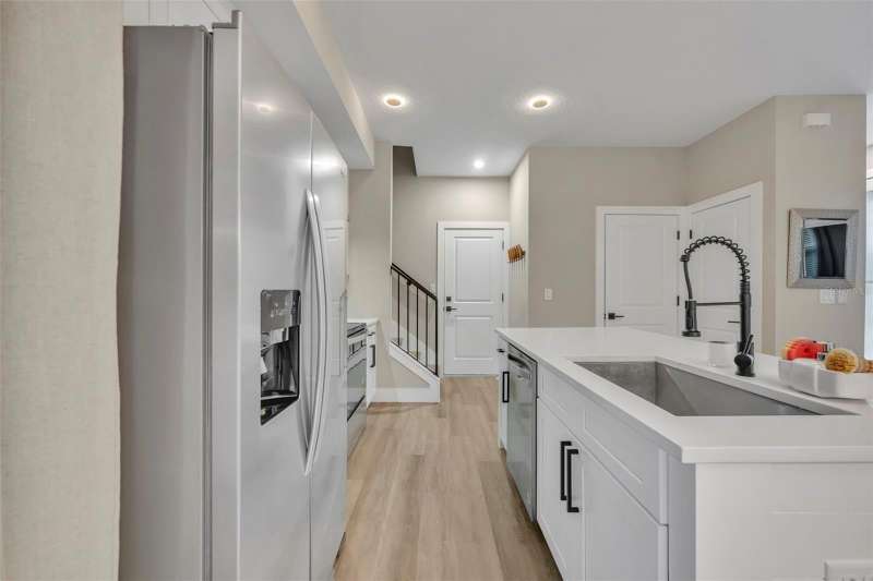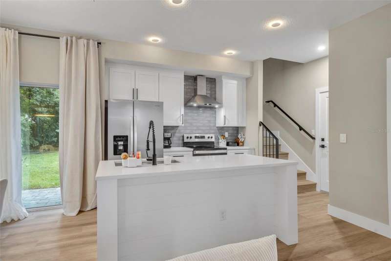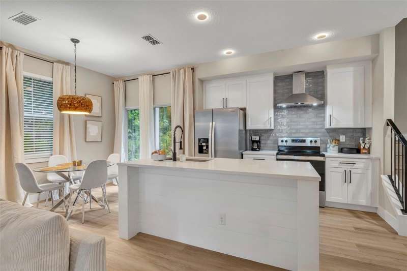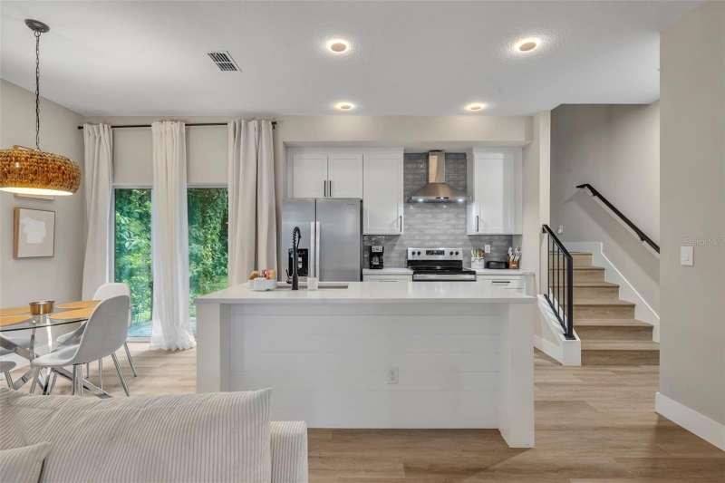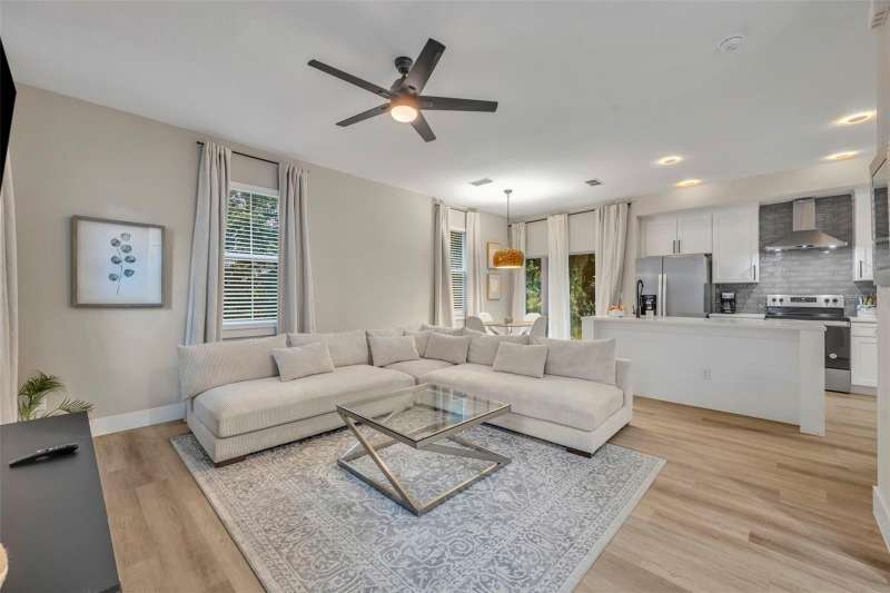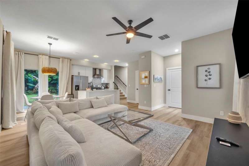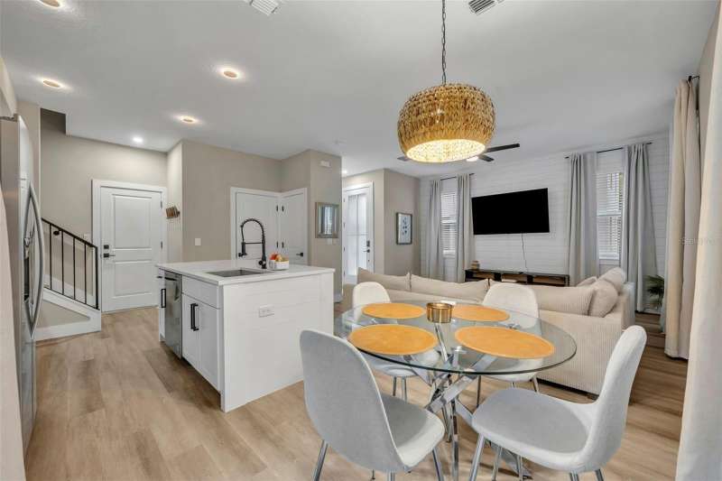 Experience refined urban living in this beautifully furnished 3-bedroom, 2.5-bathroom townhome, ideally located in Orlando’s vibrant SoDo district. Built in 2023, this modern residence features an open-concept layout with soaring ceilings and luxury vinyl plank flooring throughout. The gourmet kitchen serves as the heart of the home, offering quartz countertops, stainless steel appliances, soft-close cabinetry, a walk-in pantry, and a spacious island—perfect for entertaining. Upstairs, the primary suite provides a serene retreat with a walk-in closet and a spa-inspired en-suite bathroom, complemented by two additional bedrooms, a full bath, and a conveniently located laundry room. Outside, enjoy a private patio and the practicality of a two-car attached garage with additional driveway parking. Set on a quiet, tree-lined brick street with no HOA, this exceptional home places you just minutes from Orlando Health, the Dr. Phillips Center, Lake Eola, Publix, Super Target, and a variety of premier dining and entertainment options. Blending contemporary style, everyday comfort, and a walkable location, this townhome offers the perfect balance of luxury and convenience.