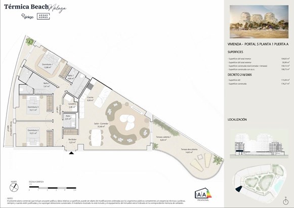 Térmica Beach is an exclusive beachfront residential complex located on Málaga’s New Golden Mile, in a vibrant and rapidly growing city. Its privileged location offers spectacular views of the Mediterranean and an unparalleled setting to enjoy the sea, leisure, and gastronomy all year round, thanks to its exceptional climate.Strategically connected to the airport, the historic center, top golf courses, and the marina, Térmica Beach allows you to experience the tranquility of the sea without giving up the energy of the city.The project consists of 173 residences spread across seven elegant buildings, offering 1, 2, 3, and 4-bedroom options, as well as exclusive penthouses and duplexes with private pools and spacious terraces.The complex is complemented by extraordinary communal areas designed for comfort and relaxation, including an infinity pool overlooking the sea, a heated pool, a fully equipped gym, a spa with a sauna, a coworking space, a children’s area, and extensive garden