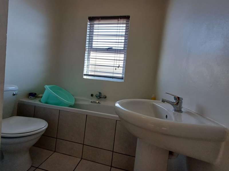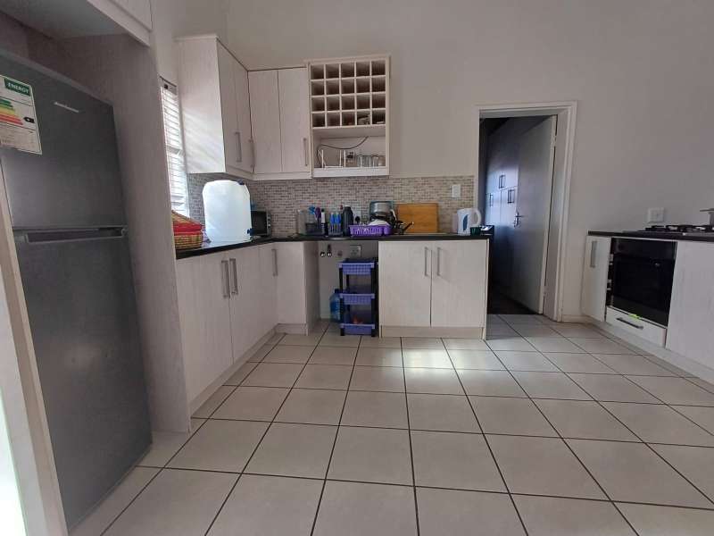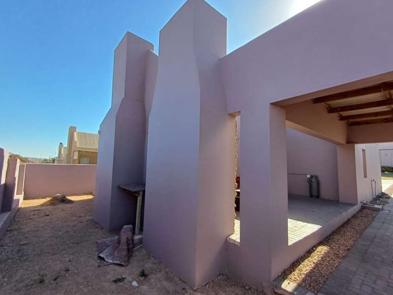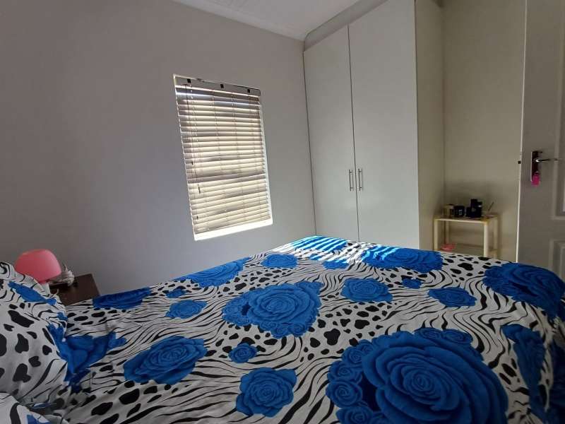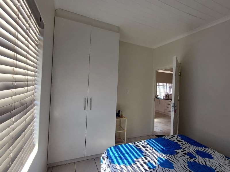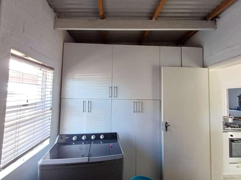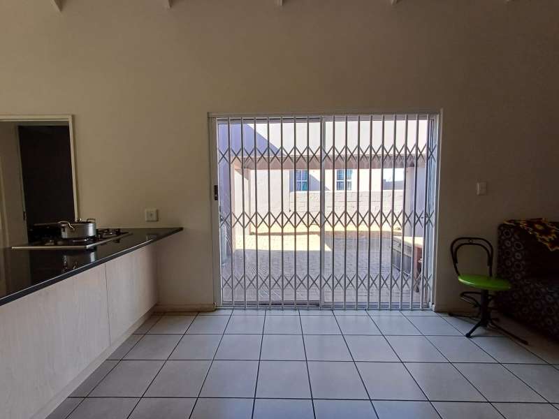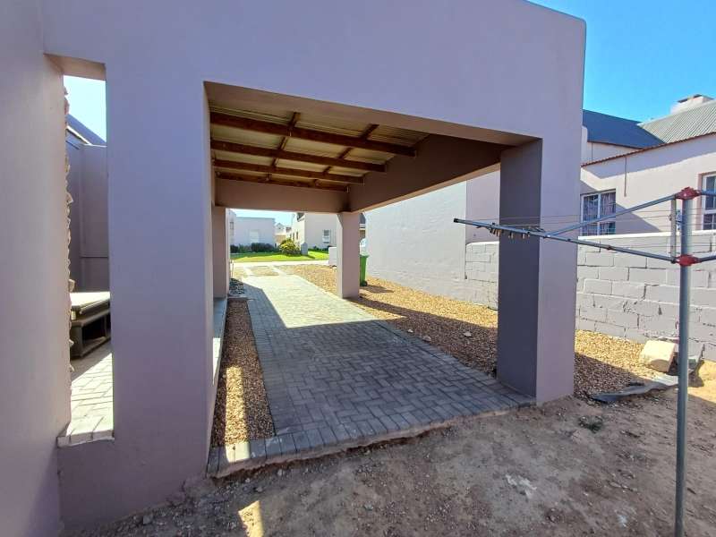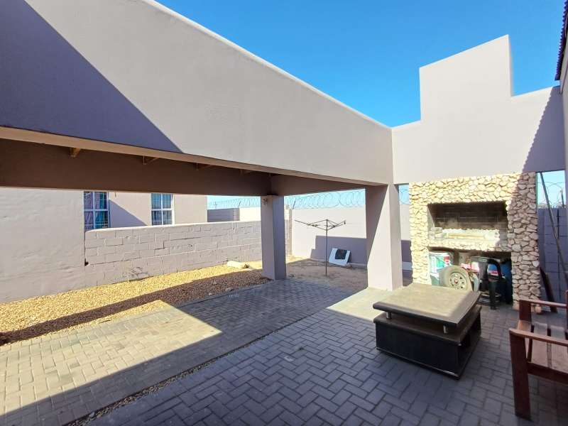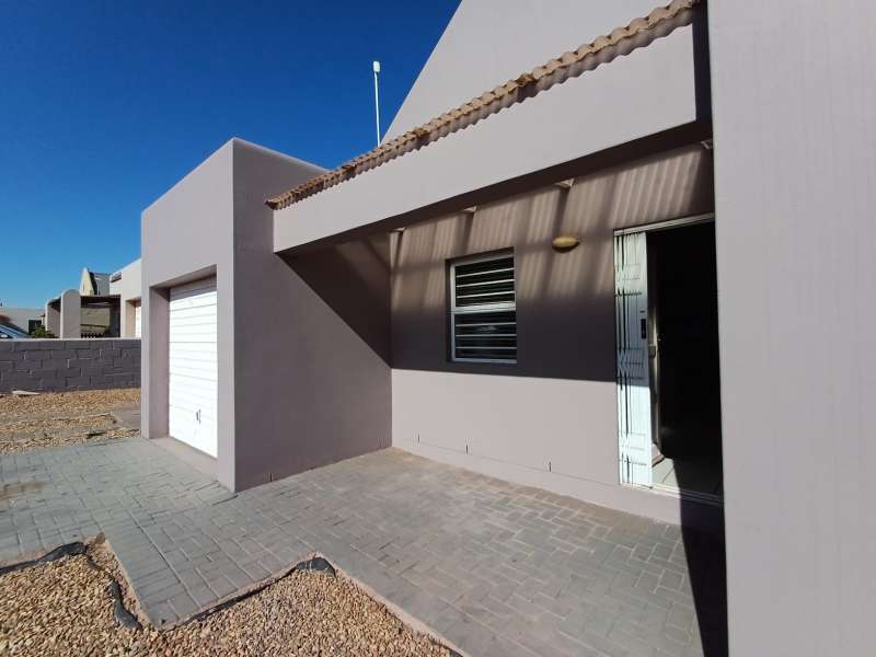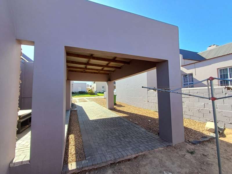 It is situated in a secure complex with gated access and fully walled around the complex. The house is in a cul-de-sac and are easily accessible from the entrance gate. From the front door you enter the house through the kitchen / open plan lounge area. On the right you have direct access to the single garage where there is a washing machine connection and geyser as well as extra cupboards for more storage space. The left-hand side of the kitchen is three bedrooms with built-in cupboards. The main bedroom is en-suite with a toilet, basin and bath. Family bathroom consists of a shower, toilet, bath and basin. A glass sliding door with security gate leads from the lounge to a small patio with an outside built-in braai. Burglar bars in front of all opening windows. Security gates in front of all doors leading to the outside. Built carport for extra vehicle parking.