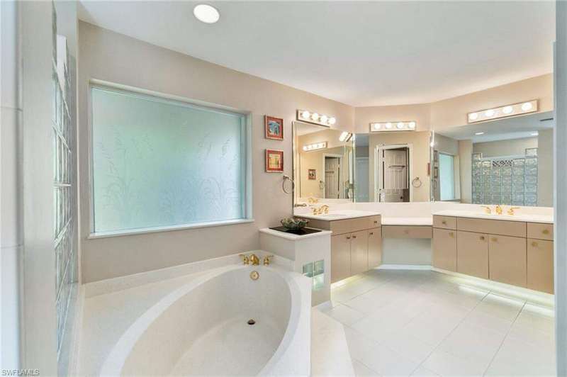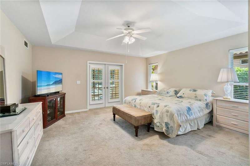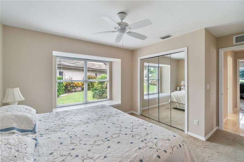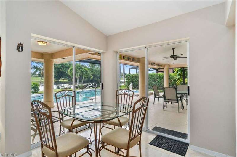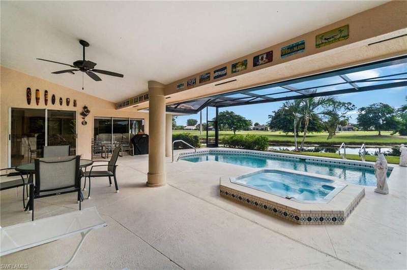 Excellent Floor plan with a Central Kitchen surrounded by a Large Family Room, Formal Living Room, Dining Room, Breakfast Nook, and easy access to a Large 689 sq ft. Covered Lanai for both Indoor and Outdoor Entertaining. This 3 bedroom, 2 bath, Pool Home is located on a Prime Lot offering Privacy and Southeast Views of the Lake and Golf course. The Vaulted Ceilings and Skylights, along with multiple sliders provides an abundance of natural lighting, and the split floor plan offers ideal privacy for guests. For increased safety and security, this house in located in an X-500 Flood Zone where Flood Insurance is Not Required. A New Tile Roof and large Picture Window Screen Enclosure were installed in 2023. Current Homeowners insurance is below $5,000 per year. The 600 sq ft garage has ample room for two passenger vehicles and a golf cart. Spanish Wells Country Club (membership is optional) offers a 27-hole golf course, tennis, fitness, bocce, and a variety of activities. This is an Ideal Location where community amenities, and ease of access to Barefoot Beach, Bonita Beach, RSW airport, Fine and Casual Dining, Coconut Point Mall, Mercato and Waterside Shops makes Living in SWFL a dream of a lifetime. Come see your little piece of paradise for yourself.