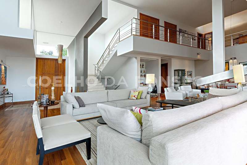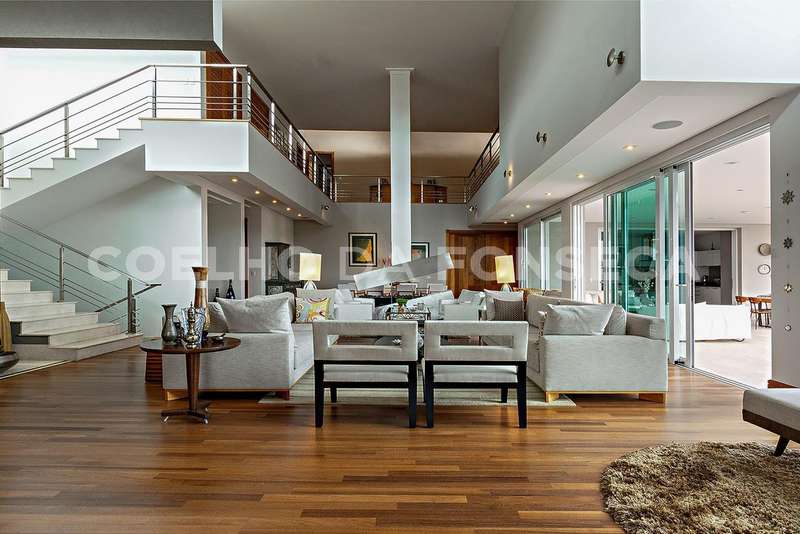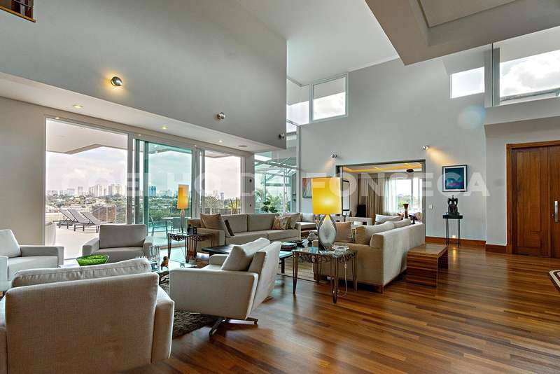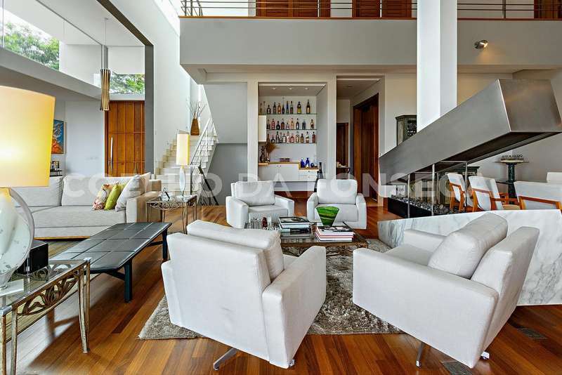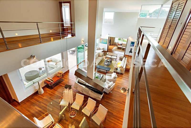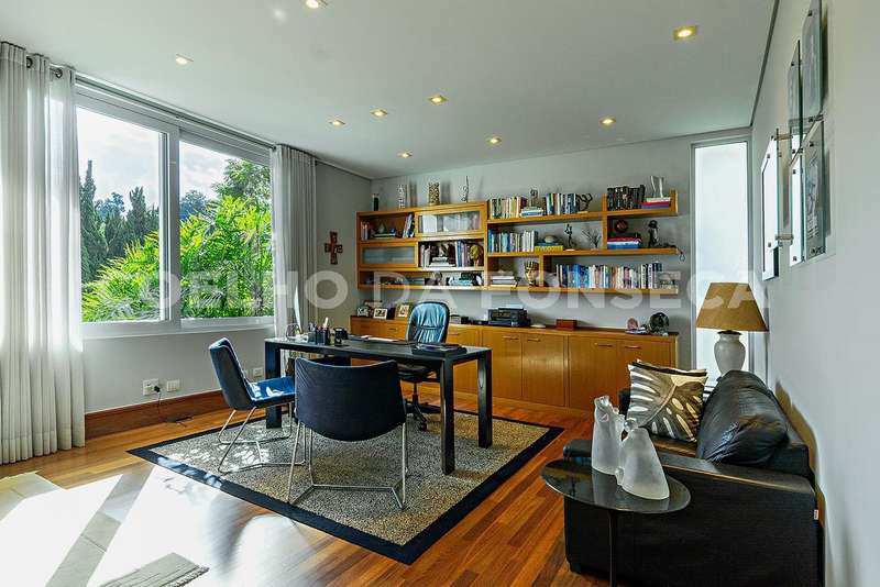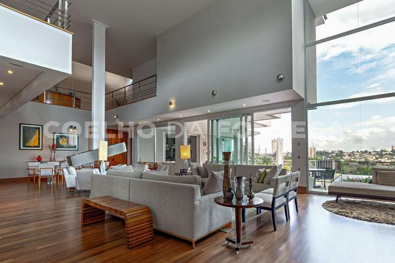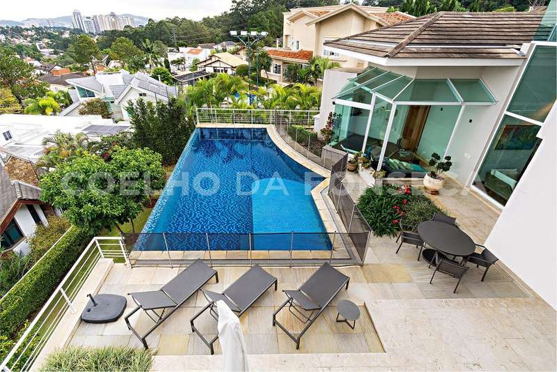 Casa alto padrão, clean, living para vários ambientes, aspiração central, muita luz natural, 4 suites amplas, a master com banheiros sr e sra e 2 closets sr.e sra, 2 escritórios, gourmet integrado, piscina com borda infinita, academia, dependência para motorista, casa de caseirol, garagem para 4 carros cobertos, muitos armários, em excelente localização dentro do condomínio. A casa foi projetada para colocar elevador se nescessário. Pomar, vista expetacular. Estuda permuta até 30% apartamento em Alphaville ou São Paulo. Documentação OK.