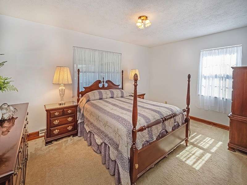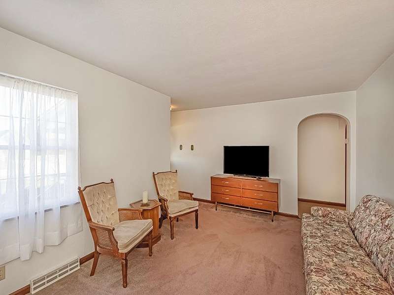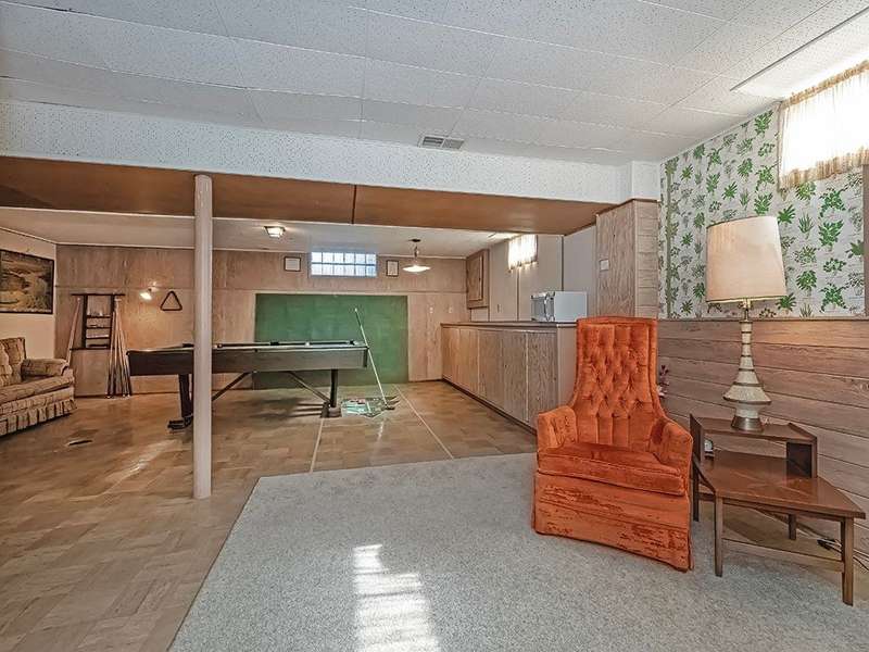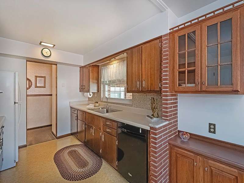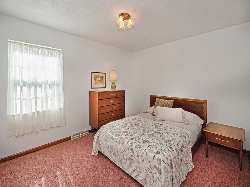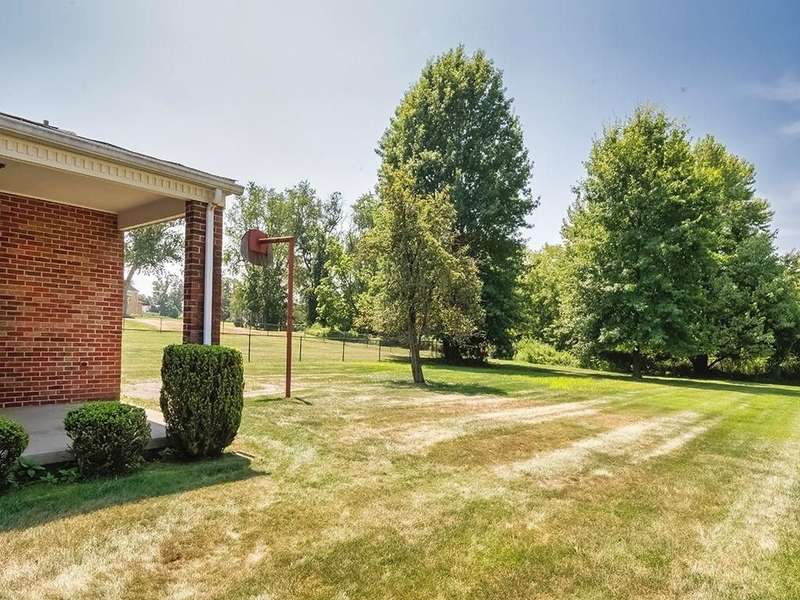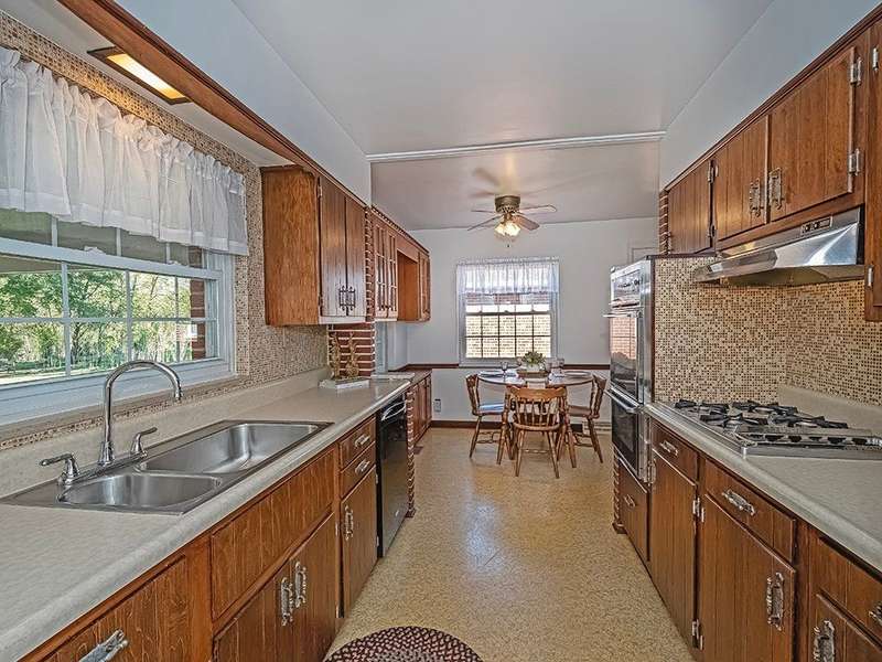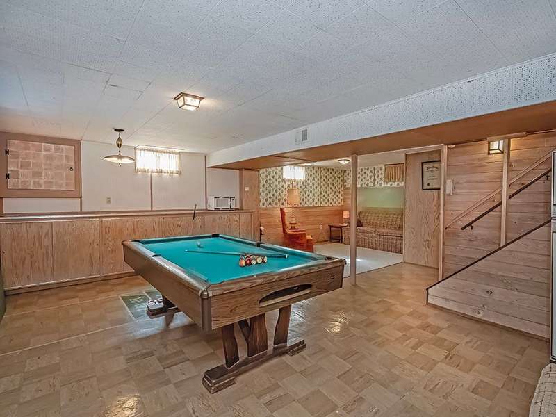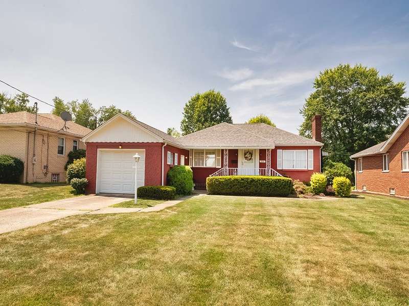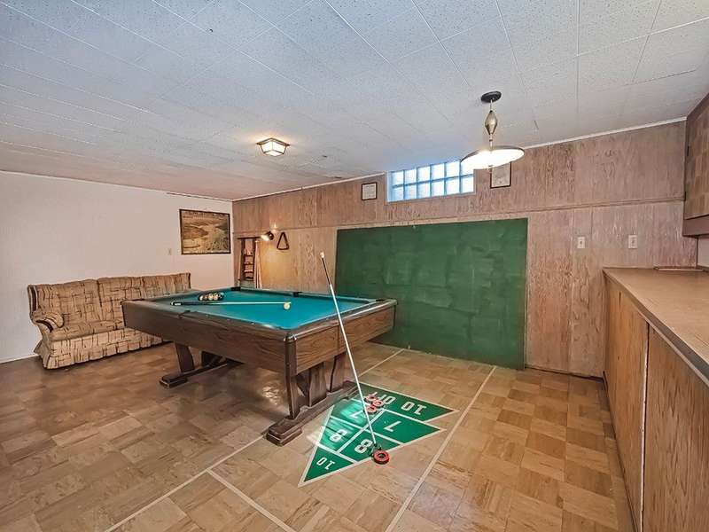 Welcome to this beautifully maintained 4-bedroom, 2-bath ranch that blends comfort, charm, and thoughtful design. The interior has been refreshed with wallpaper removed and walls freshly painted throughout the living room, kitchen, bedrooms, and baths. Gleaming hardwood floors, preserved beneath the carpet, are ready to be uncovered and admired. The galley kitchen features solid wood cabinets and opens into a dining area with seating for six, a charming built-in, and picturesque backyard views. The inviting living room is ideal for relaxing or gathering with friends, while the retro-style lower-level with built-in shuffleboard add a fun, nostalgic twist. All bedrooms are generously sized, and storage is abundant throughout. Two laundry rooms, one on each level, plus a single-car garage make everyday living effortless. Outside, enjoy a lovely covered front porch and a matching expansive patio overlooking a level, park-like lot framed by peaceful woods. Perfect for you to call home!