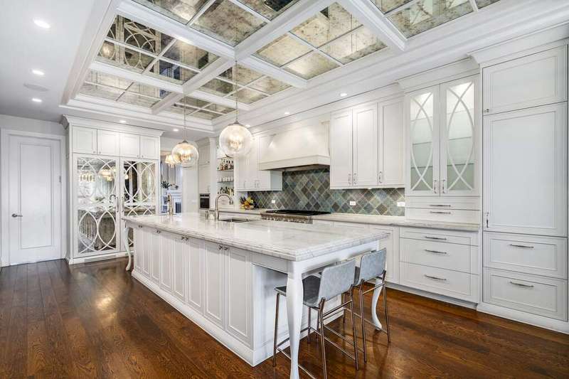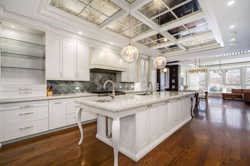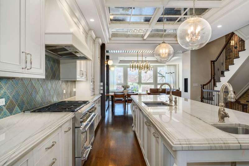 This fabulous home offers an extra wide floorplan and a thoughtful design throughout and is located on one of the most premier blocks of East Lincoln Park. The main living space is located on the second level of the home, allowing for privacy and sensational natural light through large east-facing windows. The luxurious, all white kitchen is adorned with designer finishes with antiqued glass ceilings and custom millwork, quartz countertops, high end appliances, and a huge center island with bar seating, ample storage, and dual sinks. A custom-built banquette/dining area completes this space. A handsome office, complete with a fireplace, den or playroom, and chic powder room complete the main living space. Take the elevator or the grand staircase with exposed brick walls to the first of the two bedroom levels. The third floor of the home offers a large primary suite with dual walk-in closets and a spa like bath with a double vanity, and separate tub and steam shower. Two additional bedrooms complete this floor, along with a nicely appointed hall bath. Two more bedrooms, one that can be used as a secondary primary suite, a hall bath, as well as an office or nursey with access to a covered terrace are found on the fourth floor. A rooftop terrace that spans the length of the home offers the best 360 views of the city and neighborhood. A penthouse level powder room plus elevator access make for easy entertaining on the rooftop. The entry level allows for a gracious mudroom with ample storage, sauna, and a media room that opens onto the back patio. There is an additional garage sized storage room located directly off of the mudroom. Perfectly located near Oz Park, and an easy walk to Lincoln Schools, the lake, zoo, and fabulous neighborhood dining!