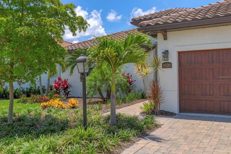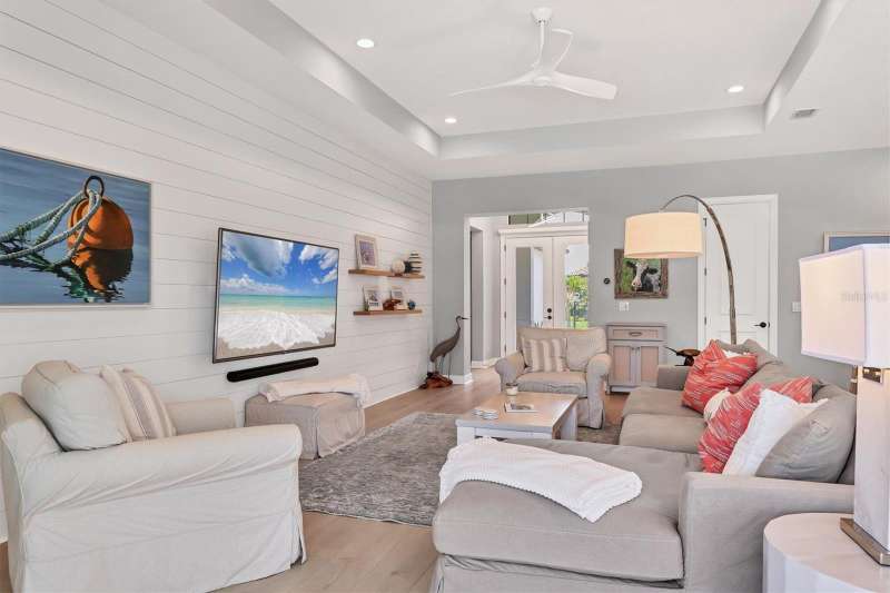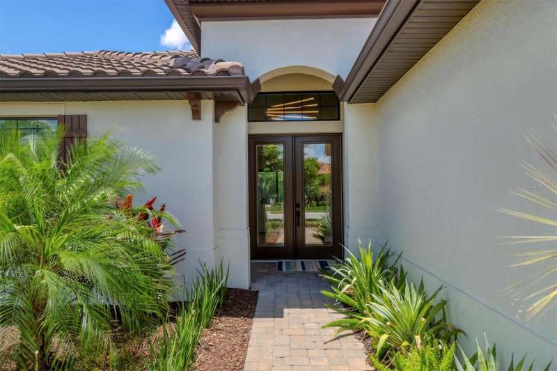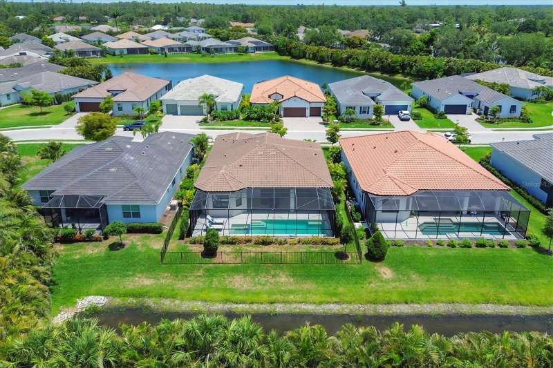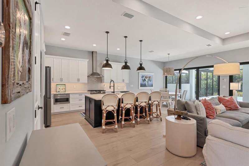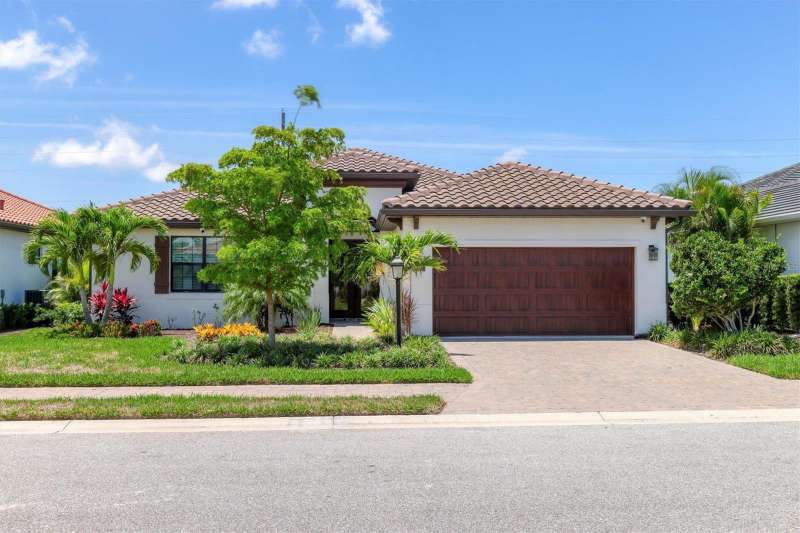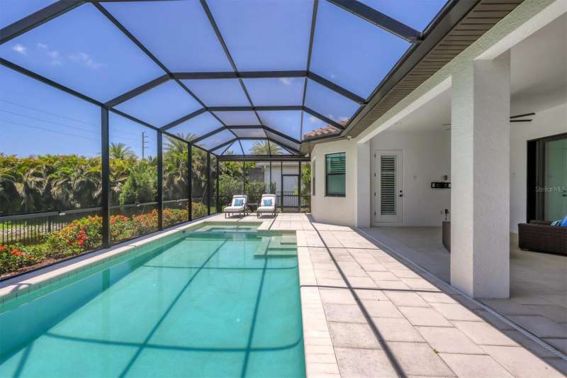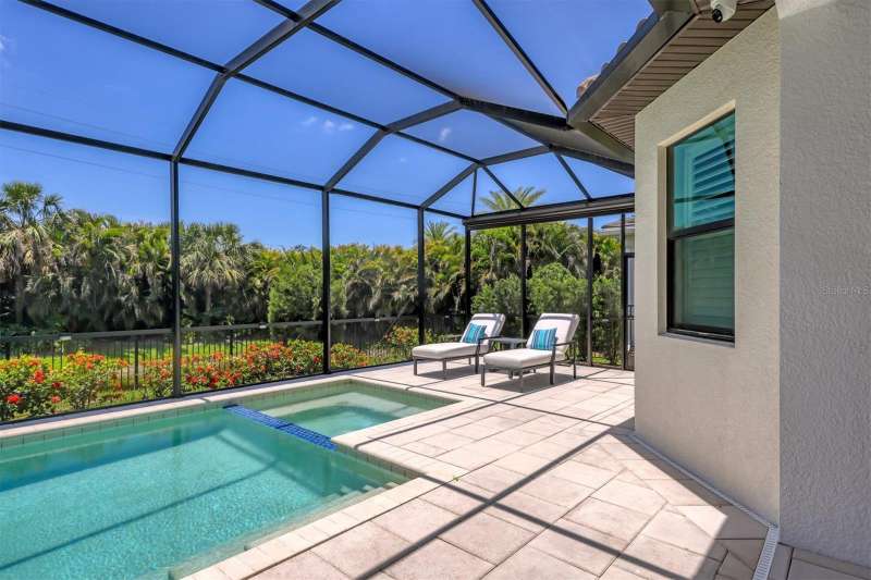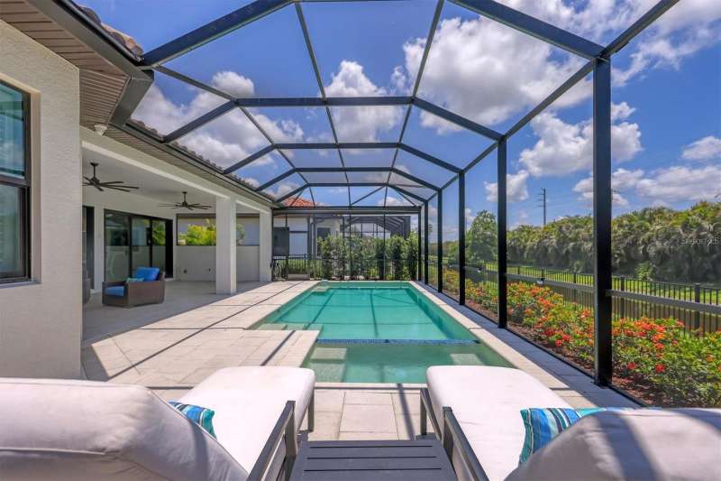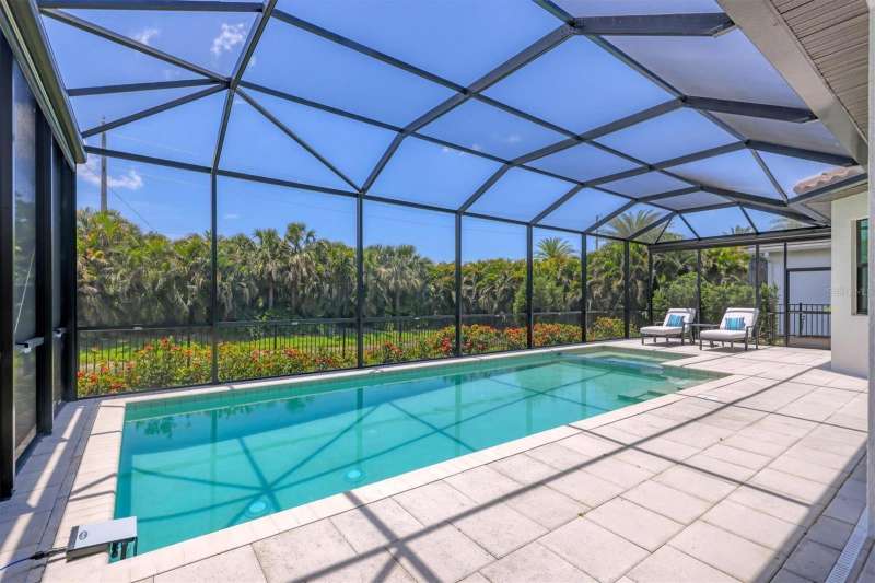 Price improvement. Heritage Builders, the finest custom home builder in Sarasota, created this stylish enclave in 2022. This home exemplifies modern coastal elegance. Offering over 2,150 square feet of impeccably designed living space blending sophistication with everyday comfort. Enter through grand double glass doors into a foyer with soaring ceilings, dramatically lit by a designer LED chandelier. The floors are covered in Wide Plank Luxury Laminate throughout the main living areas and tile in the bathrooms. The expansive gathering room makes a striking impression with its feature wall opening seamlessly to the covered lanai, creating an ideal space for entertaining. The chef inspired gourmet kitchen is a dream for anyone looking for a natural gas range, stainless steel appliances, crisp white cabinetry, a bold navy island, and quartz countertops, it’s both functional and visually striking. The oversized island comfortably seats four and flows effortlessly into the dining area, living space, and out to the lanai through sliding glass doors, offering a seamless indoor-outdoor lifestyle. The spacious primary suite provides a peaceful retreat, a custom walk-in closet with wood shelving, and a luxurious ensuite bath featuring a double vanity. The home’s smart split floor plan ensures privacy, with two additional guest bedrooms—one with its own ensuite bath and walk-in shower, and the other conveniently located near a full bath with a tub/shower combination. Practical features include a dedicated laundry room with a utility sink and ample storage, along with a two-car garage finished with epoxy-coated floors. Outdoors, enjoy your own private sanctuary featuring a resort-style pool and spa, generous deck space for lounging, and a covered lanai perfect for al fresco dining. Motorized privacy screens provide added comfort, while the fenced-in yard is ideal for pets or play. Located in the gated enclave of Sandhill Lake, home to just over 40 residences, you'll appreciate the warm, close-knit community feel along with amenities such as a community pool and clubhouse. All of this is just minutes from Sarasota’s premier shopping, dining, parks, and the world-renowned Siesta Key Beach. Call to schedule a private showing.