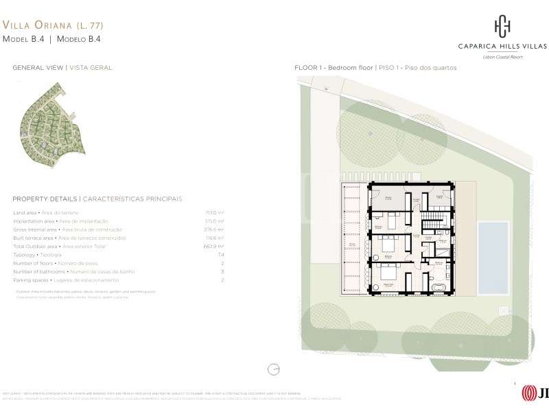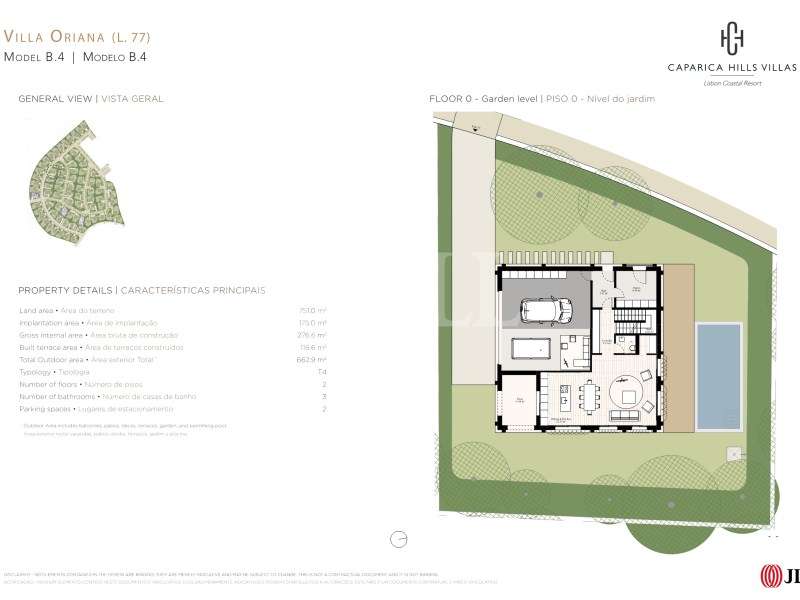 Moradia T4 nova com 277 m2 de área bruta de construção, jardim e piscina privativos, no Caparica Hills Villas, na Costa da Caparica. As unidades do Caparica Hills Villas oferecem garagem privativa, elevador, amplas zonas de lazer e espaços de arrumação. A construção incorpora elementos sustentáveis como painéis de madeira, coberturas ajardinadas e vegetação local, garantindo eficiência energética e conforto durante todo o ano. O empreendimento integra-se num resort completo que inclui o Hotel IHG Crowne Plaza Caparica Lisbon, instalações de bem-estar com spa, fitness club e estúdio de yoga, um campo de golfe de 9 buracos e uma zona comercial com 20 lojas boutique. Nos planos futuros estão previstos um centro desportivo e uma escola. A localização do Caparica Hills Villas combina tranquilidade e conveniência: a 5 minutos do mar, a 15 km do centro de Lisboa (15 minutos de carro) e próximo do aeroporto principal. Para compras diárias, o supermercado encontra-se nas imediações. O Caparica Hills Villas representa uma proposta de valor equilibrada para quem procura um investimento imobiliário ou residência numa das zonas de maior potencial de valorização da Grande Lisboa, conjugando proximidade à capital com a qualidade de vida junto ao mar. Categoria Energética: A #ref:90872