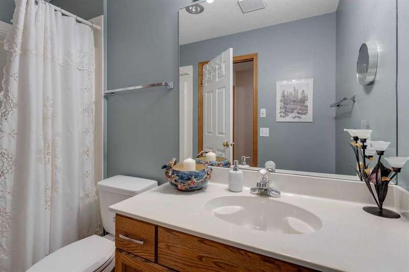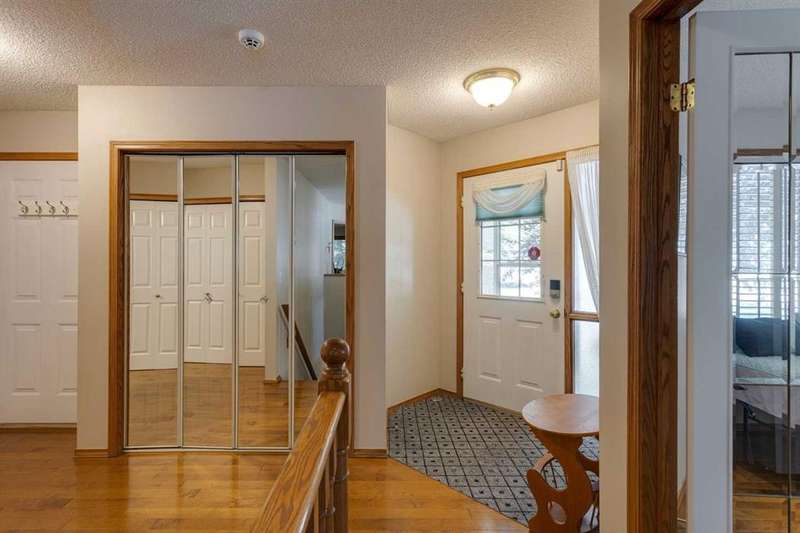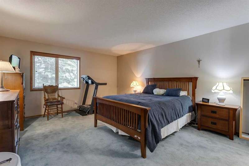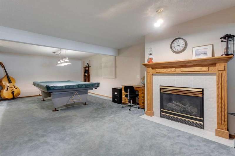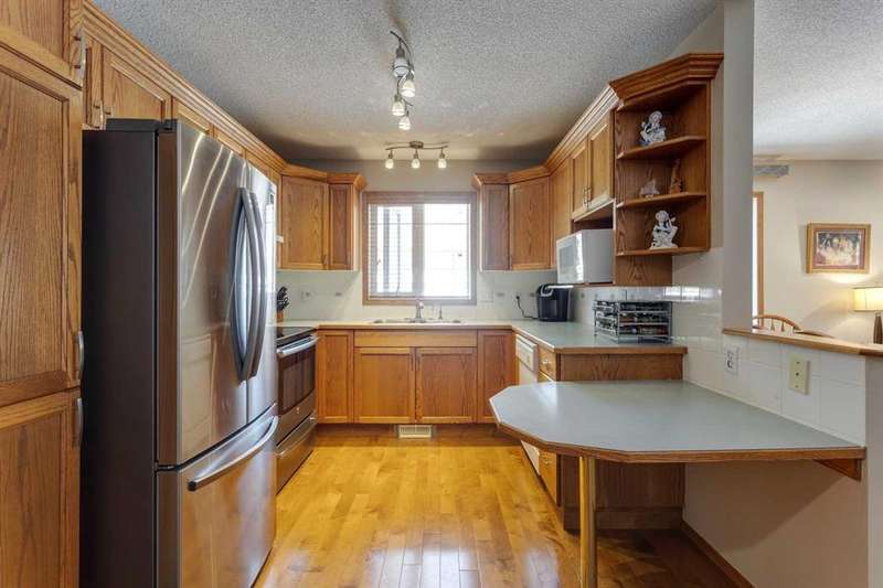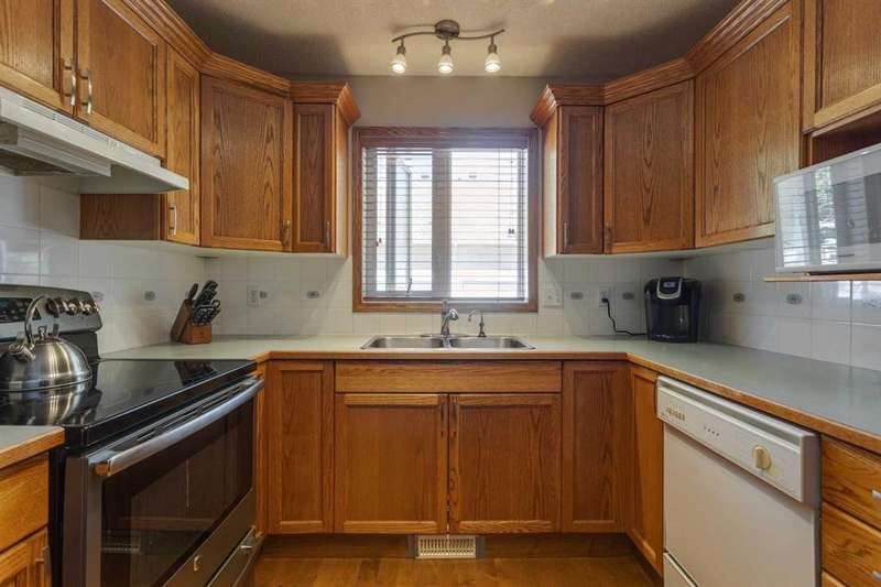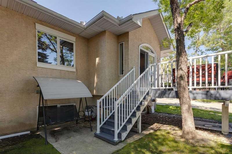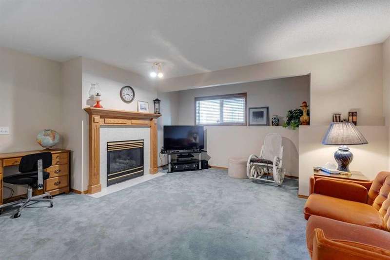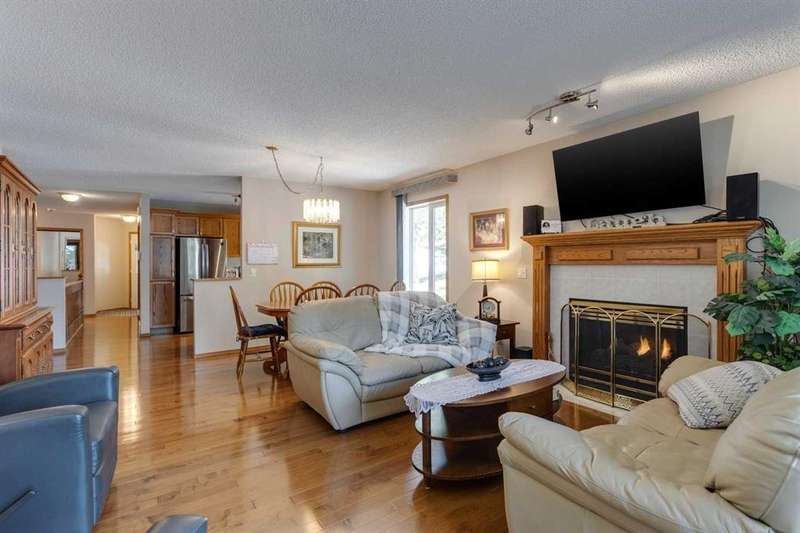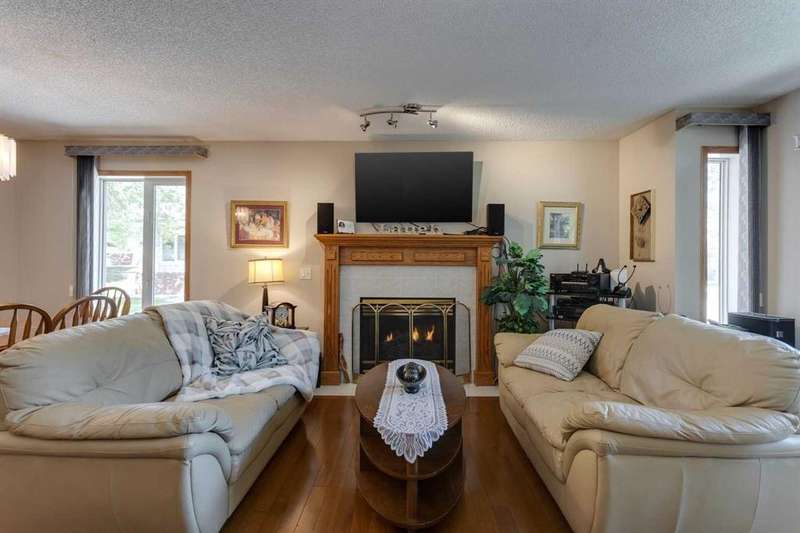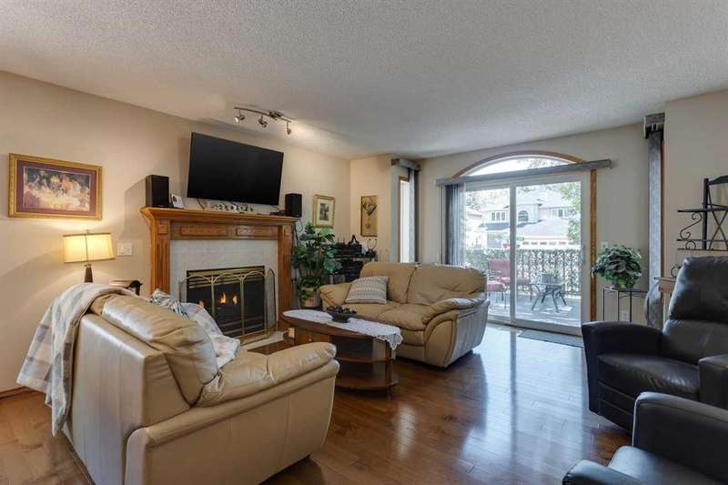 Villas in this sought-after community rarely come available—and this one is a gem. Nestled in a peaceful neighborhood near scenic walking paths, parks, and a tranquil pond, this beautifully maintained bungalow villa offers a seamless blend of comfort, convenience, and thoughtful updates. Step through elegant double glass French doors into the main floor den, bathed in sunshine from its west-facing bay windows—ideal for a home office, reading nook, or guest space. The kitchen exudes warmth with oak cabinetry, stainless steel appliances, a crisp white tile backsplash, and a built-in breakfast table. The adjacent dining area flows effortlessly into the cozy living room, complete with a gas fireplace and access to an expanded back deck—perfect for relaxing afternoons in the sun. Throughout the main level, you’ll find stunning newer maple hardwood floors and freshly painted walls in timeless neutral tones. The spacious primary suite features a walk-in closet and a luxurious 3-piece ensuite with a jetted tub. A full main-floor bath is perfectly situated for guests using the den, and main-floor laundry adds everyday ease. The fully finished basement offers a generous recreation room with a second gas fireplace, a large second bedroom with walk-in closet, a full bath, and ample storage. Recent upgrades include newer shingles, toilets, hardwood flooring, fridge, washer, dryer, and garage doors. With central A/C, a double attached garage, and close proximity to shopping, transit, the airport, and nature trails—this home delivers the best of low-maintenance villa living.