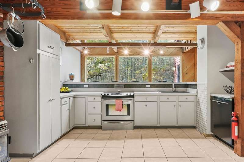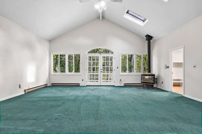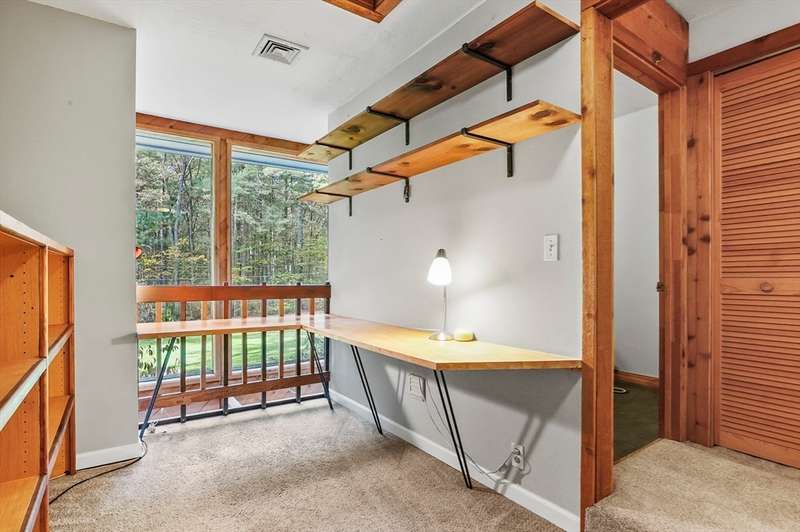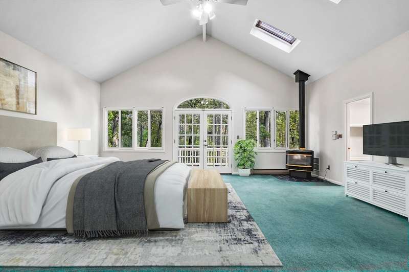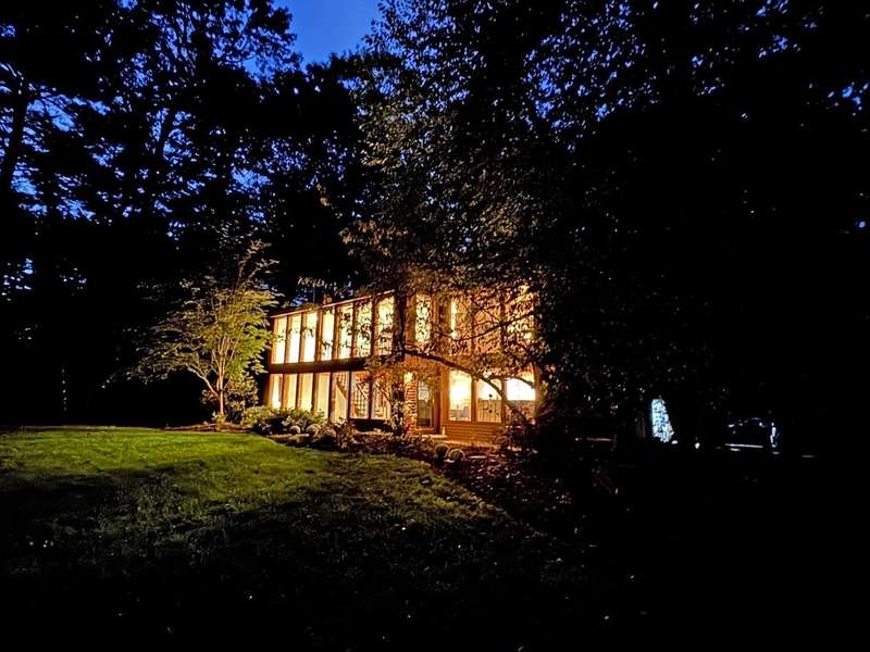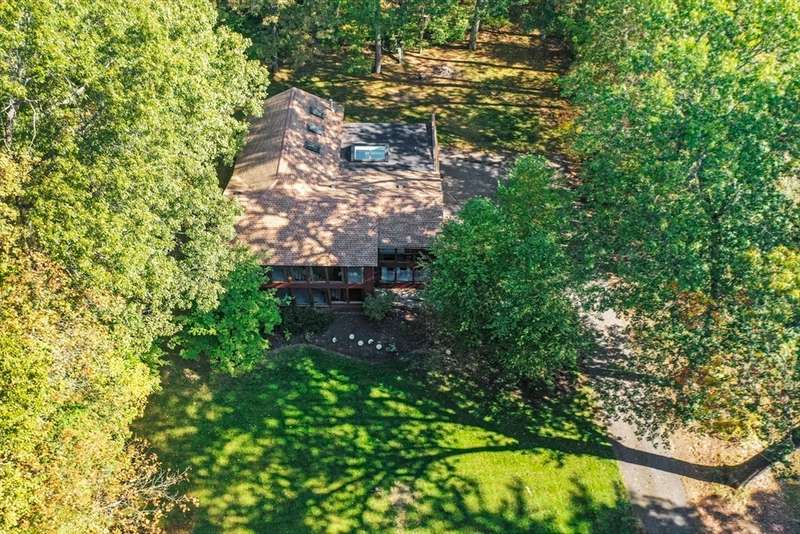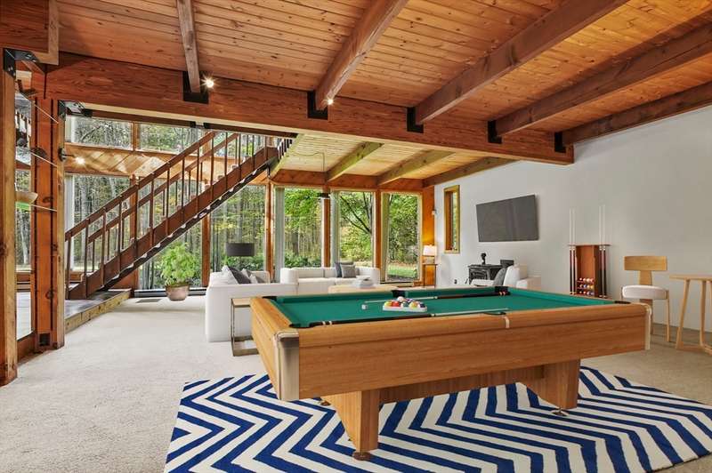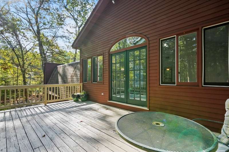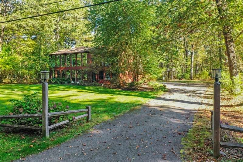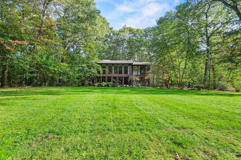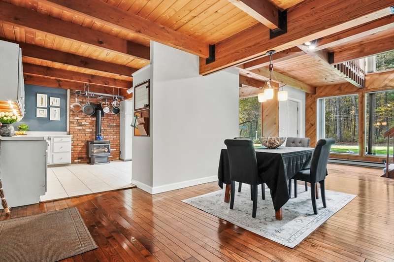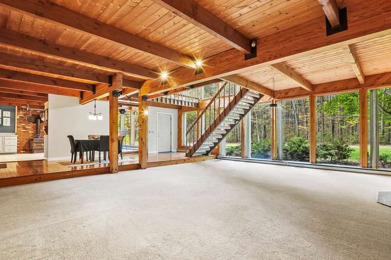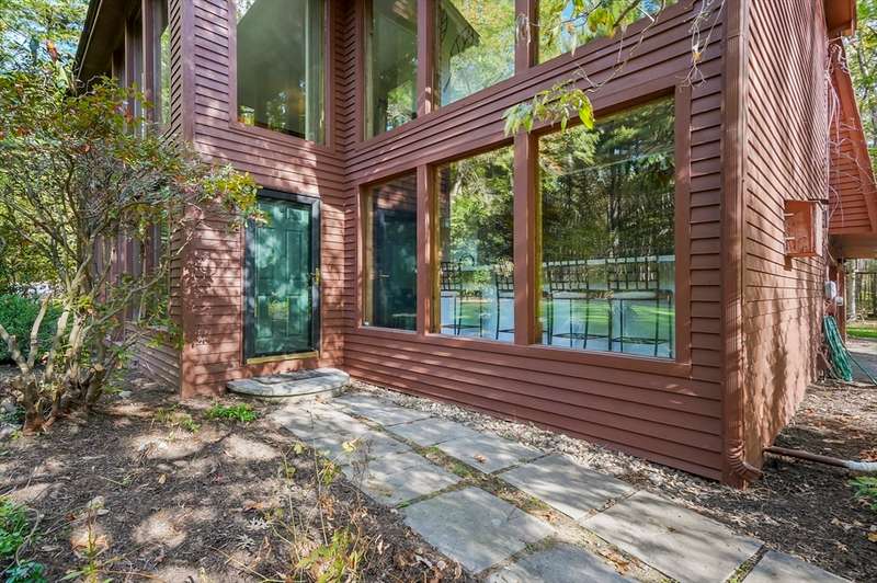 Wrapped in privacy, this stunning contemporary, beautifully set on nearly an acre abutting the state forest awaits! With 3,664 sq. ft. of living space, this home is designed to capture its natural surroundings. Soaring windows on both levels offer serene wooded views. 1st floor features a spacious living room w/ dramatic windows & exposed beams, wood stove, dining room, and well-appointed kitchen with gas stove, abundant cabinetry and seating for 6 at the breakfast bar. 2 bedrooms & a full bath complete the main level. Upstairs, the expansive family room provides space for multiple sitting areas & has a wall of windows. The 2nd floor office offers flexibility - large enough for a guest room too. The primary suite is a retreat of its own, featuring a private deck, cozy gas stove, oversized walk-in closet, & luxurious bath with a walk-in shower, dbl vanity, & generous storage. Add’l highlights include a 2-car garage w/ storage space, a rear patio, & tranquil wooded views from every room!
