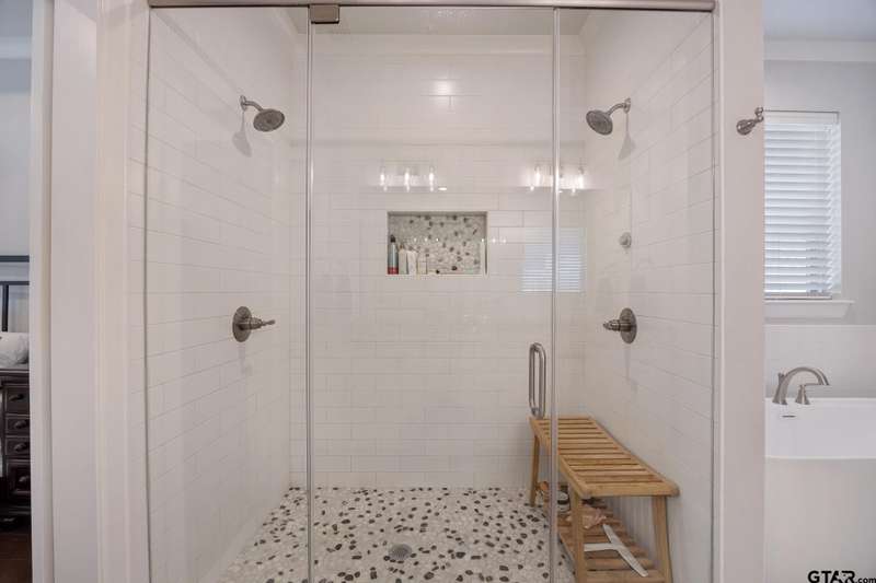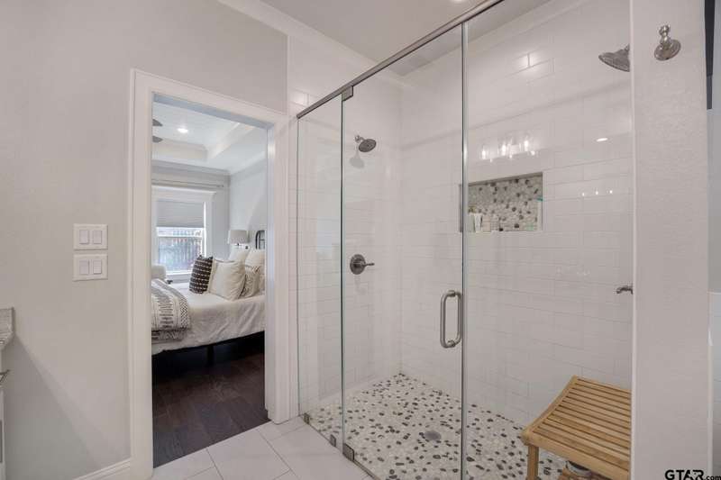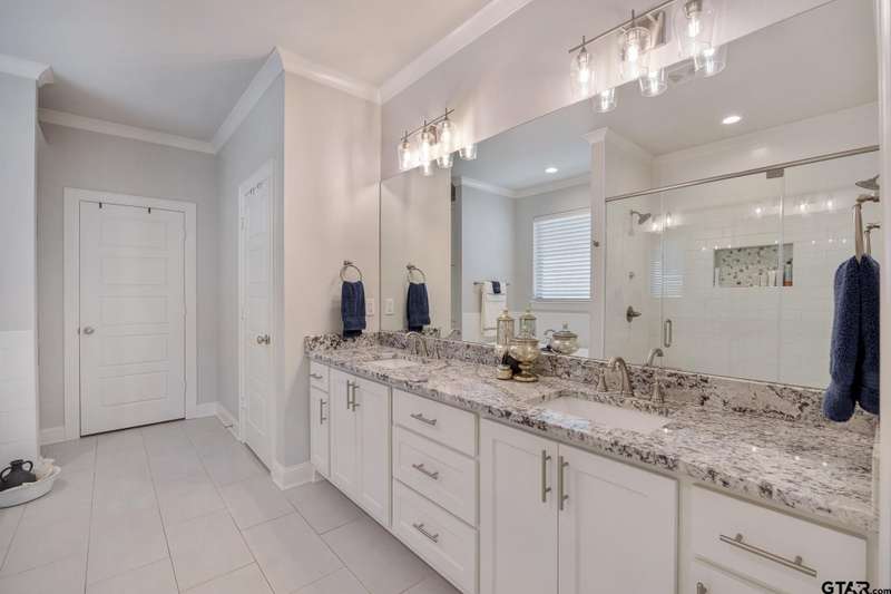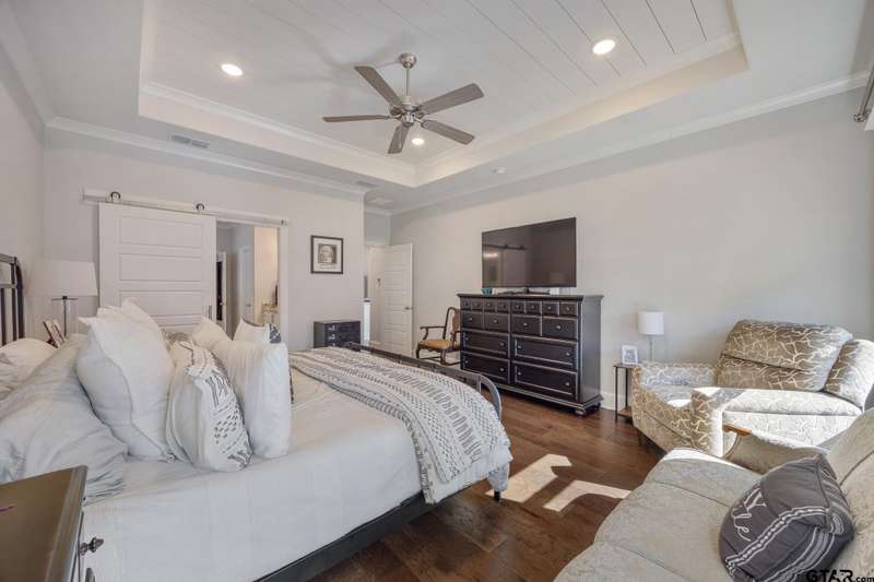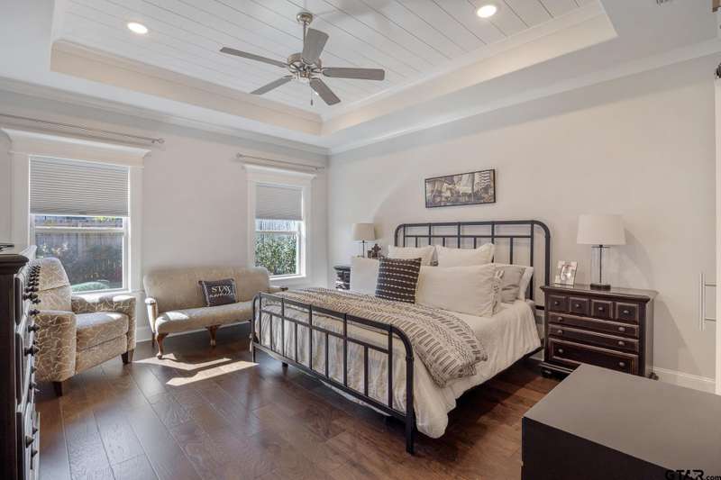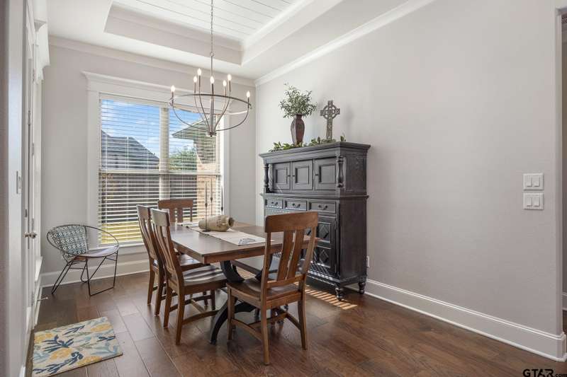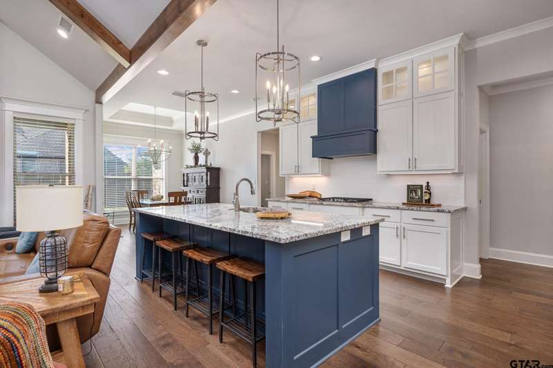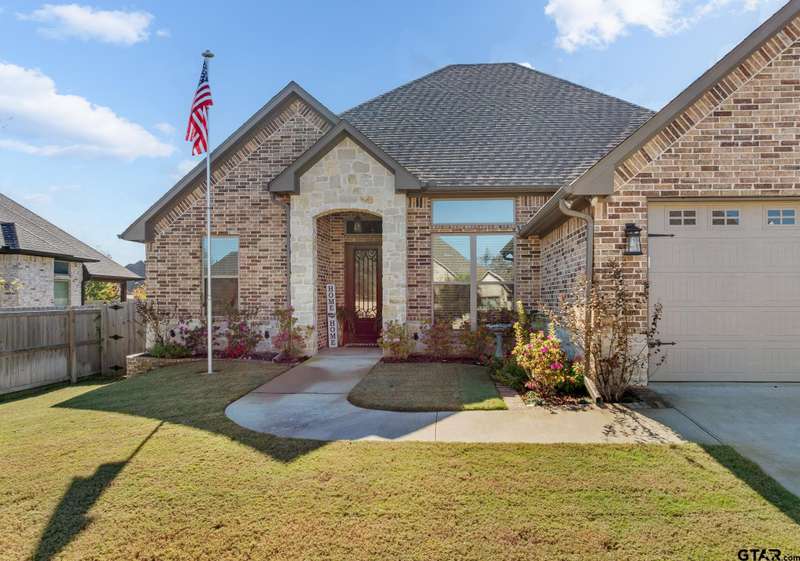 Don't miss this stunning home featuring an open-concept layout and a striking stone fireplace as the centerpiece of the living area. Vaulted ceilings with wood beams, abundant natural light, and thoughtful architectural details create an inviting atmosphere. The kitchen offers a pop of color, under-cabinet and display lighting, plenty of counter space and a spacious walk-in pantry and drop zone nearby for convenience. The primary suite is a true retreat, showcasing wood floors, a shiplap tray ceiling, and a barn door leading to the luxurious en suite with double sinks, a double shower, and a soaking tub. Step outside to a beautifully landscaped backyard oasis with a covered patio and an array of fruit trees and plantings, including blueberries, blackberries, peaches, grapes, pomegranates, figs, and olives. Located in Oak Creek with access to scenic trails and Tyler Athletic & Swim'offering pickleball, tennis, swimming, and fitness facilities'this home perfectly blends comfort, style, and community living.