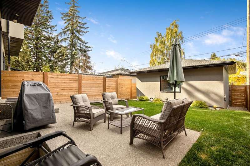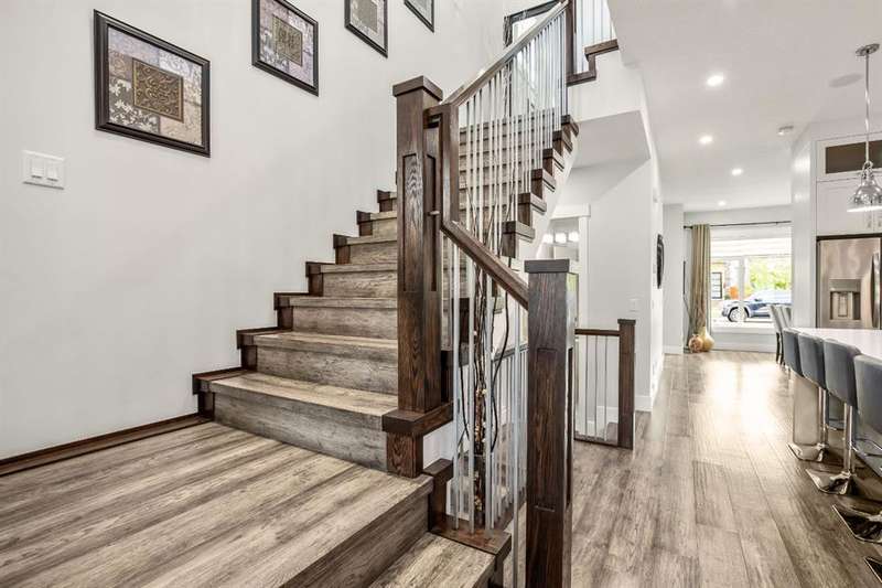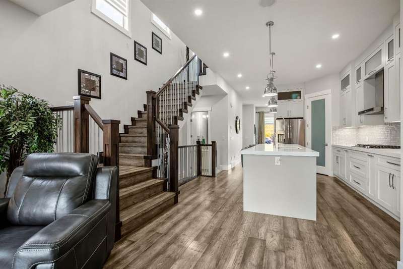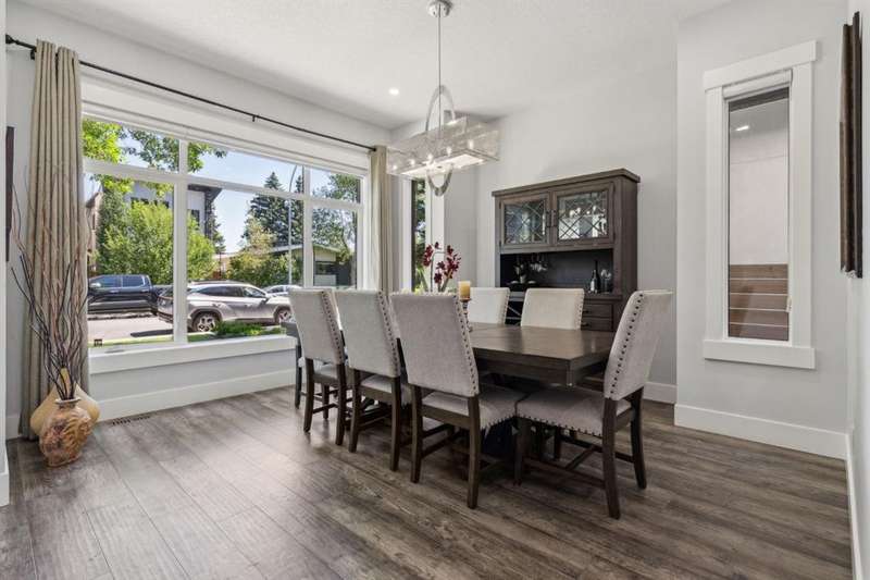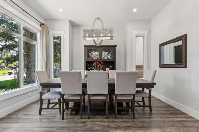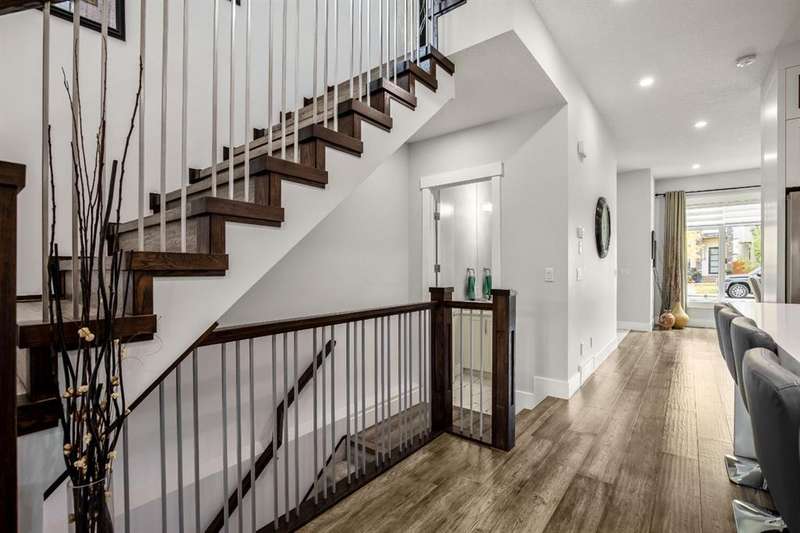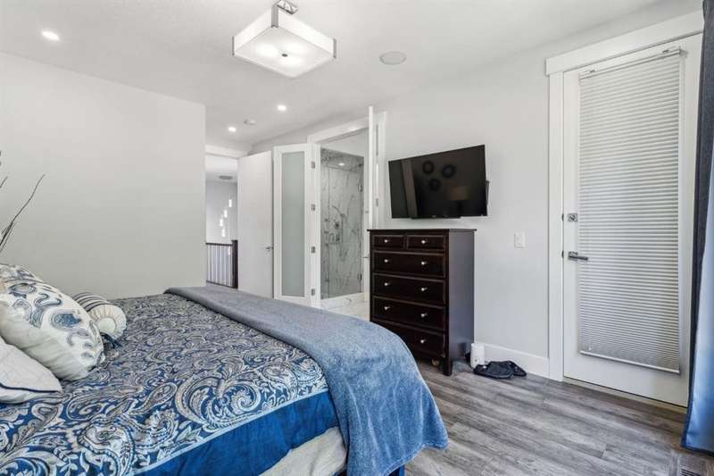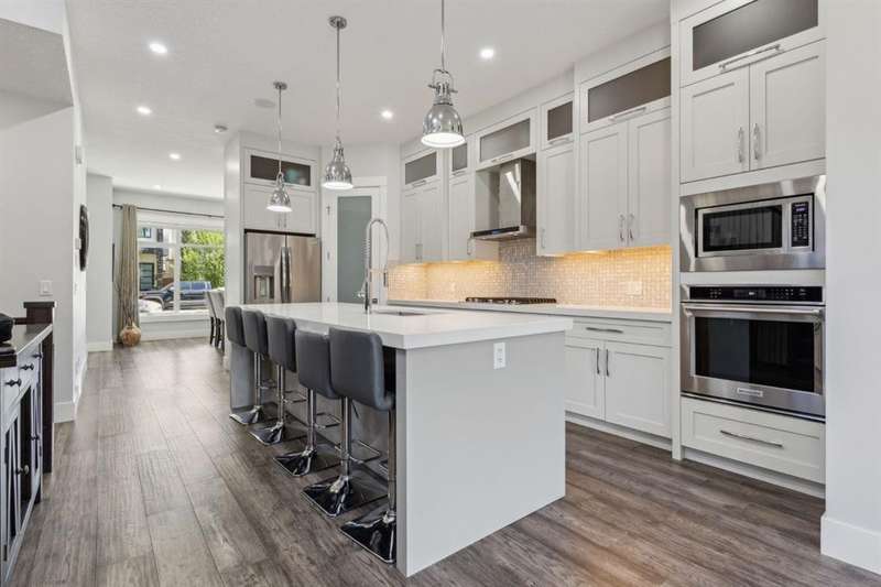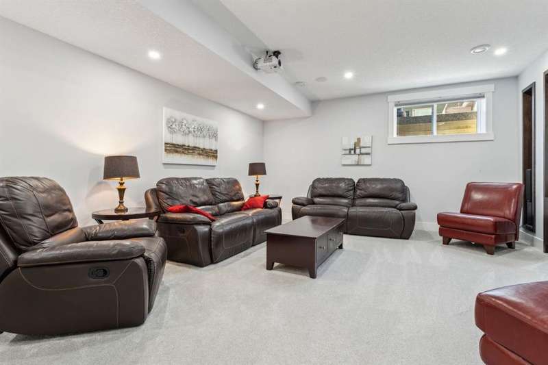 Boasting over 3,300 developed sq ft this impeccable DETACHED home is situated on a quiet picturesque, tree-lined street. As you approach you will notice the masterfully crafted curb appeal, exposed aggregate walkway and attention to detail. You are then greeted by soaring 10-foot ceilings, gleaming hardwood floors and a bright dining room. The central gourmet kitchen is a focal point with custom cabinets that reach to the ceiling, including pull outs and glass inserts, gorgeous 2 ¼” Quartz counters, under cabinet lights, plenty of storage with a corner pantry, and high-end SS appliances including a gas cooktop, built-in wall oven/microwave, chimney style hood fan and Bosh dishwasher. The expansive 10 ft island is ideal for entertaining and seamlessly connects to the spacious living room. The spacious living area is showcases a gas fireplace with stone surround and a built in detail. The main is complete with the powder room tucked away for privacy and a well thought out mud room with custom built-ins. The private well sized SUNNY WEST backyard has plenty of grass, an exposed aggregate patio and path plus a convenient BBQ gas line. Making it the perfect place to enjoy the outdoors. As you head to the second level you will notice the elegant railing, and 9’ ceilings. There are 2 well sized bedrooms with walk-in closets including custom built-ins, a nicely appointed 4 piece bath, and a convenient upper laundry room with sink and plenty of cabinets for storage. The primary is a true sanctuary with large windows, a private balcony to enjoy morning coffees, and a big walk-in closet with built-ins. French doors lead to your luxurious ensuite. This spa inspired space includes heated tile floors, a steam shower, freestanding tub, a private water closet, dual sinks and comfort height stone counters. The fully developed lower level with in SLAB HEAT, is fabulous for those Alberta winters. There is a large rec room showcasing a projector and 100 inch screen with custom cabinetry, perfect for movie night or your favorite sporting events. This space is complete with a sleek wet bar including beverage fridge. An additional fourth bedroom with walk in closet and a full 4-piece bathroom. Other noteworthy features are the Double detached garage with 220 wiring, the comforts of air conditioning, upgraded solid core doors, flush mount vents, built in speaker system, security cameras, upgraded roof with full ice and water shield membrane, upgraded roof ventilation and added R50 blown insulation creating energy efficiencies. Just minutes from excellent schools, athletic fields, and Westhills Shopping Centre, including Save-On-Foods, GoodLife Fitness, Cineplex, The Keg, Tim Hortons, and much more. Enjoy quick access to Stoney Trail, Sarcee Trail, and downtown. Don’t miss your chance to own this pristine home. View the virtual tour or book your private showing today!