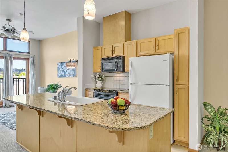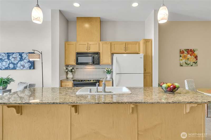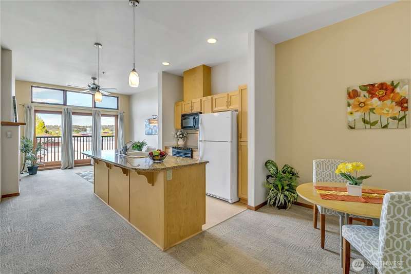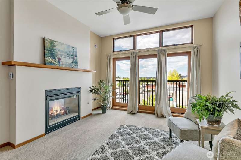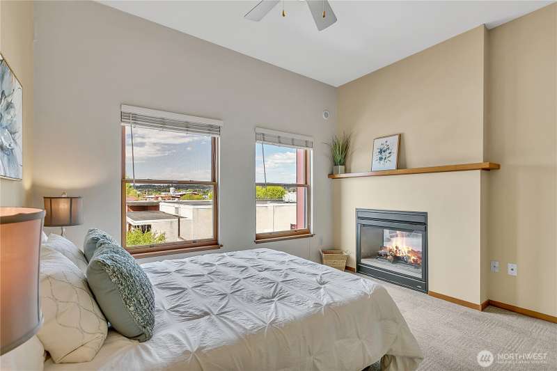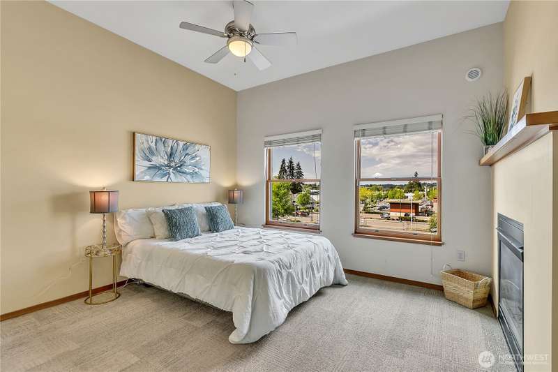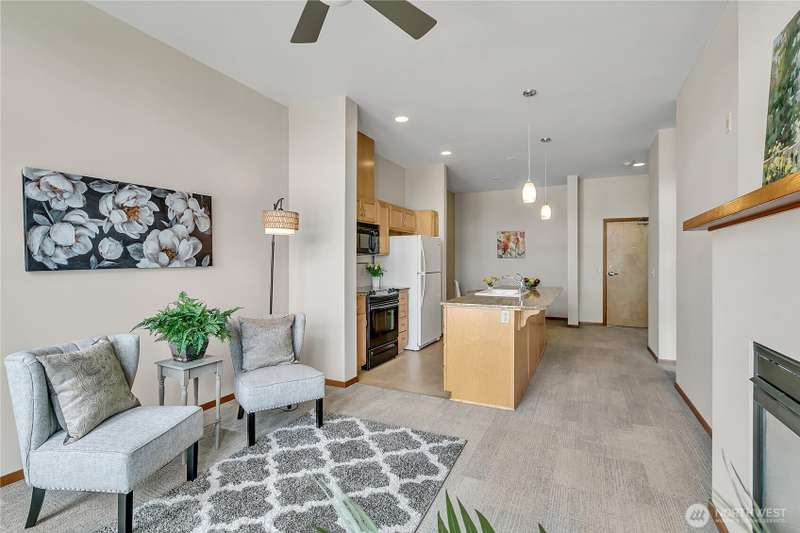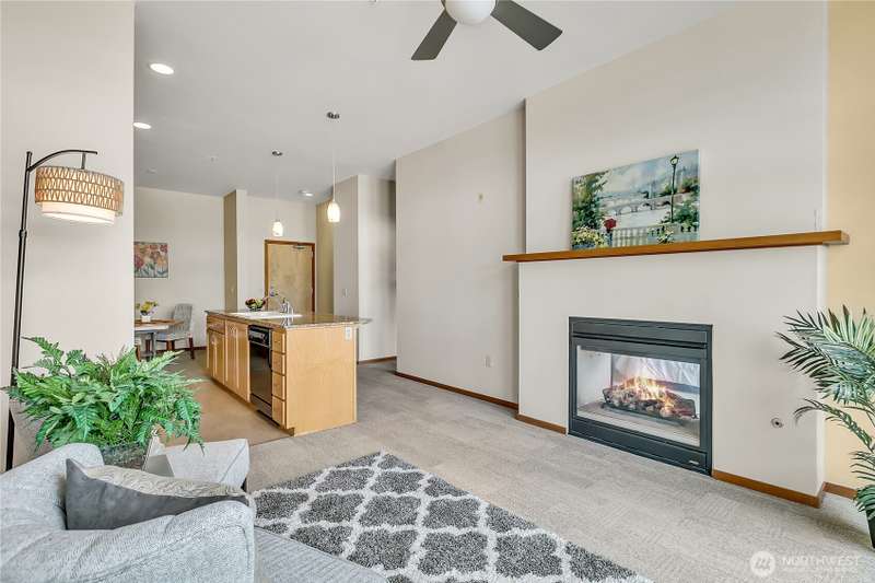 Modern living in the heart of downtown Puyallup! This one-bedroom, one-bath condo with den features a spacious layout, soaring ceilings & abundance of natural light. Two ceiling fans, and a see-through fireplace shared by the living room and primary bedroom. The kitchen boasts a large island with granite countertops & plenty of cabinets. There’s a stackable washer and dryer in-unit for added convenience. New bathroom flooring & sink faucet. Newer hot water tank. Enjoy secured, gated parking, elevator access, and a rooftop barbecue area. Located just steps from the library, parks, coffee shops, restaurants, fairgrounds, sounder train and the seasonal farmers market—this home offers comfort, style, and unbeatable walkability. A must see!