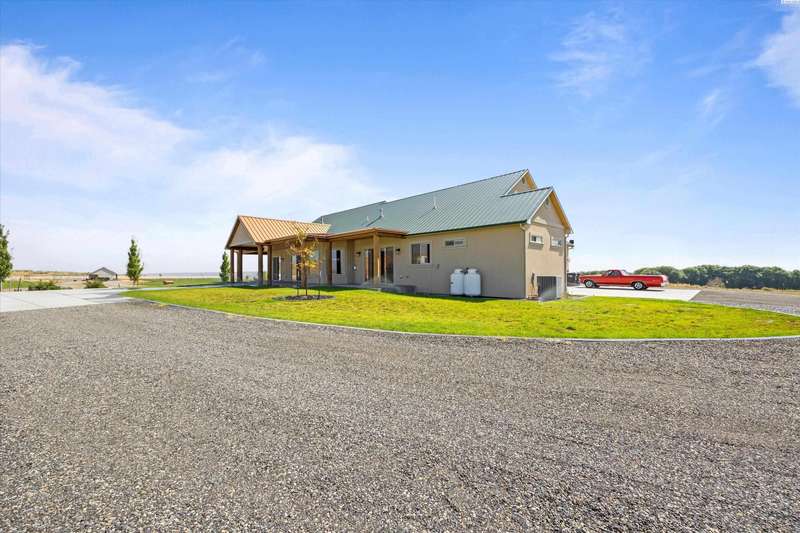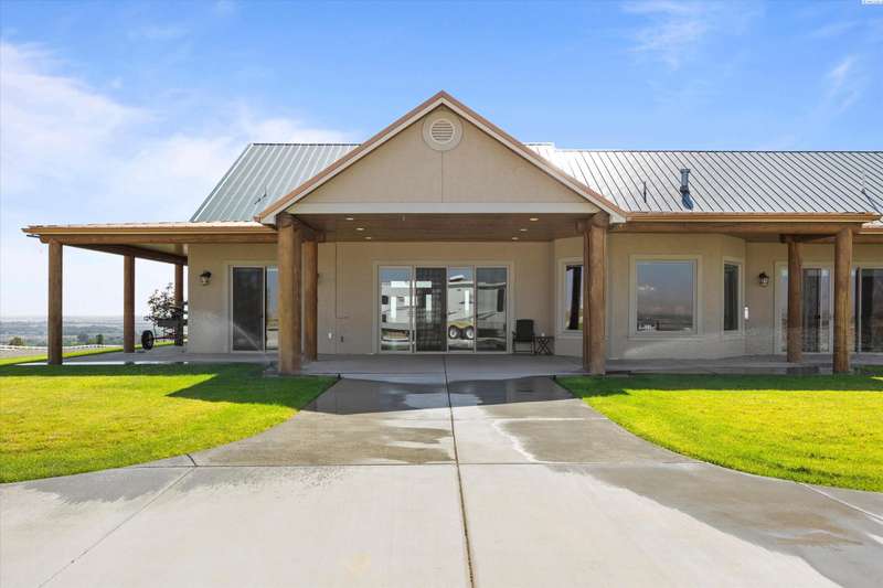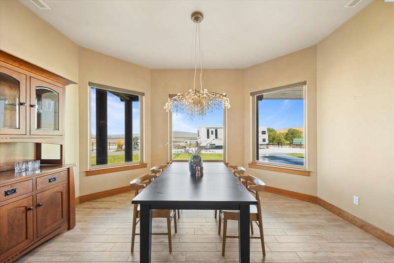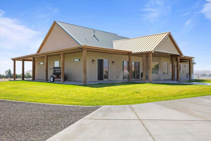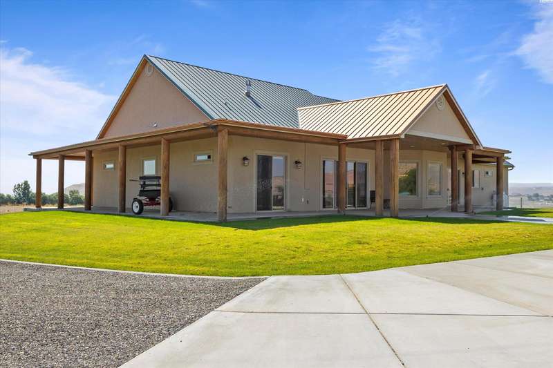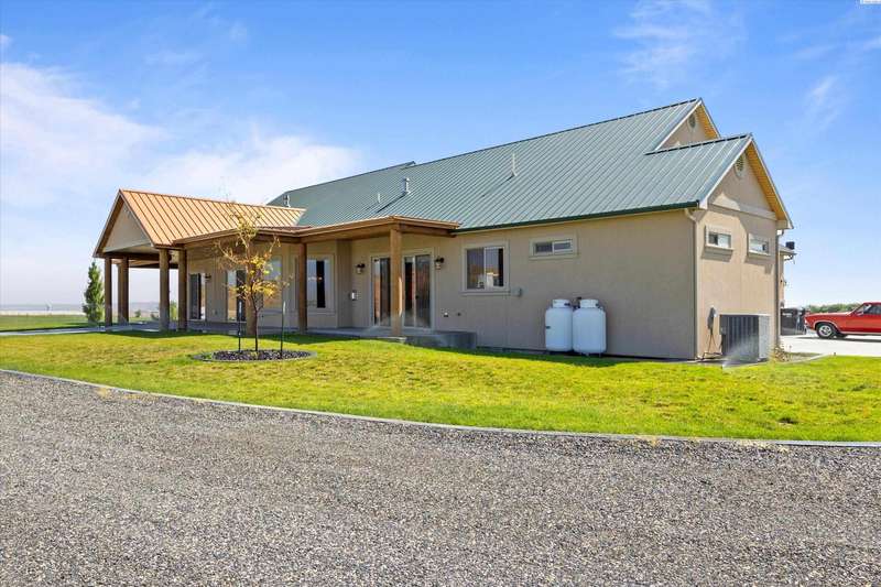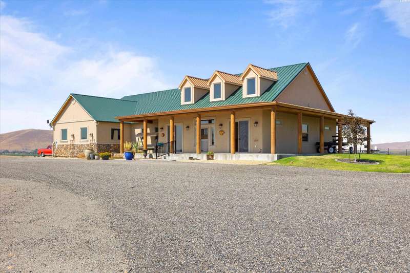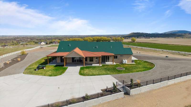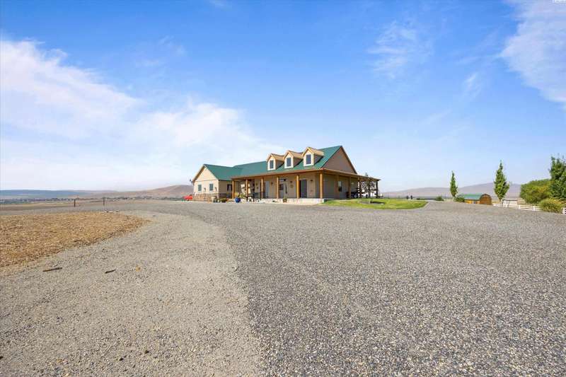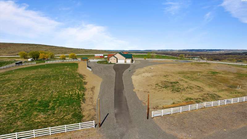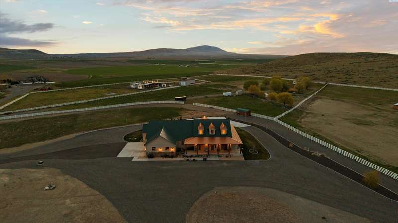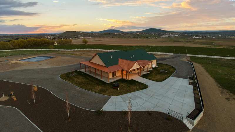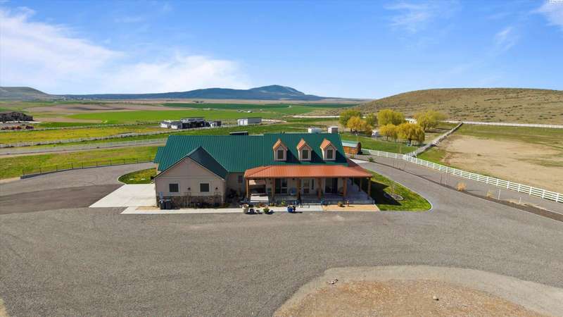 MLS# 286524 This beautiful 2,860 sq ft home sits on 9.22 acres, fully enclosed with classic white vinyl fencing, and offers breathtaking territorial and mountain views. Built in 2016, the home features an open-concept layout with tile floors, a cozy fireplace, and large windows that flood the space with natural light. The gourmet kitchen boasts granite countertops, stainless steel appliances, and a spacious island—perfect for entertaining. The primary suite includes a luxurious en-suite bath with a soaking tub and walk-in shower. Step outside to enjoy a covered patio, ideal for relaxing or watching the sunset over your acreage. Ample space for horses, livestock, gardens, or additional outbuildings, with room to make it your own. Located in the desirable West Richland area, this property combines country living with easy access to local amenities.