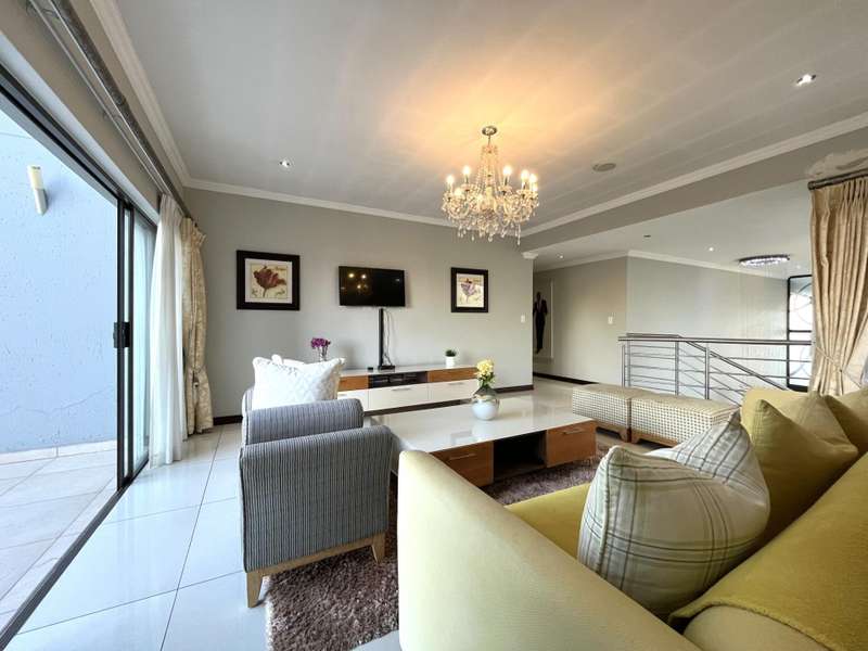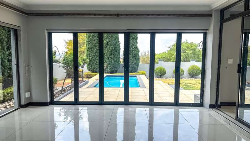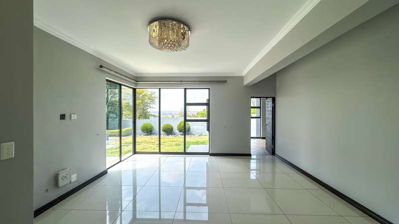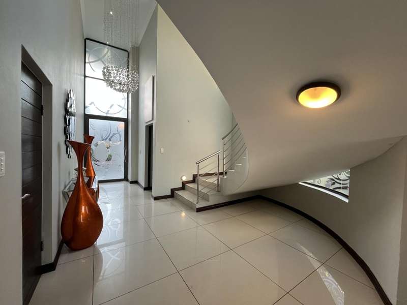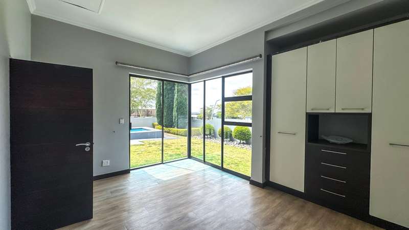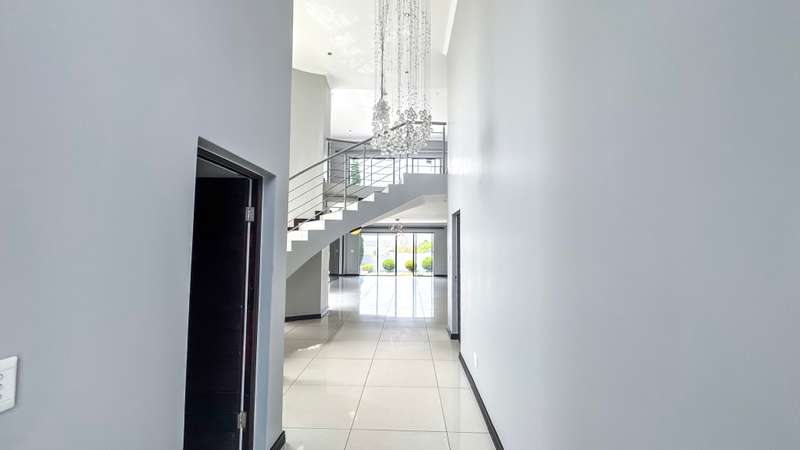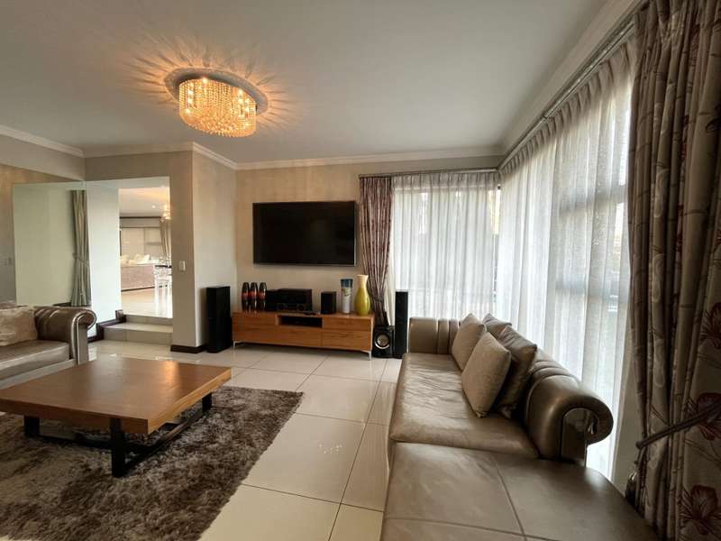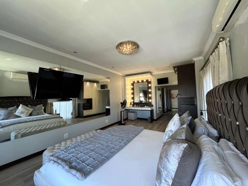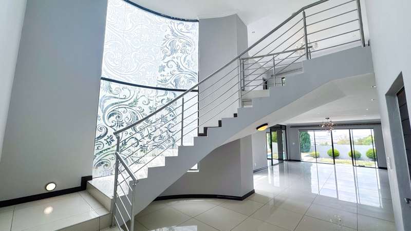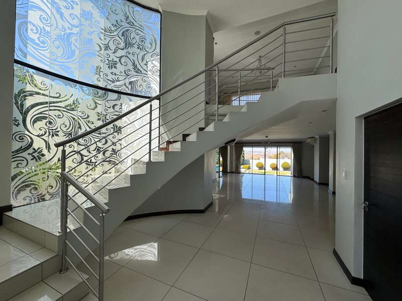 Welcome to this spacious and 6 bed house in popular Midlands Estate. As you enter the double volume entrance, kitchen with a huge Island on your right. The Kitchen has build in Smeg Appliances including a Coffee Machine, there is also a build in Fridge and Freezer. The open plan living and dining area are next to the kitchen. There is another lounge in the ground floor which is connected to a separate bedroom with en-suite and there is another bedroom with en-suite on the left wing of the house. The enclosed Patio is next to the main living room. First Floor: As you climb up the stairs you enter an open Pijama Lounge and 3 en-suited bedrooms. The main bedroom with own en-suite has large bathroom and plenty cupboards. The large landscaped garden with a sparkling for entertainment looking over the park. Features Include: Integrated Kitchen appliances (Fridge, Freezer, Coffee Machine) 2 Ovens Aircon Units in Main bedroom and living /entertainment area Inverter System - 5KW Sunsynk Lithium Batteries 5.5KW Scenic View Living Areas: 4 Study: Yes of Sixth Bedroom Servants Quarters: Yes with fully equipped Bathroom Pool: Yes Transfer Costs: Transfer Duty Area: Midlands Patio: Enclosed with stack doors This house offers more per square meter. Contact me to view today.